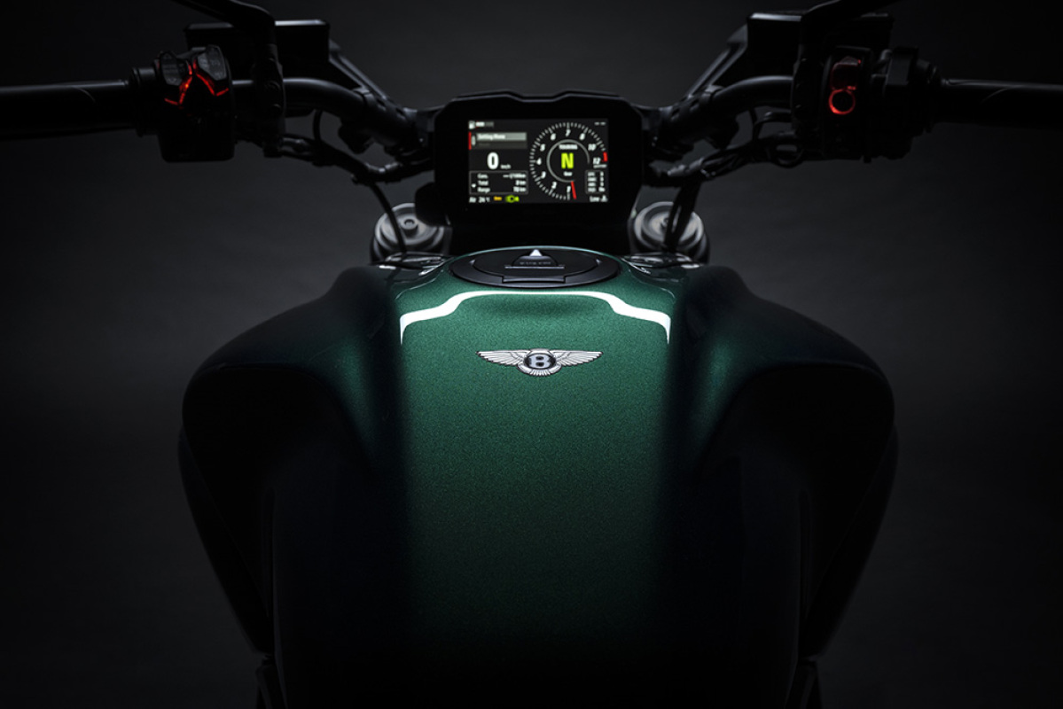 Siedzisko kierowcy, inspirowane wnętrzem samochodu, zostało obszyte czarną Alcantarą i wyróżnia się wyhaftowanym logotypem marki Bentley. Podwójna końcówka układu wydechowego wraz z osłoną została przeprojektowana w taki sposób, aby zharmonizować się z wyrafinowanymi liniami motocykla.