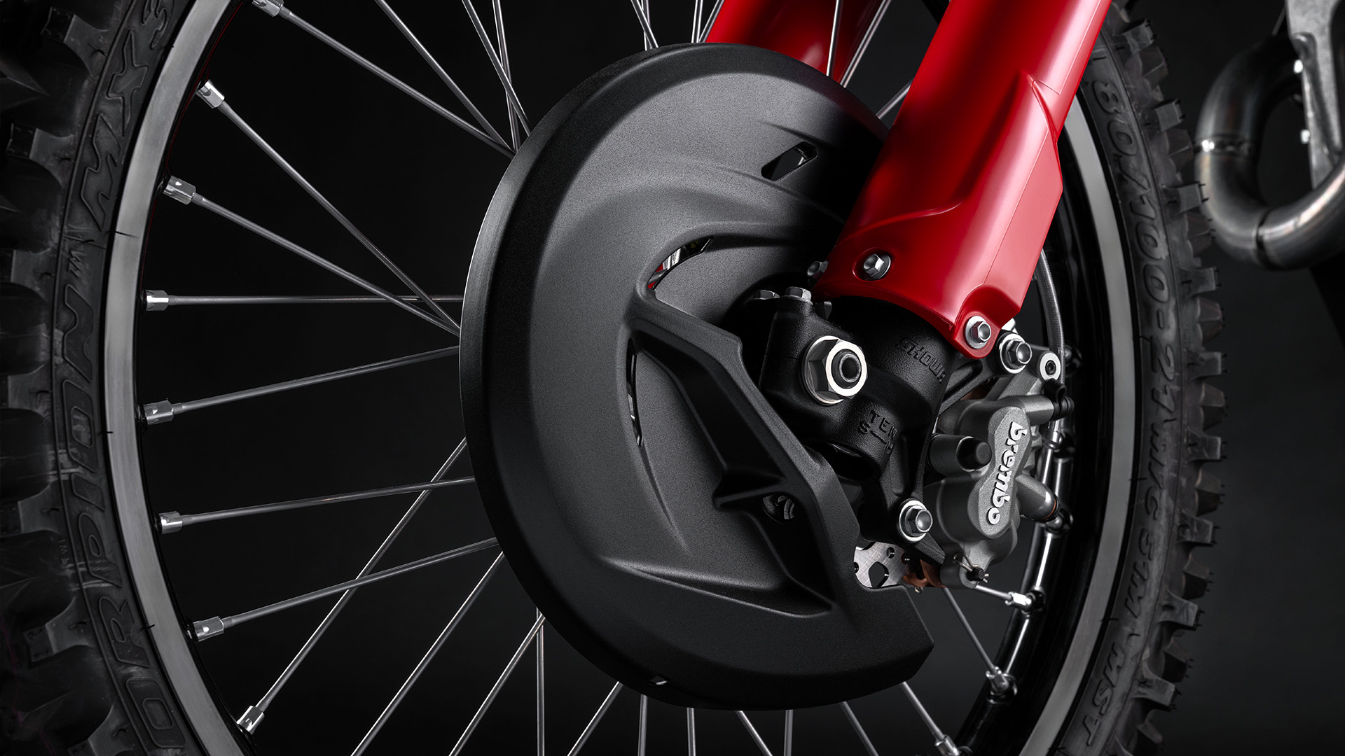 Półki wykonane z frezowanego stopu aluminium Ergal redukują masę o prawie 200 gramów. Osłona podwozia i osłona przedniej tarczy hamulcowej chronią przed błotem i kamieniami, a łańcuch O-ring RK MXU, taki sam jak w motocyklach fabrycznych, zapewnia trwałość i niezawodność.