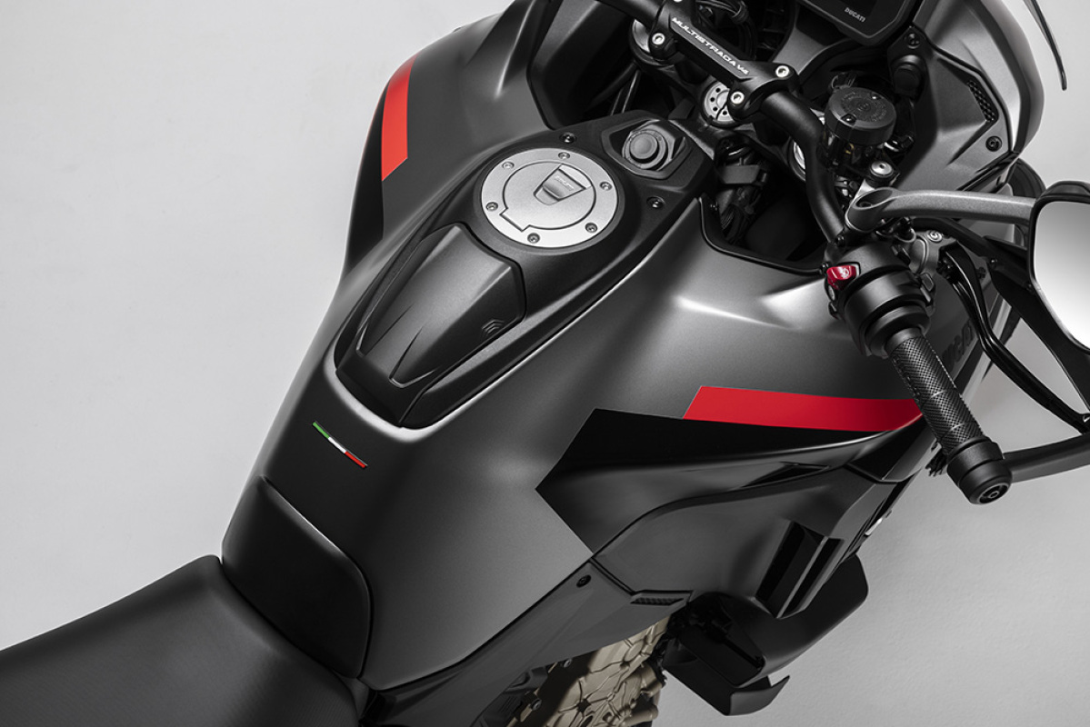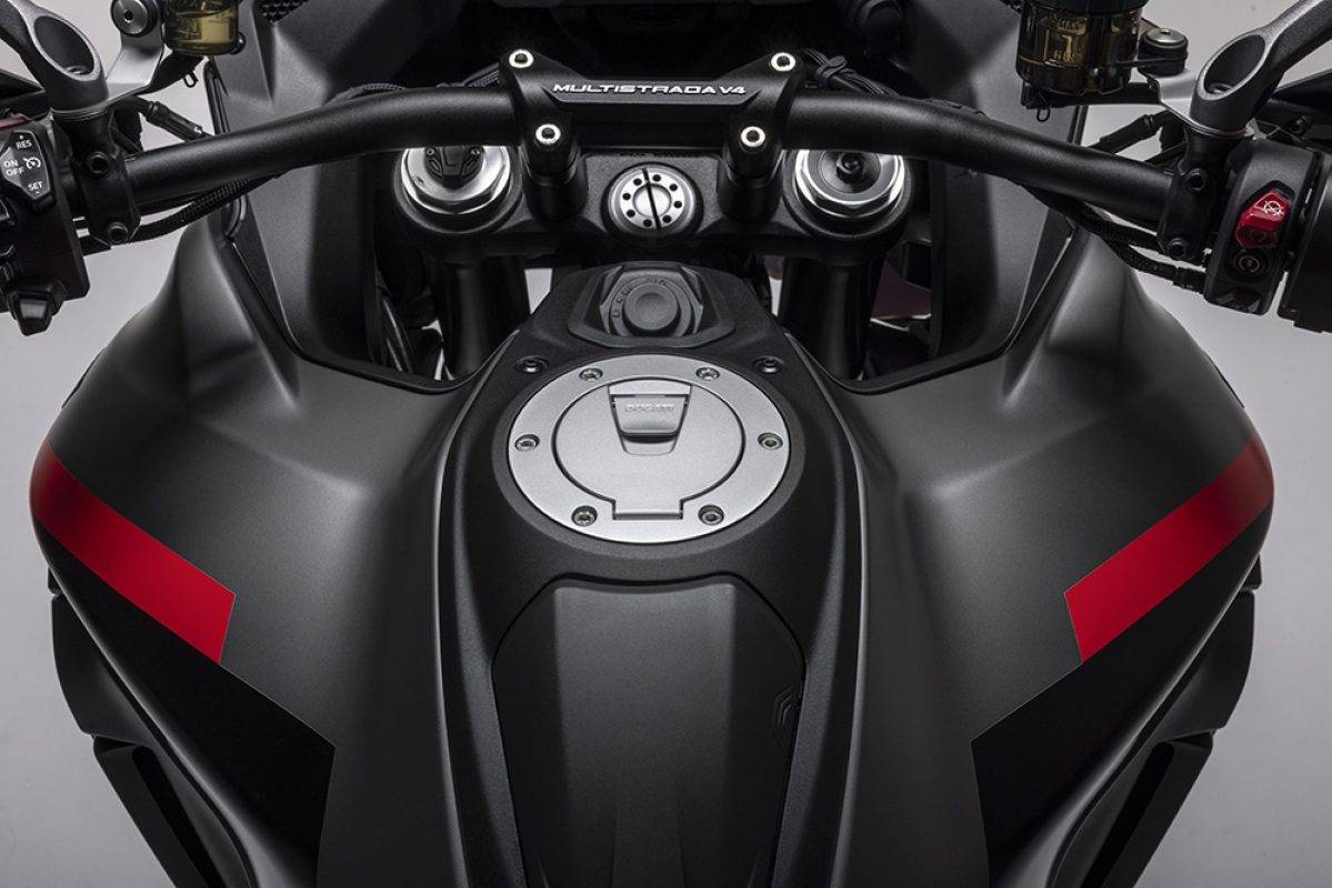 Multistrada V4 S Grand Tour posiada kilka istotnych aktualizacji, które zadebiutowały w V4 Rally. Kierownica jest zamontowana w półce bez amortyzacji, dzięki czemu motocykl dostarcza kierowcy jeszcze bardziej bezpośrednie wrażenia z jazdy, ale nie obniża komfortu. Fotel pasażera to model wprowadzony w V4 Rally, zapewniający świetną ergonomię podczas długich podróży i podobnie jak siedzisko kierowcy, ozdobiony jest dedykowaną grafiką.