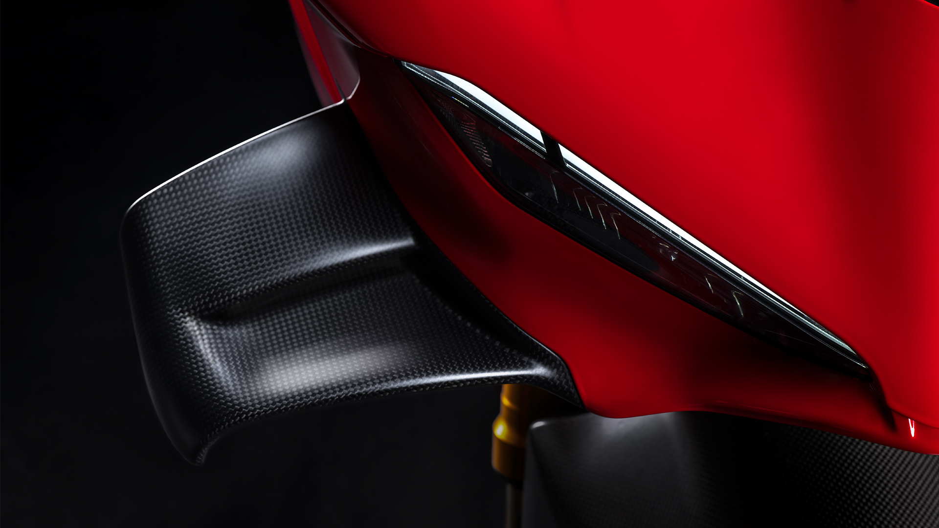 Wersja Carbon wyróżnia się pięcioramiennymi felgami z włókna węglowego, które posiadają homologację do jazdy z pasażerem i zmniejszają masę o 0,95 kg w porównaniu do kutych felg Panigale V4 S. Redukują moment bezwładności o 12% z przodu i 19% z tyłu, dzięki czemu motocykl staje się jeszcze zwinniejszy podczas zmiany kierunku jazdy i poprawia swoją już doskonałą zdolność do zamykania toru jazdy. Konfiguracja obejmuje również przedni i tylny błotnik oraz parę skrzydełek z włókna węglowego, które podkreślają linię Panigale V4 i zmniejszają masę motocykla o 1 kg.
