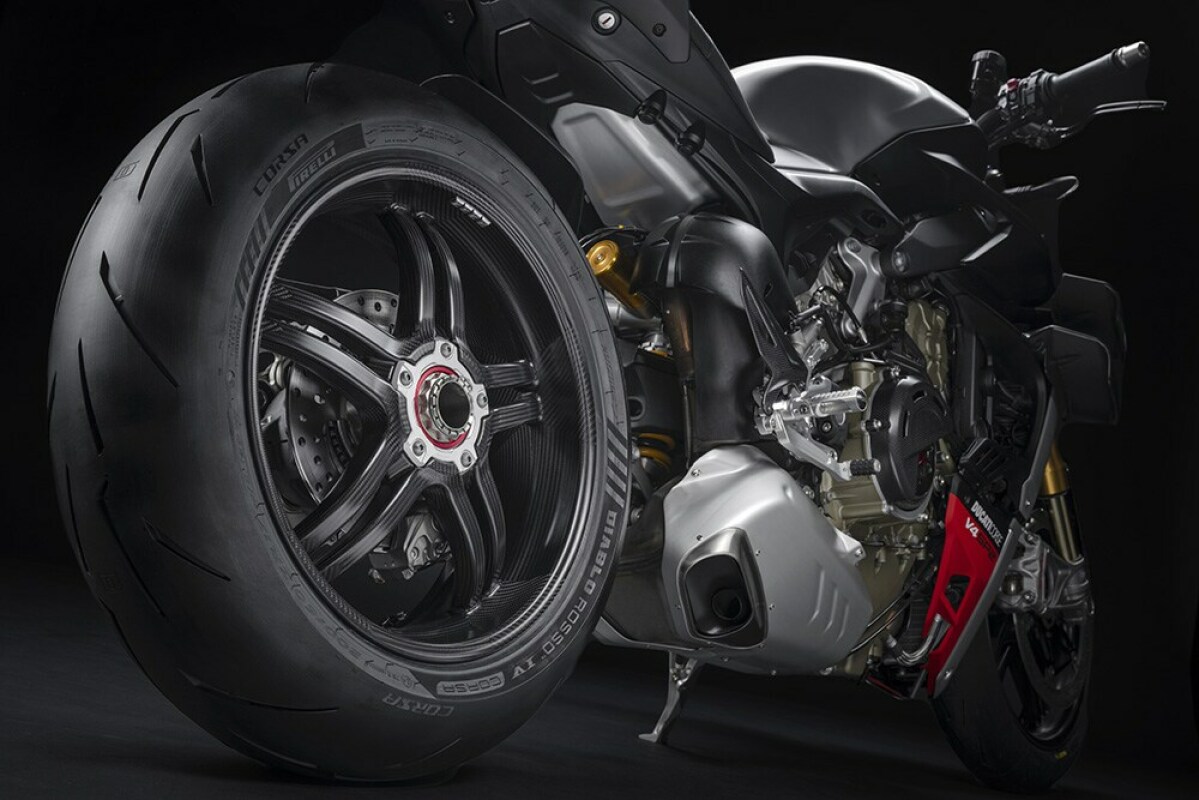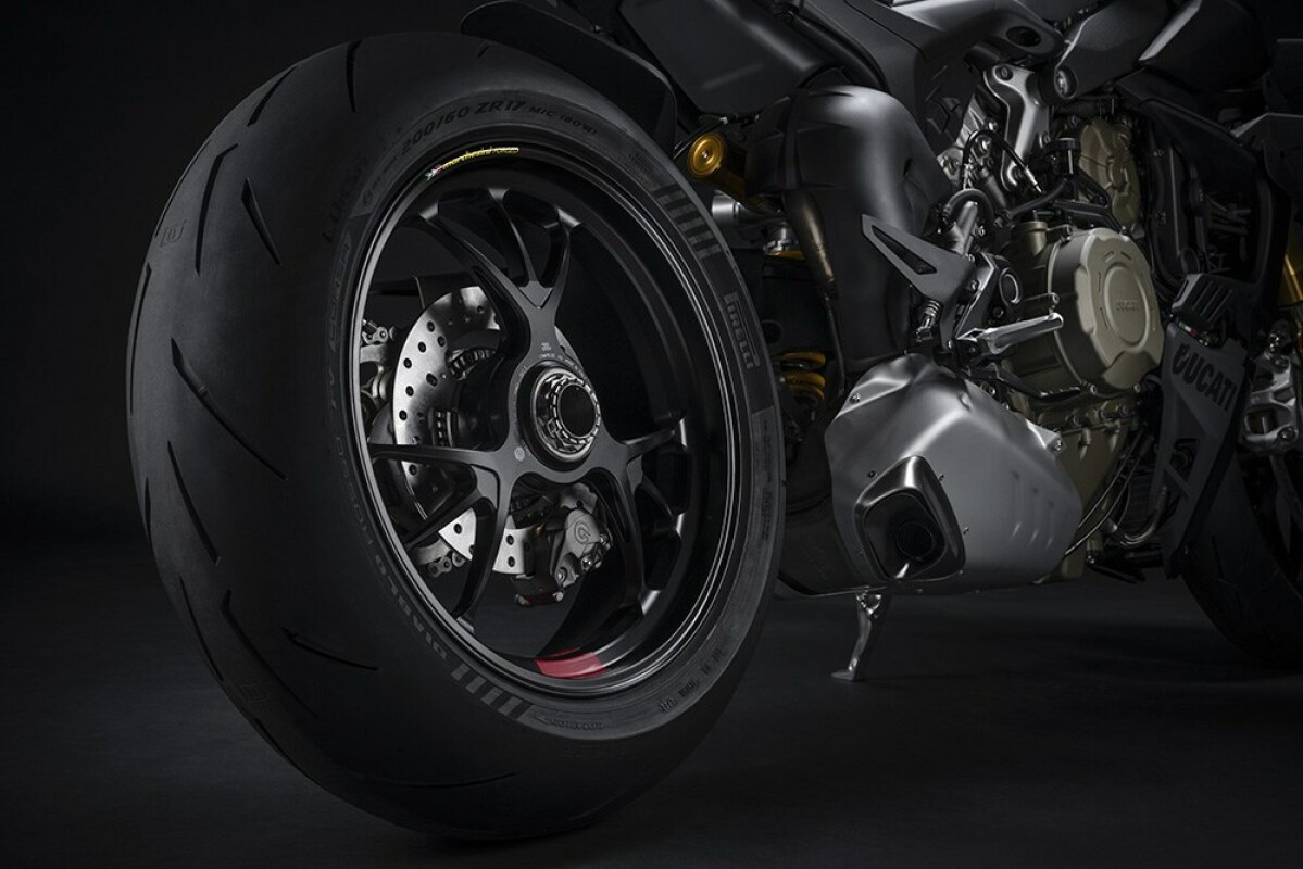 Pięcioramienne obręcze z włókna węglowego są o 1,4 kg lżejsze niż te z kutego aluminium zamontowane w Streetfighterze V4 S. Redukują moment bezwładności o 26% z przodu i 46% z tyłu, dzięki czemu motocykl jest znacznie zwinniejszy i lżejszy podczas zmiany kierunku. Zaciski hamulcowe Brembo Stylema R gwarantują wysoką siłę hamowania, a także wyjątkowo stałą wydajność nawet w przypadku długotrwałego użytkowania na torze.