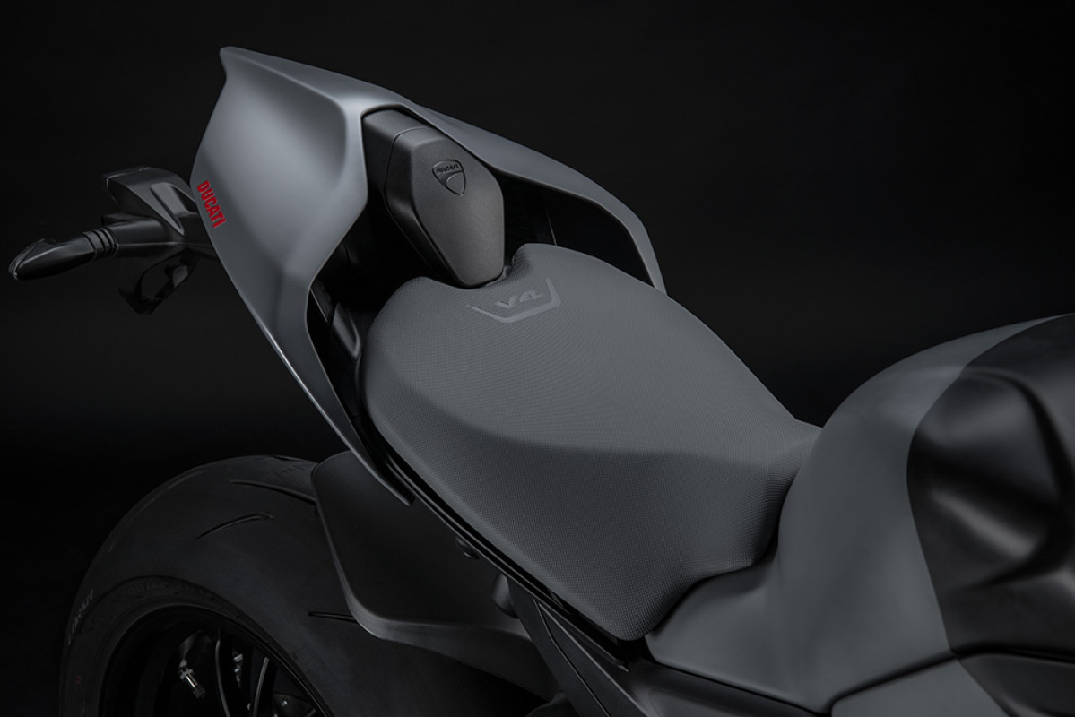 Ducati Streetfighter V4 2023 wyraża swój sportowy charakter dzięki standardowej konfiguracji jednoosobowej, z dostarczonymi podnóżkami i siedziskiem pasażera.