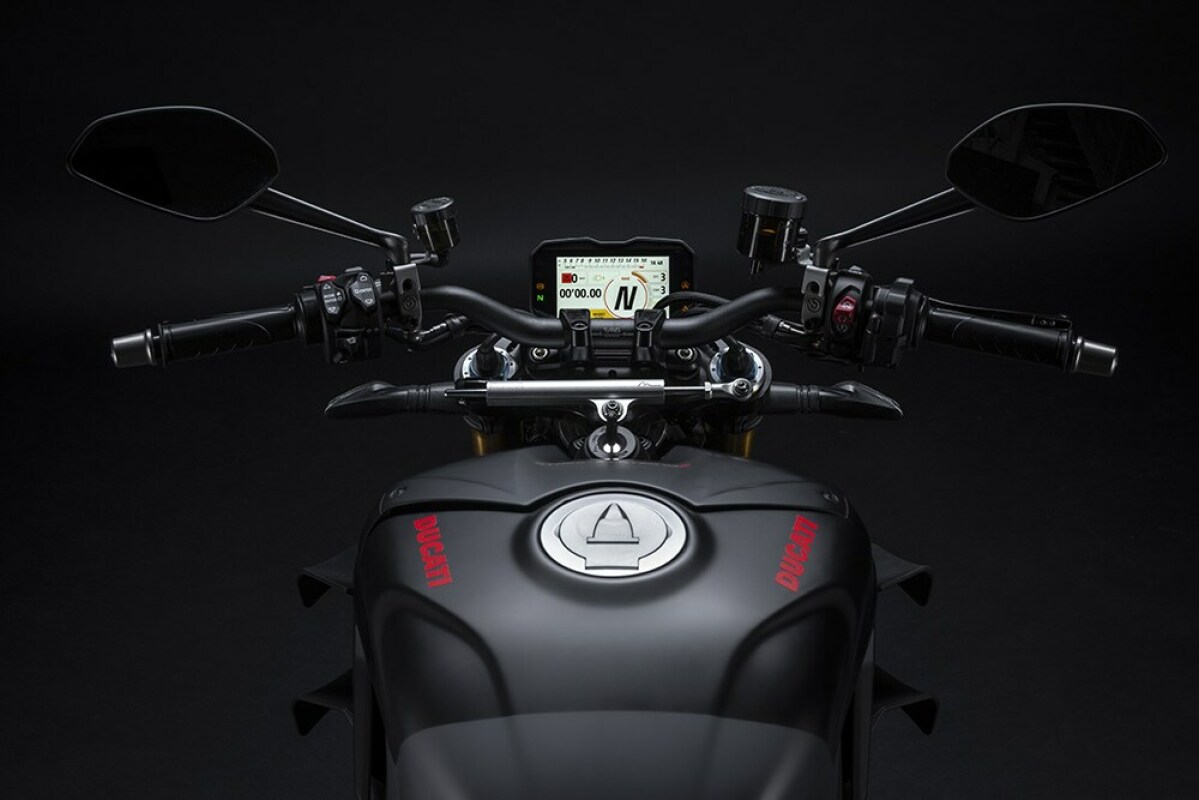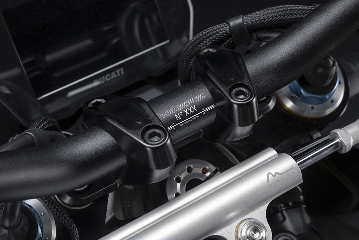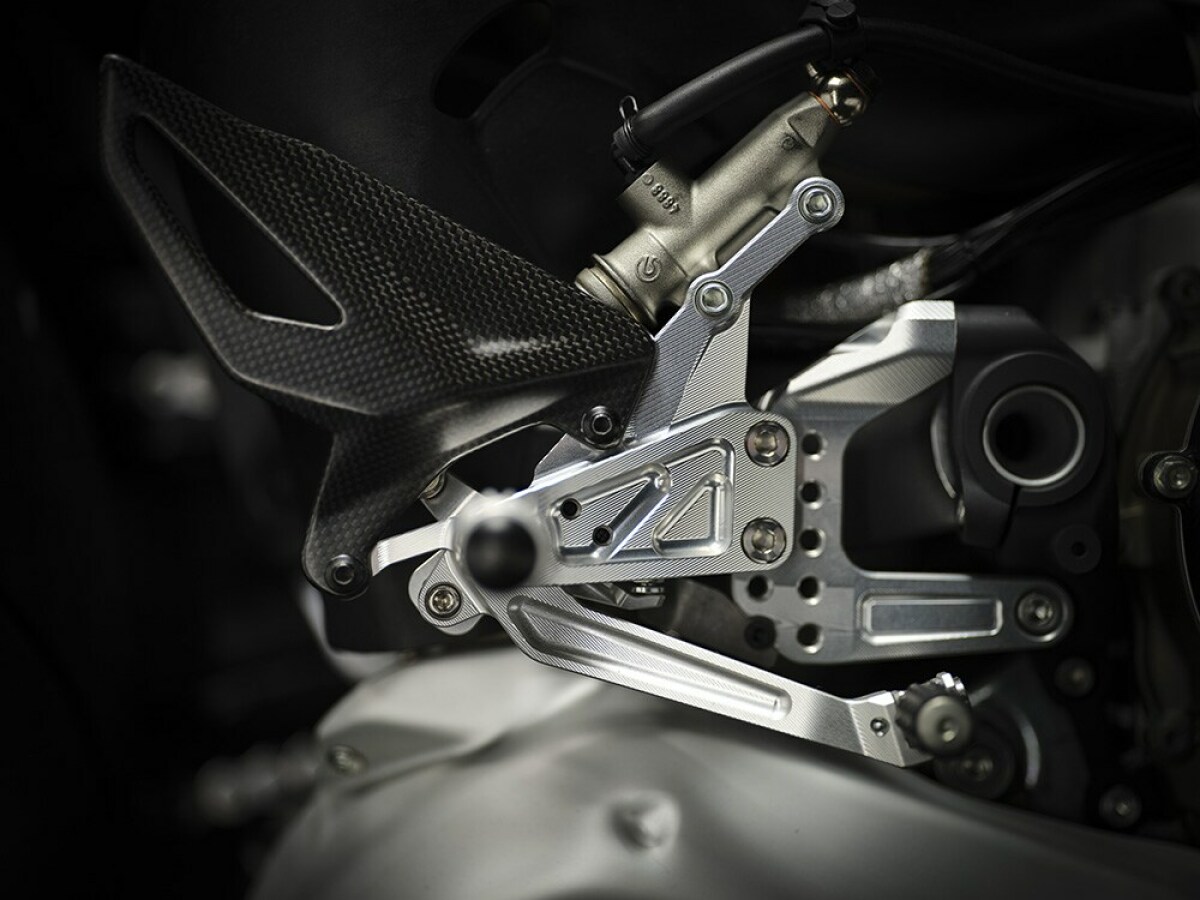 Wyposażenie uzupełniają regulowane podnóżki aluminiowe, które umożliwiają prowadzącemu znalezienie optymalnej pozycji, przedni błotnik z włókna węglowego oraz akcesoria przydatne na torze, takie jak otwarte sprzęgło z karbonową osłoną, czy zaślepki do demontażu lusterek i uchwytu tablicy rejestracyjnej.