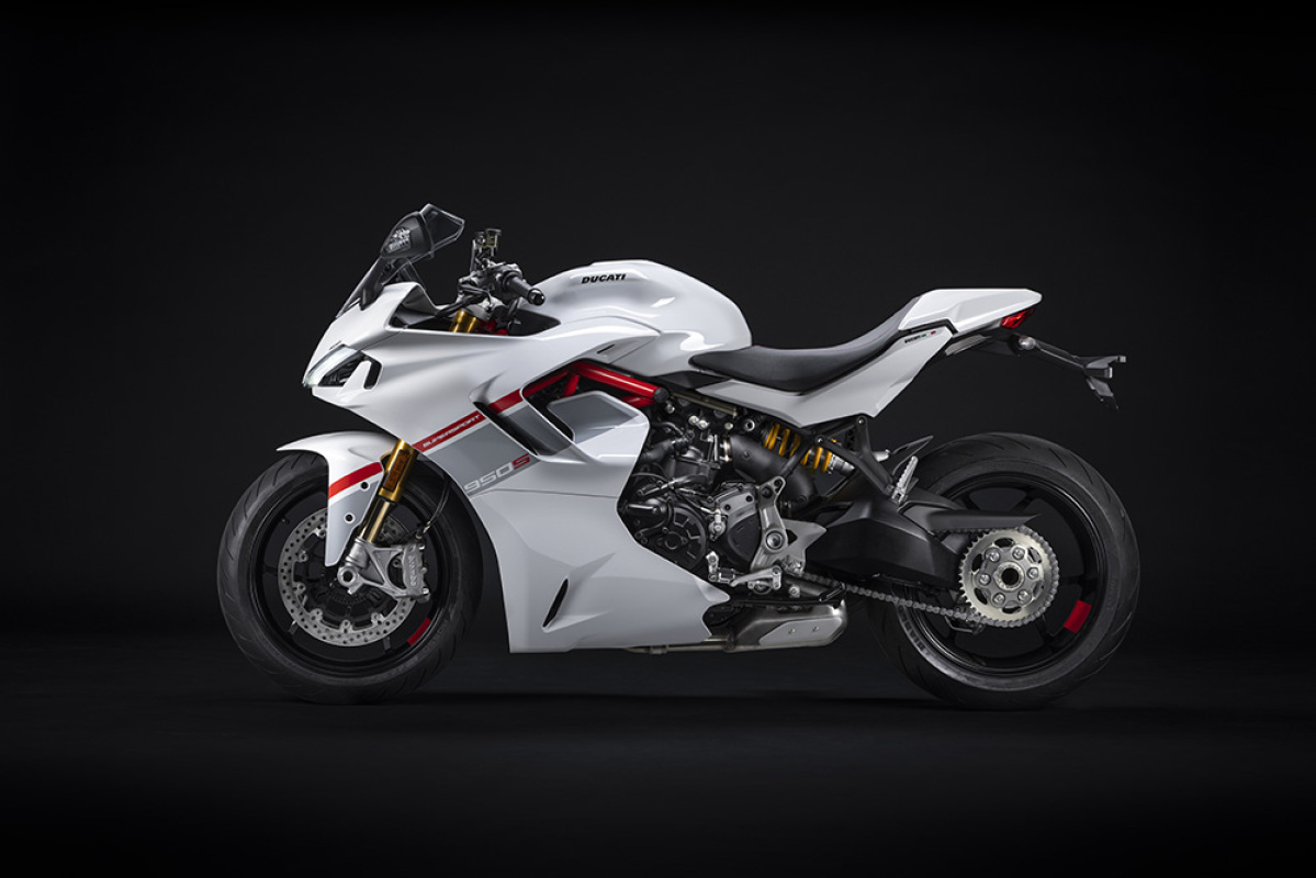 Do standardowego wyposażenia SuperSport 950 S należy przedni widelec oraz amortyzator Öhlins – oba w pełni regulowane. Dodatkowo wersja ta wyróżnia się osłoną siedzenia pasażera oraz felgami w kolorze Glossy Black, które wzbogacone zostały o wyjątkowe wstawki w kolorze Ducati Red.