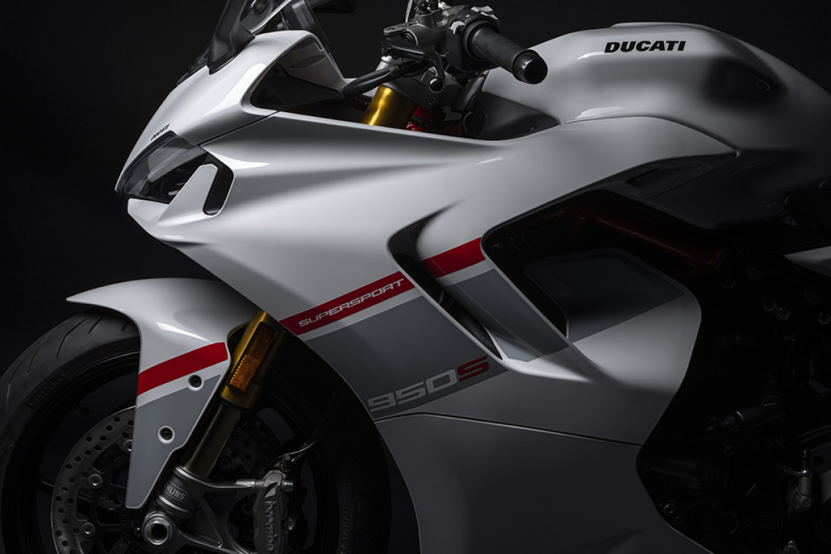 SuperSport 950 S zawiera liczne nawiązania do modelu Panigale V4 – inspirację widać chociażby w kształcie przedniego reflektora LED wyposażonego w DRL (światła do jazdy dziennej), a także w bocznych otworach wentylacyjnych odprowadzających ciepło z silnika. Unikalne połączenie turystycznego stylu ze sportową charakterystyką to dzieło Centro Stile Ducati.