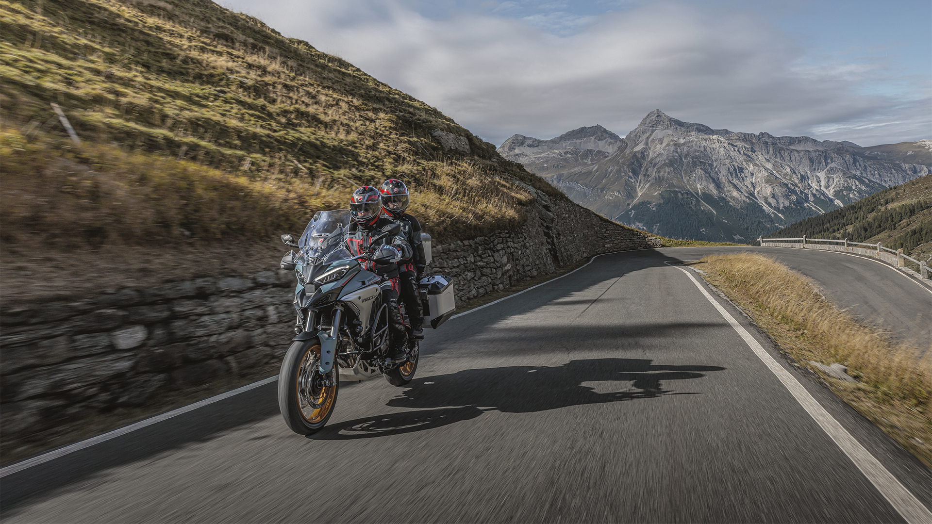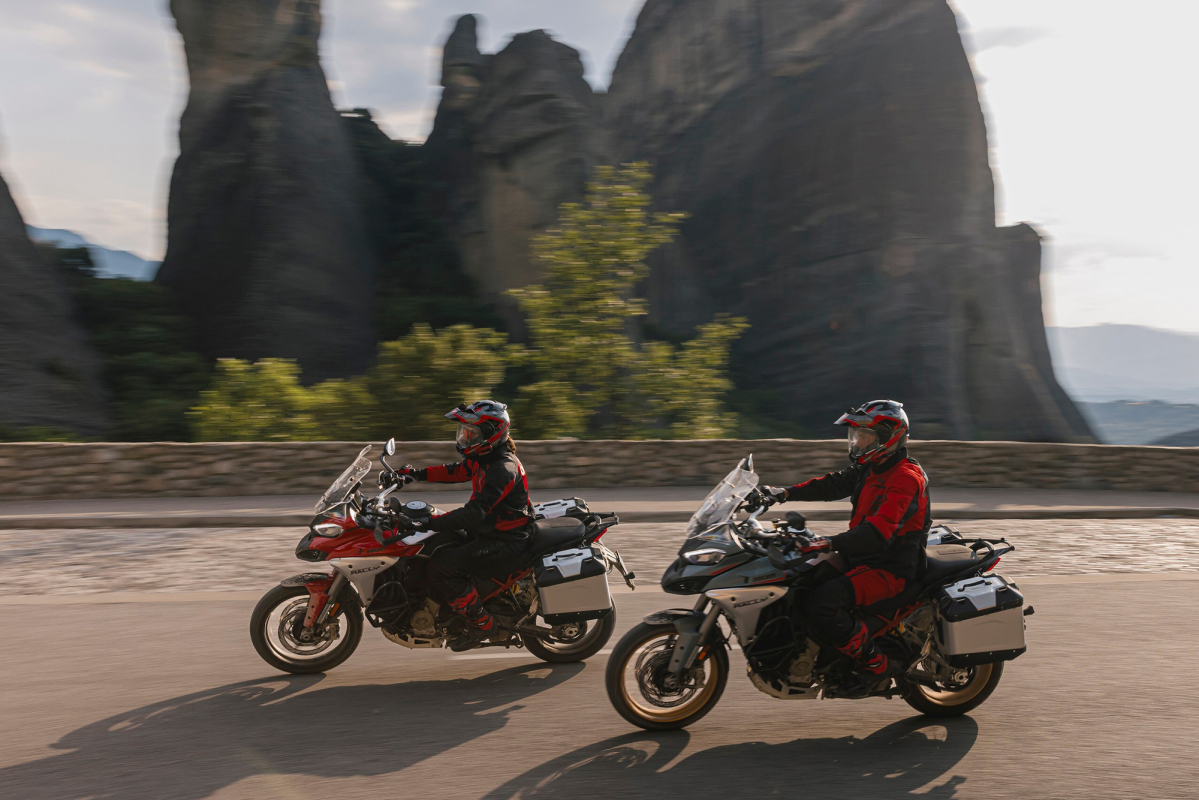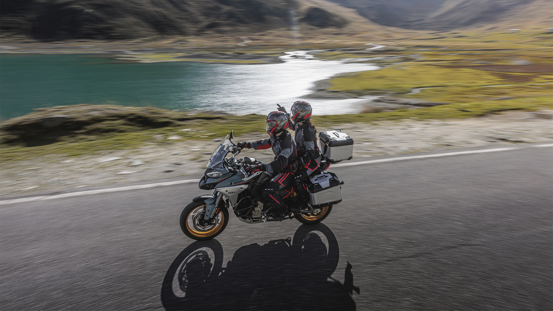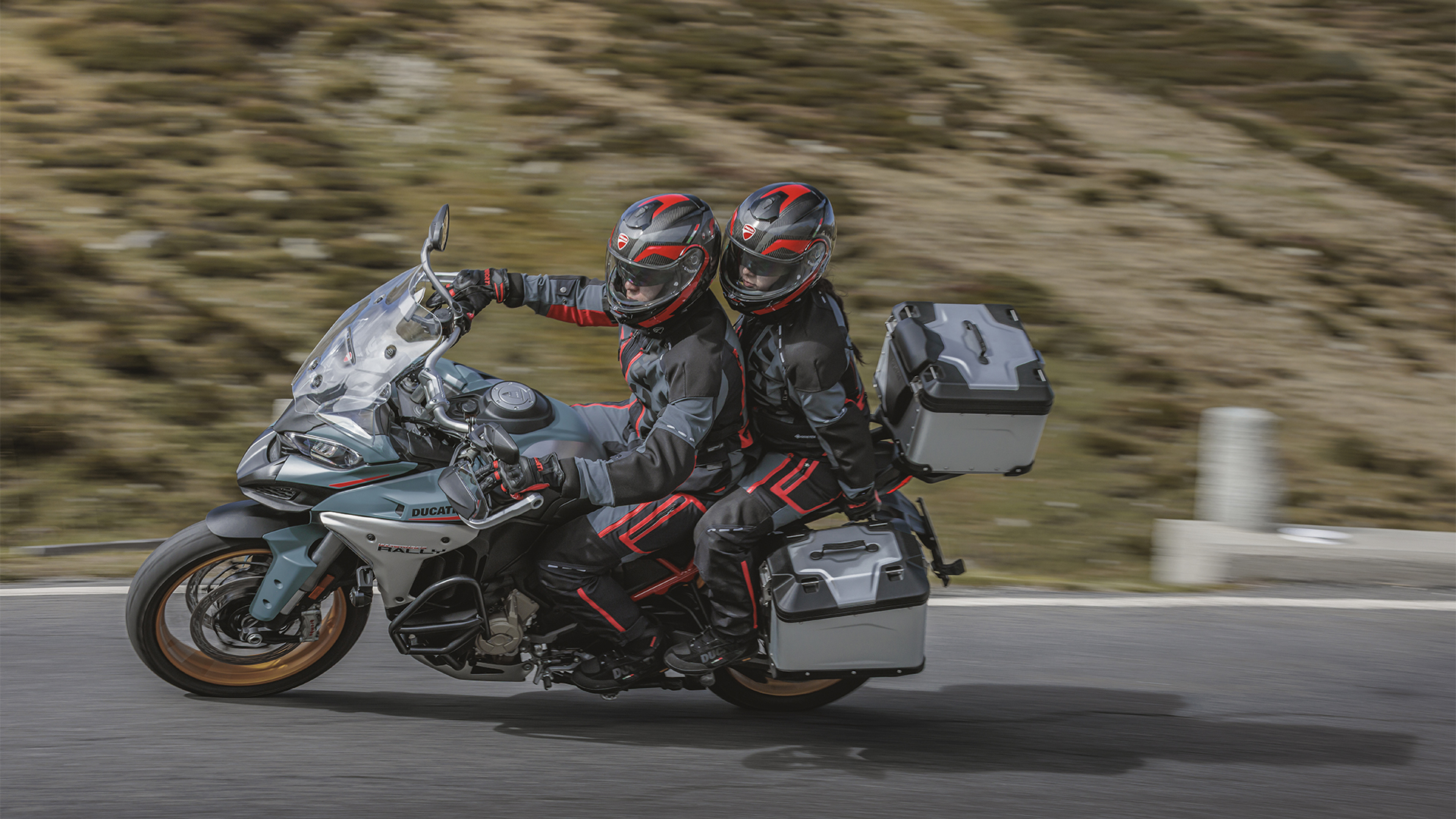 Multistrada V4 Rally to idealny motocykl do jazdy we dwoje, zaprojektowany z myślą o maksymalnym komforcie kierowcy i pasażera. Szyba przednia, szersza o 40 mm i wyższa o 20 mm, zapewnia lepszą ochronę w porównaniu z Multistradą V4. Mocowania kufrów bocznych zostały zaprojektowane tak, aby zapewnić pasażerowi więcej miejsca na nogi, a konstrukcja kufra centralnego zapewnia podparcie. Multistradę V4 Rally można dostosować pod względem wysokości dzięki dostępności różnych siedzeń dla kierowcy i pasażera oraz zestawu obniżającego zawieszenie.