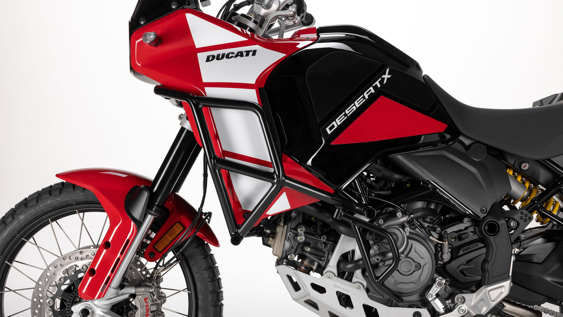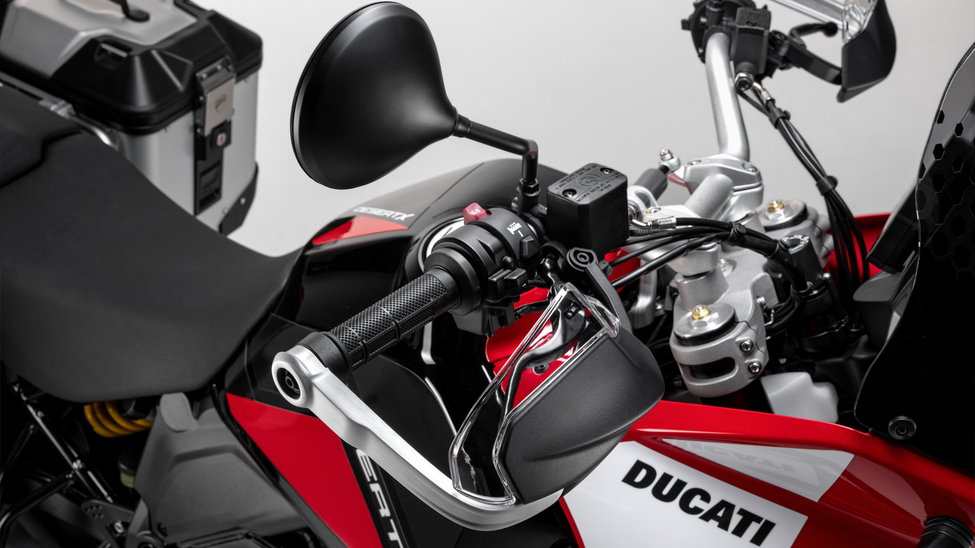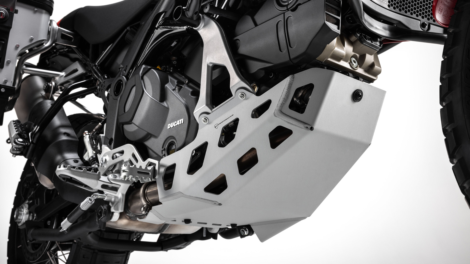 DesertX Discovery powstał, aby być niepowstrzymanym w każdym terenie i z tego powodu jest standardowo wyposażony we wzmocnione osłony dłoni, osłonę silnika z ochroną pompy wodnej, osłonę chłodnicy, a także wzmocnioną osłonę miski olejowej, aby chronić motocykl na najtrudniejszych odcinkach. Podgrzewane manetki i większa przednia szyba znacznie poprawiają komfort jazdy, a centralna podstawka sprawia, że dostęp do bagażu podczas postojów i czynności konserwacyjnych łańcucha oraz tylnego koła jest znacznie łatwiejszy.