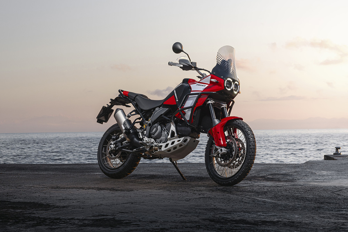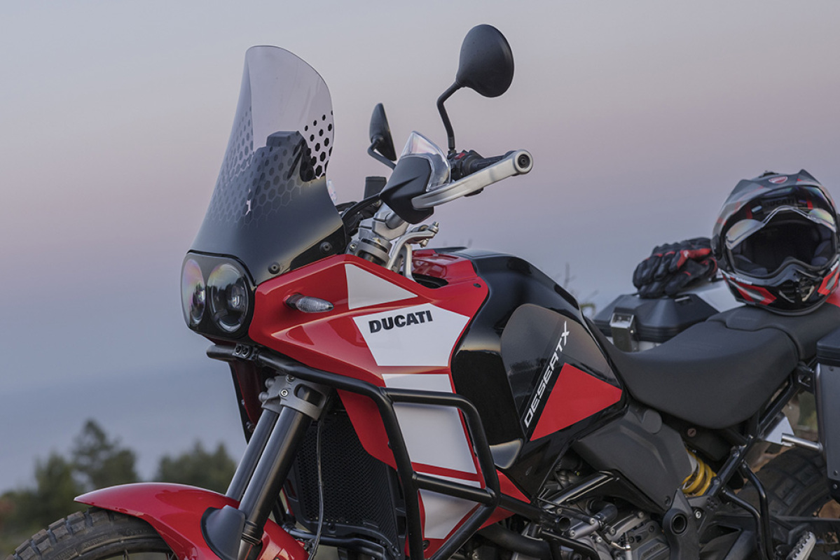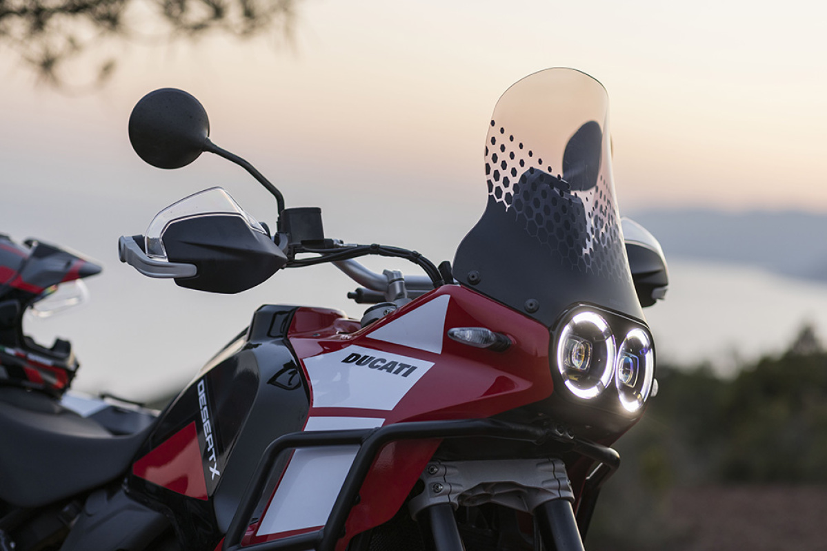 DesertX Discovery powstał, aby być niepowstrzymanym w każdym terenie i z tego powodu jest standardowo wyposażony we wzmocnione osłony dłoni, osłonę silnika z ochroną pompy wodnej, osłonę chłodnicy, a także wzmocnioną osłonę miski olejowej, aby chronić motocykl na najtrudniejszych odcinkach. Podgrzewane manetki i większa przednia szyba znacznie poprawiają komfort jazdy, a centralna podstawka sprawia, że dostęp do bagażu podczas postojów i czynności konserwacyjnych łańcucha oraz tylnego koła jest znacznie łatwiejszy.