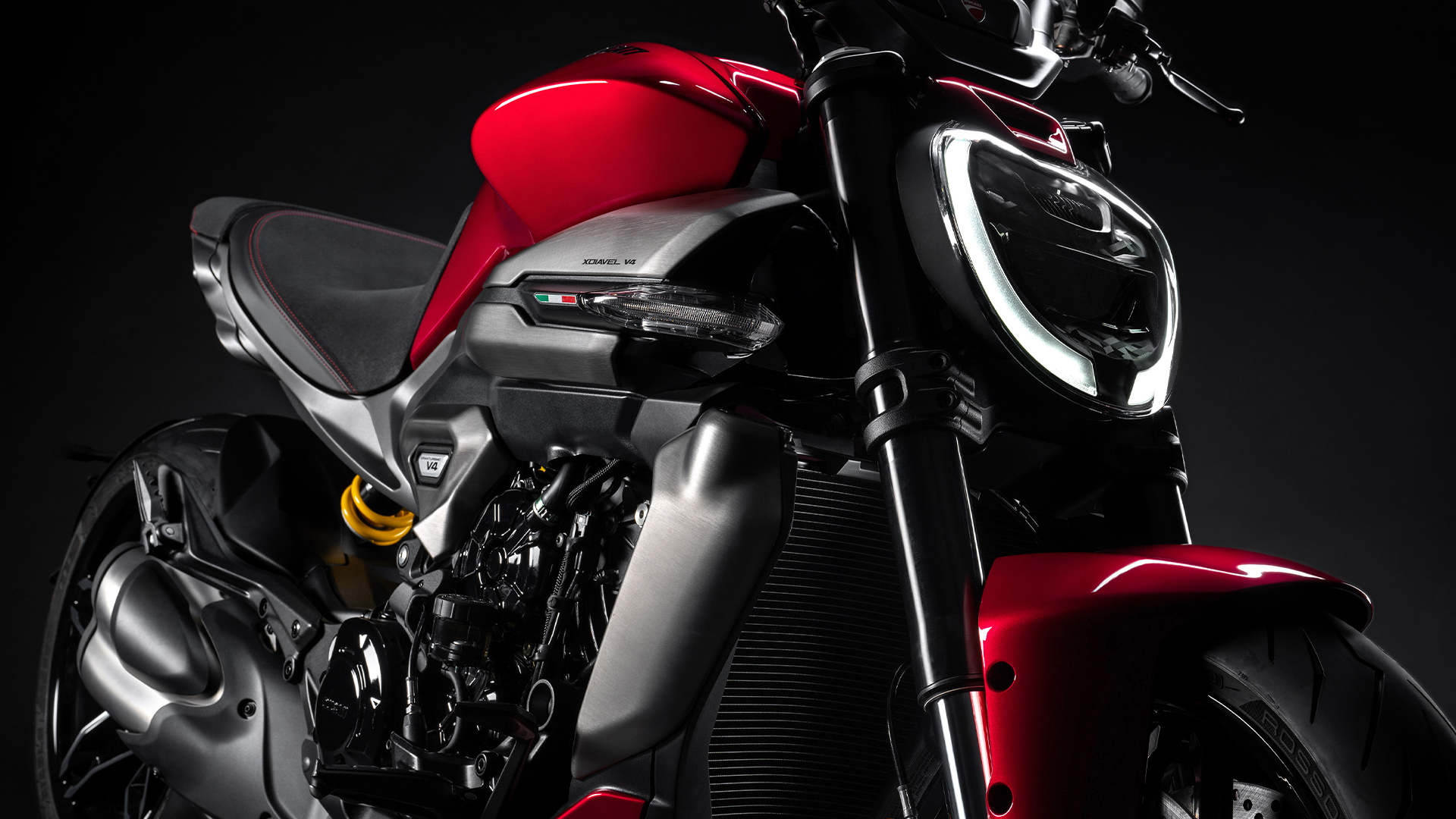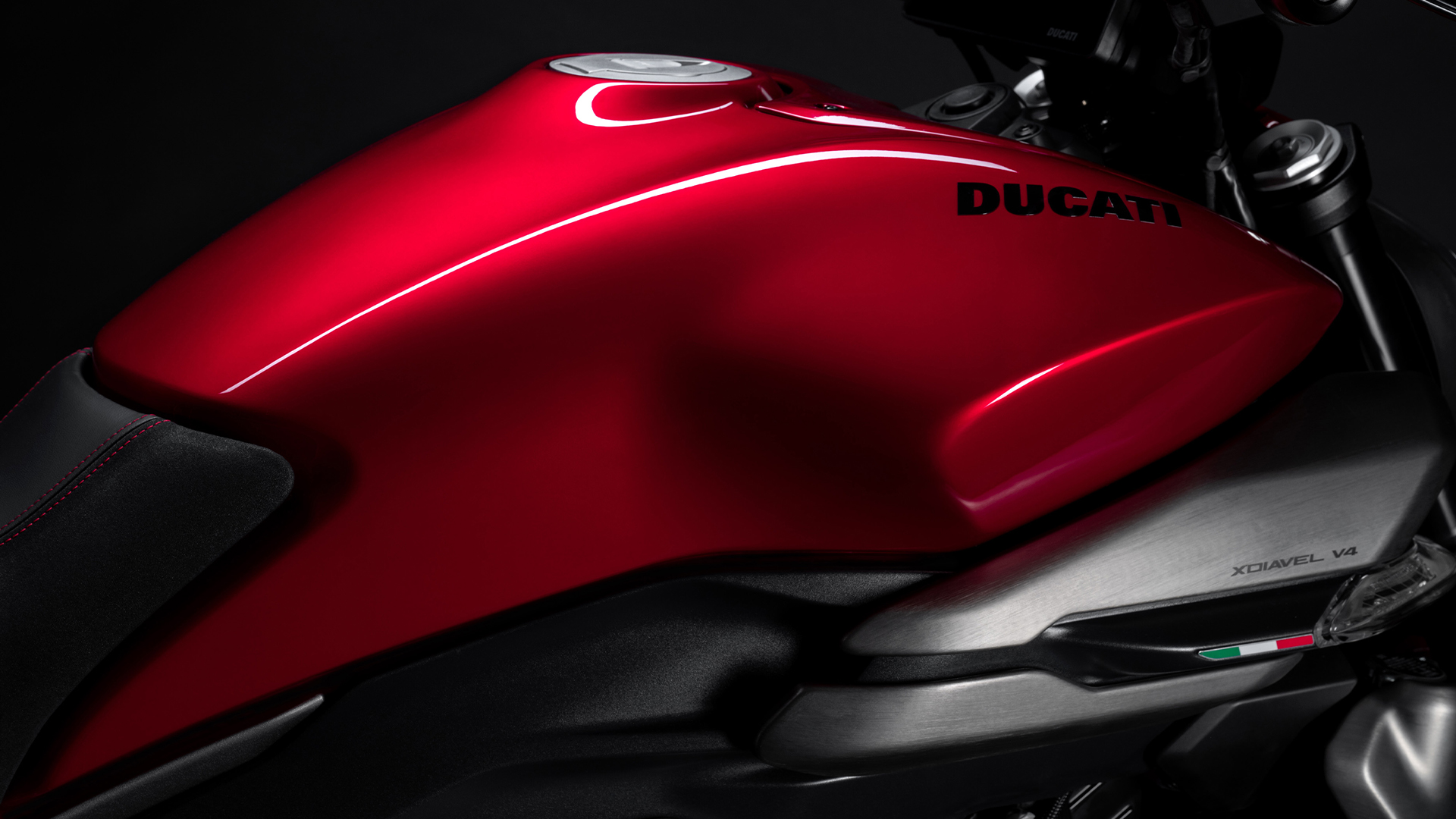 Muskularny zbiornik paliwa przyciąga wzrok nowymi kolorami Black Lava i Burning Red, stworzonymi specjalnie dla XDiavela V4, które tworzą eleganckie refleksy świetlne. Charakterystyczny wygląd motocykla podkreślają również sygnatury przedniego i tylnego oświetlenia oraz dynamiczne kierunkowskazy zintegrowane w bocznych owiewkach, które – podobnie jak reszta oświetlenia – są w pełni LED-owe. Przedni DRL przyciąga uwagę kontrastem z wewnętrzną teksturą reflektora. Wraz z tylnym światłem umieszczonym pod ogonem podkreślają wyrafinowanie i dbałość o każdy detal XDiavela.