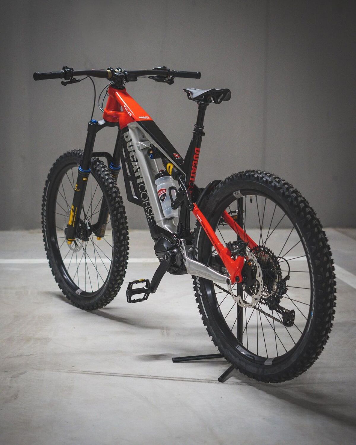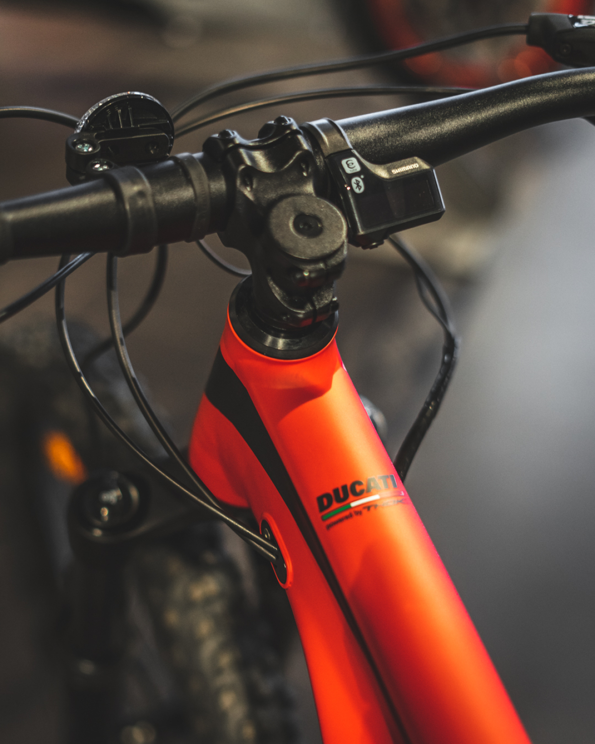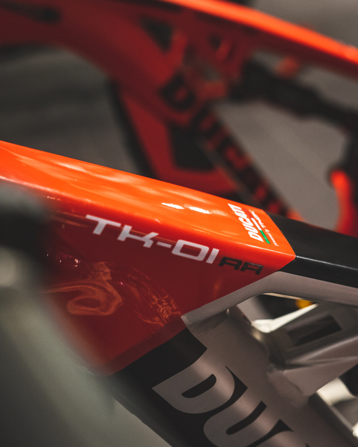 Drugi z rowerów e-MTB Ducati to model TK-01 RR, nastawiony na jazdę w najbardziej ekstremalnym terenie. Maksymalną wydajność i niezawodność w każdych warunkach gwarantują najwyższej klasy komponenty, takie jak 12-biegowa przerzutka Shimano XT 10-51T, 4-tłoczkowy układ hamulcowy Shimano XT w połączeniu z tarczami Shimano 203 mm, czy karbonowa kierownica Renthal redukująca wibracje. Z przodu zastosowano najlepszy na rynku, pneumatyczny widelec Öhlins RXF38 z 38-milimetrowymi goleniami i 180-milimetrowym skokiem. Dwutłokowy, trzykomorowy system resorów pneumatycznych widelca pozwala na szybką, łatwą i pełną regulację. Z tyłu pracuje pneumatyczny amortyzator Öhlins TTX ze skokiem 170 mm. Nowa jednostka napędowa Shimano EP8 to wyjątkowo lekki silnik elektryczny (2,6 kg masy), który zdolny jest dostarczyć do 85 Nm momentu obrotowego przy maksymalnym współczynniku wspomagania wynoszącym 400%. Dzięki aplikacji Shimano Etube Project można w dowolnym momencie dostosować charakter pracy silnika do własnych potrzeb, zmieniając poziom maksymalnego momentu obrotowego i czas wspomagania. Niski środek ciężkości zapewnia akumulator Shimano 630Wh umieszczony jest pod ramą.