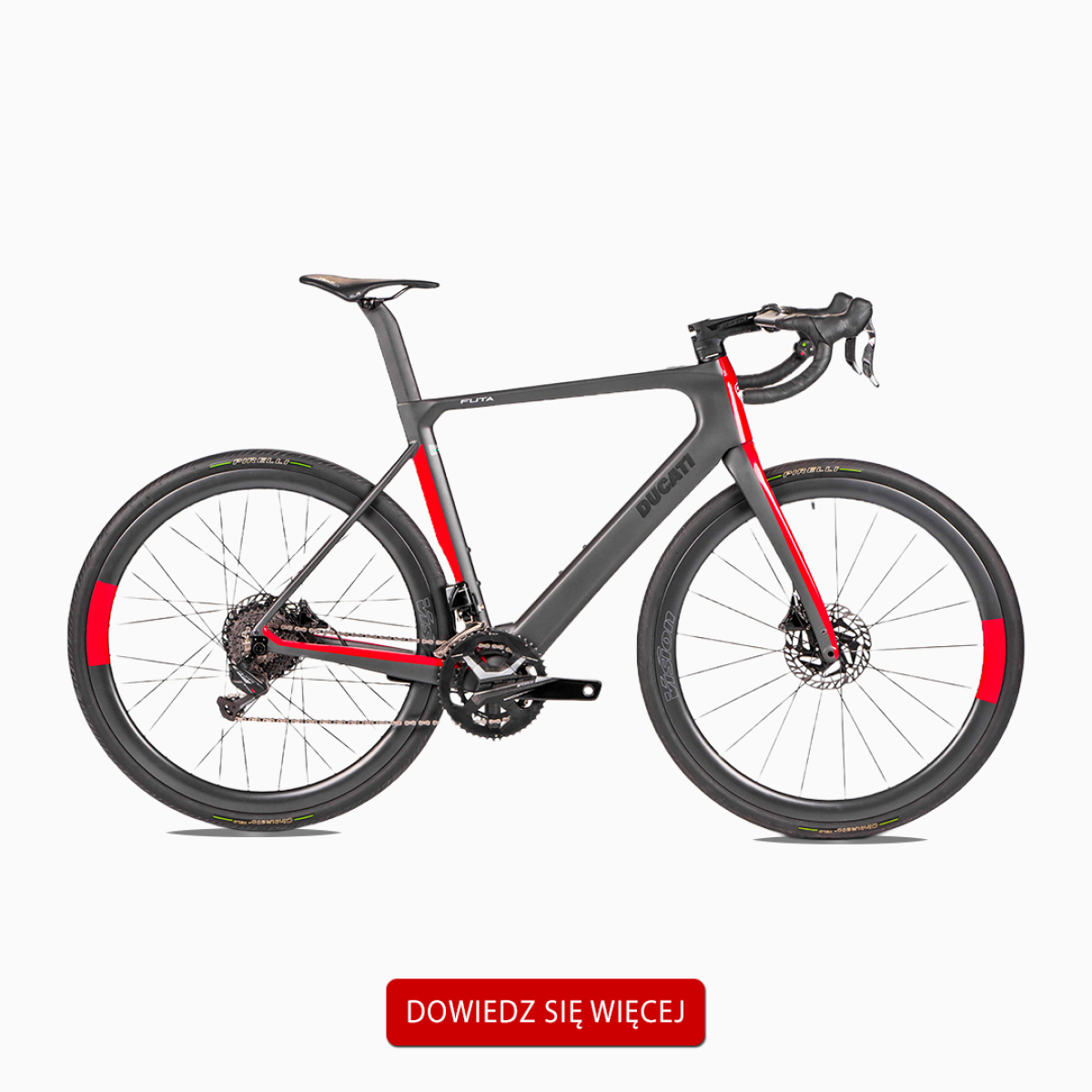 Ducati oferuje również model szosowy. Nazwa Futa pochodzi od znanej i cenionej przez wielu Ducatisti drogi przecinającej Apeniny, łączącej Bolonię z Florencją. Ducati Futa to rower dla tych, którzy chcą trenować, bawić się i pedałować do maksimum, nawet na długich dystansach i podczas pokonywania najbardziej wymagających podjazdów. Lekki rower uosabia ducha Ducati, skupiając się na designie, innowacjach, wydajności i zabawie. Rama monocoque z włókna węglowego ma sportową geometrię, ukierunkowaną na aerodynamikę i prędkość. Dominuje kolor szary i czarny z akcentami w kolorze Ducati Red. Silnik umieszczony w tylnej piaście to FSA System HM 1.0, który maksymalnie dostarcza 250 W mocy i 42 Nm momentu obrotowego, zapewnia płynne i naturalne wspomaganie w każdych warunkach. Jednostka jest najlżejsza i najbardziej kompaktowa w swojej kategorii (3,98 kg). Wyposażona jest w 5 poziomów wspomagania, które można wybierać za pomocą przełącznika Garmin umieszczonego na kierownicy. Aplikacja FSA, dostępna na urządzenia z systemem iOS i Android, umożliwia rowerzyście szybkie i intuicyjne przeglądanie statystyk, pozostałego czasu pracy baterii i stanu naładowania. Za pośrednictwem aplikacji można również pobierać dowolne aktualizacje oprogramowania i komunikować się z centrami serwisowymi FSA na całym świecie. Dzięki niskiej wadze (12,4 kg w rozmiarze M) i niemal niezauważalnym oporom silnika Ducati Futa jest zawsze responsywna i szybka na płaskich odcinkach. Standardowy zestaw FSA K-Force WE zapewnia wyjątkowo płynną i szybką zmianę przełożeń 2x12 sterowaną bezprzewodowo, mocne hamulce tarczowe 160 mm z regulowanymi, karbonowymi dźwigniami UD i mechanizm korbowy z ramionami pedałów z włókna węglowego. Karbonowe koła Vision AGX30 wyposażone są w 35mm opony Pirelli Cinturato Velo TLR, które gwarantują przyczepność i wytrzymałością. Akumulator FSA 250 Wh jest wbudowany w dolną poprzeczkę ramy, a opcjonalny range extender 250 Wh pozwala pokonywać jeszcze dłuższe dystanse.