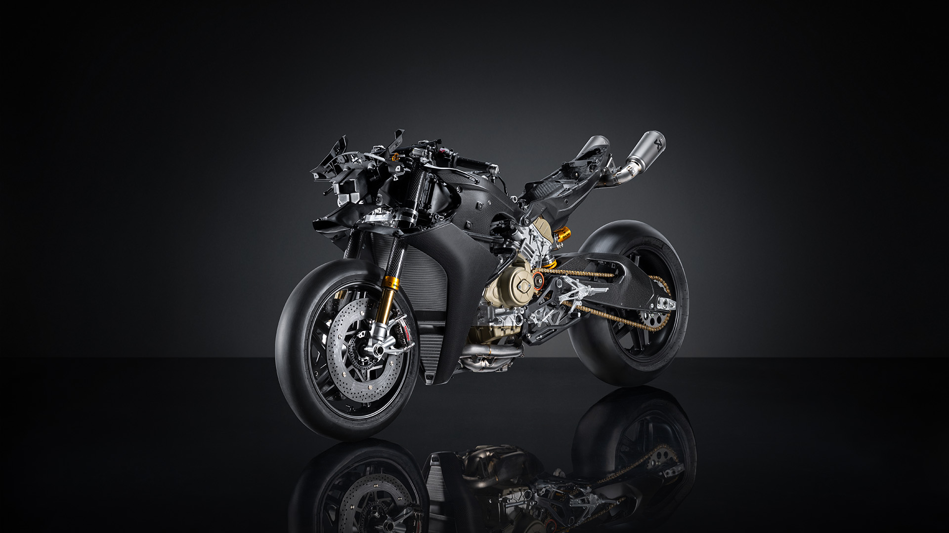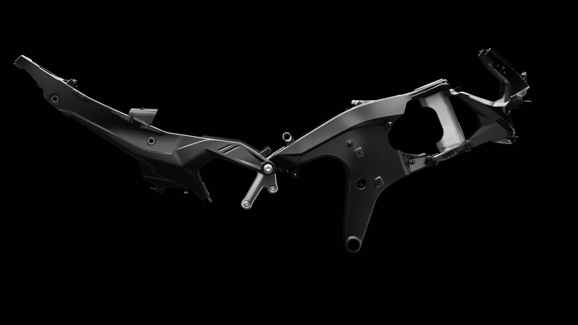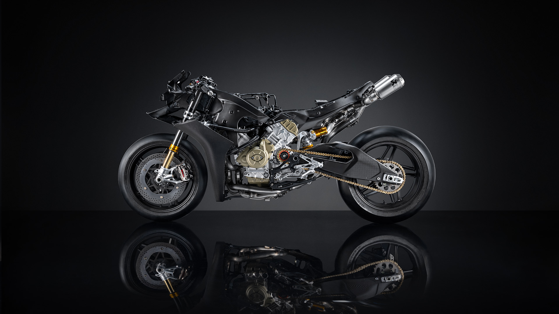 Karbonowa rama główna waży o 17% mniej niż aluminiowa w modelu Panigale V4, oferując kontrolowaną sztywność, która poprawia przyczepność w zakrętach i naturalną tendencję do zamykania linii. Wahacz jest produkowany przy użyciu procesu FDM (Sacrificial Mandrel Process), co pozwala na uzyskanie bardzo lekkiej konstrukcji monolitycznej. W porównaniu z wahaczem aluminiowym jest o 21% lżejszy, przy zachowaniu tych samych wartości sztywności.