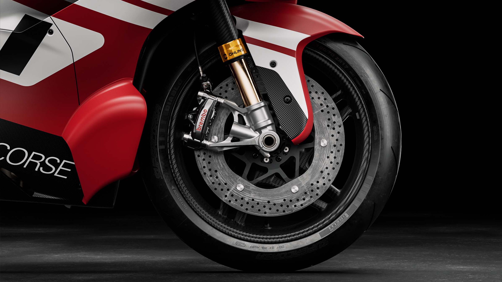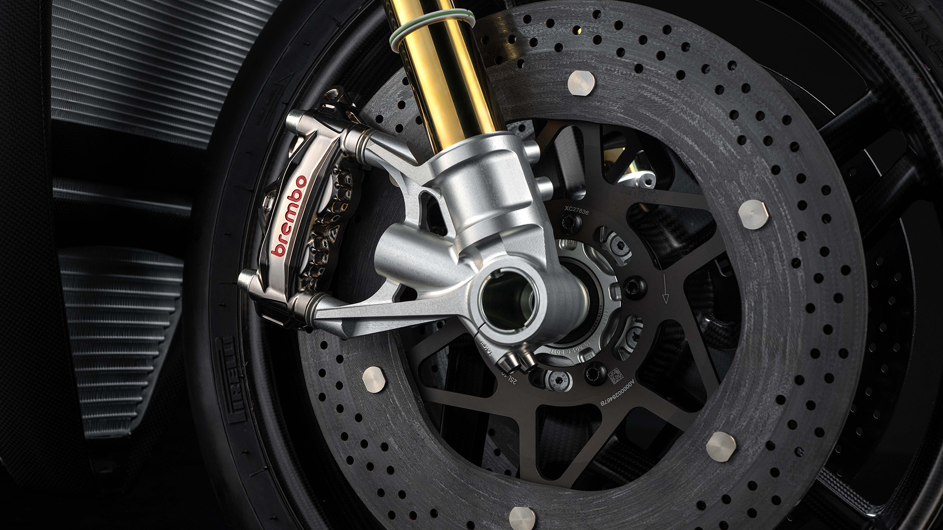 Model Superleggera V4 Centenario to pierwszy na świecie motocykl drogowy wyposażony w karbonowo-ceramiczne tarcze hamulcowe dopuszczone do użytku drogowego. Nowe tarcze Brembo zbudowane są wokół rdzenia wykonanego z C/SiC, ceramicznej mieszanki wzmocnionej włóknem węglowym. Technologia ta oferuje unikalne połączenie lekkości, sztywności i stabilności termicznej. Tarcza zachowuje swoją skuteczność nawet w bardzo wysokich temperaturach, zapewniając równomierne hamowanie nawet podczas ekstremalnego użytkowania.