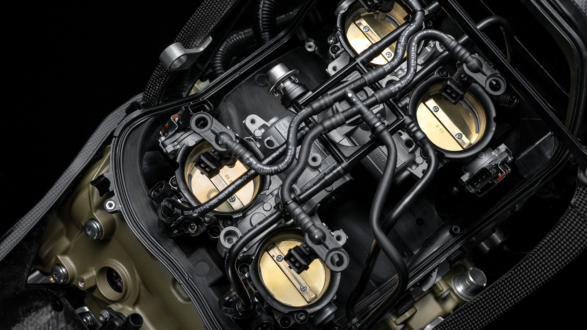 Mieszanka paliwowa zasysana jest przez owalne przepustnice o średnicy 56 mm, zwiększonej o 4 mm w porównaniu z silnikiem Desmosedici Stradale. Górne wtryskiwacze jeszcze lepiej rozpylają paliwo dzięki zbliżeniu końcówki w kierunku kanału dolotowego.