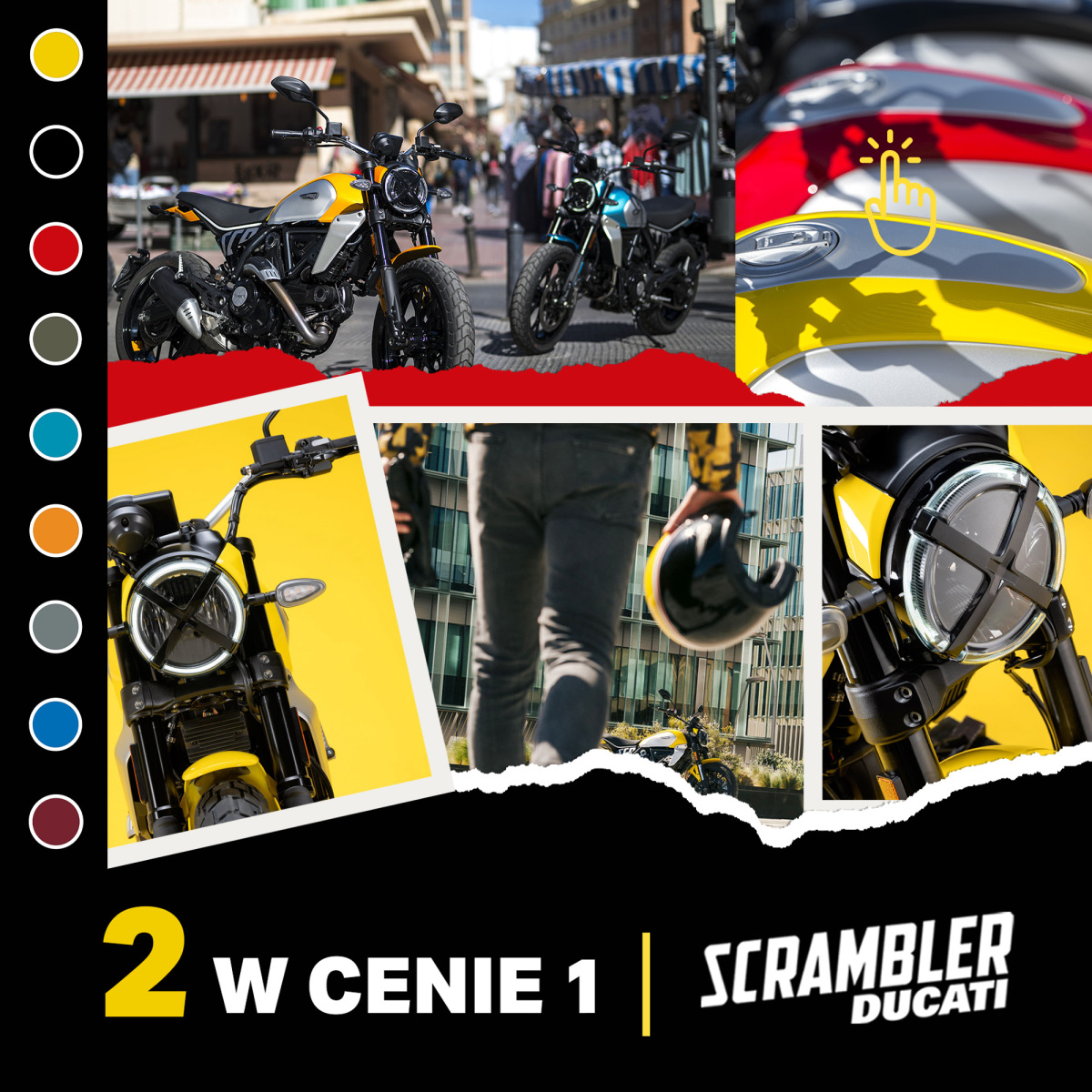 Nie zwlekaj, zamów swojego wymarzonego Scramblera Icon w dwóch, wybranych przez siebie wersjach kolorystycznych. Promocja dotyczy wyłącznie fabrycznie nowych motocykli Scrambler Next-Gen Icon. Oferta obowiązuje od 26 kwietnia do 31 maja 2024 roku włącznie i nie łączy się z pozostałymi akcjami promocyjnymi. Chcesz dowiedzieć się więcej? Skontaktuj się z Twoim dealerem Ducati.