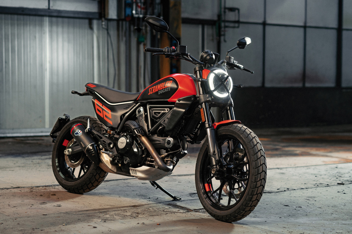 Najbardziej sportowa propozycja w rodzinie, inspirowana zawodami Flat Track. Boczne tablice z numerem 62 nawiązują do roku 1962, w którym debiutował pierwszy Ducati Scrambler.
