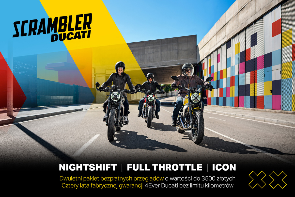 Na odwiedzających salony Ducati czekają nowe jednoślady z gamy Next-Gen z 2024 roku, wyposażone w bogate pakiety korzyści. Znajdziesz wśród nich dwuletni pakiet przeglądów serwisowych o wartości do 3500 zł, czteroletnią gwarancję fabryczną bez limitu kilometrów i… O resztę zapytaj swojego dealera Ducati! Specjalna oferta na motocykle Scrambler Next-Gen obejmuje następujące modele: