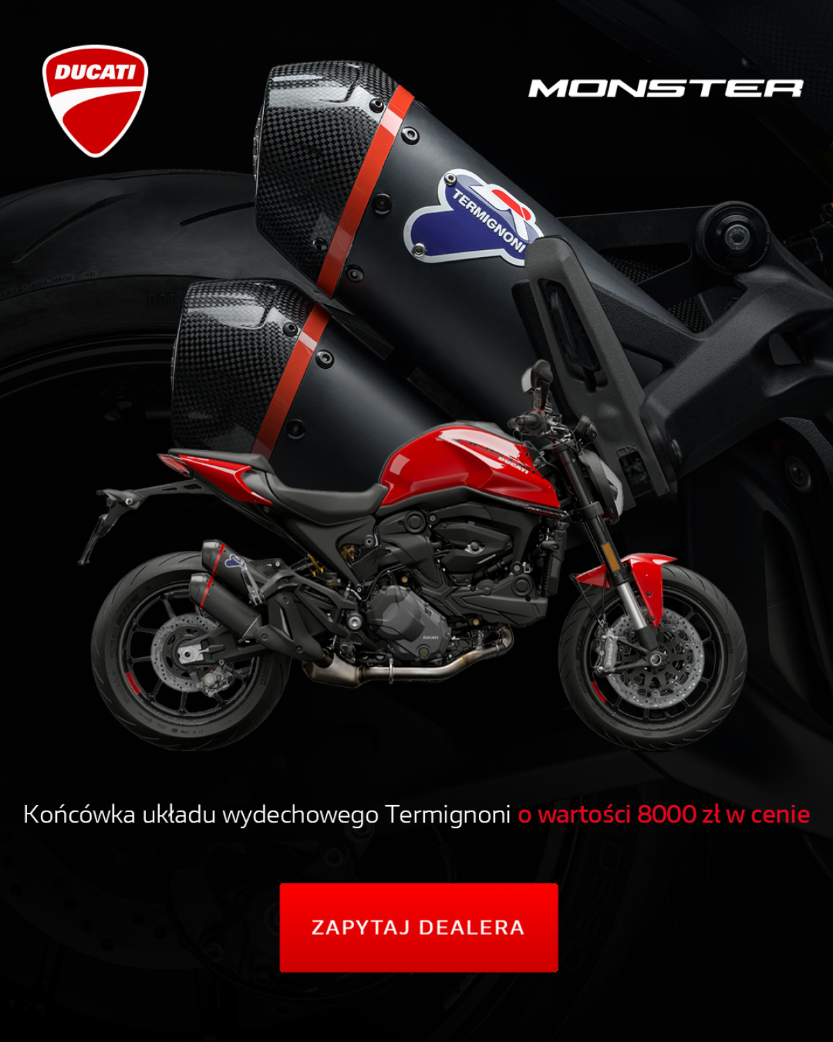 Do końca lutego bieżącego roku mamy dla Was wyśmienitą ofertę na modele Monster i Monster Plus. Do każdego zakupionego nowego motocykla możecie otrzymać końcówkę układu wydechowego Termignoni w cenie – bez żadnych dodatkowych kosztów!
