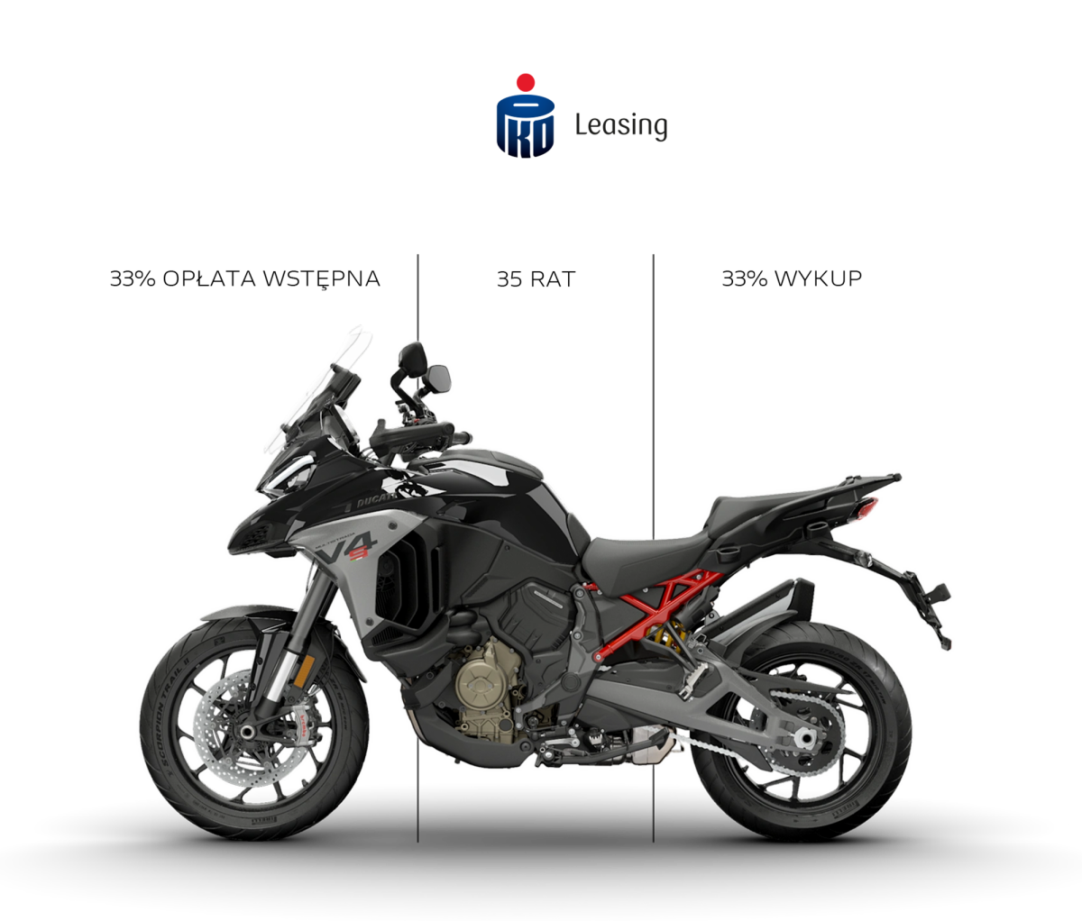 W ramach oferty finansowania przygotowanej we współpracy z PKO Leasing proponujemy leasing operacyjny na korzystnych warunkach oraz pełny pakiet ubezpieczenia zawarty w cenie. Oferta dotyczy wyłącznie nowych motocykli z roku produkcji 2025 Multistrada V2 S, Multistrada V4 S i Multistrada V4 Rally, a także Streetfighter V2 i Streetfighter V2 S, które standardowo objęte są 4-letnią gwarancją fabryczną bez limitu kilometrów. Szczegółowe informacje dostępne są u przedstawicieli dealerów Ducati po przeprowadzeniu symulacji leasingowej. Ramowe parametry oferty obejmują dwa warianty: