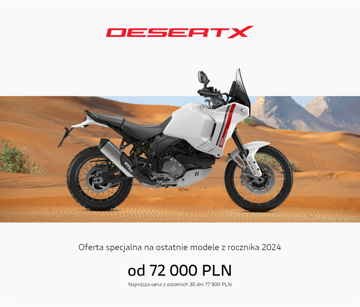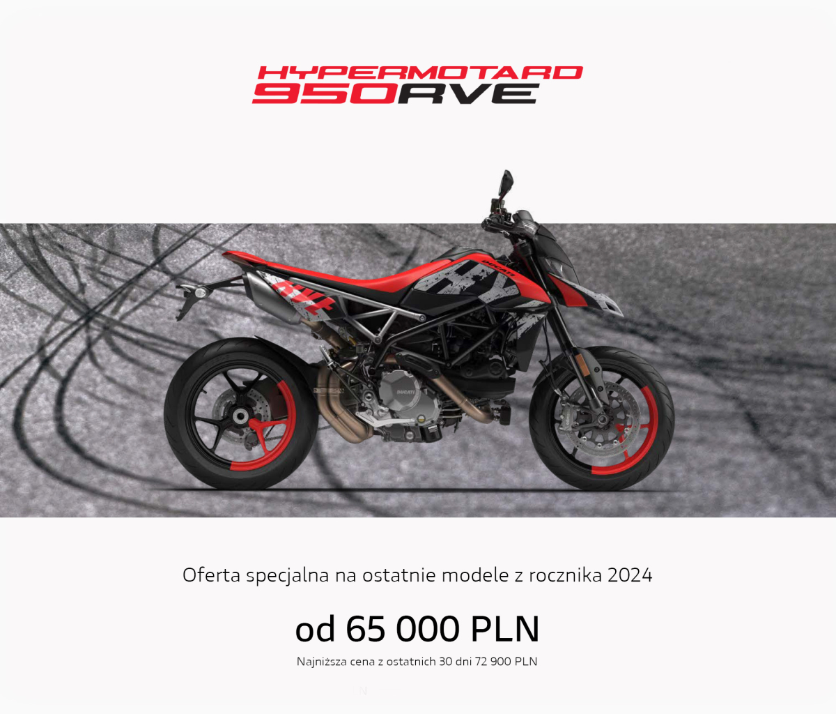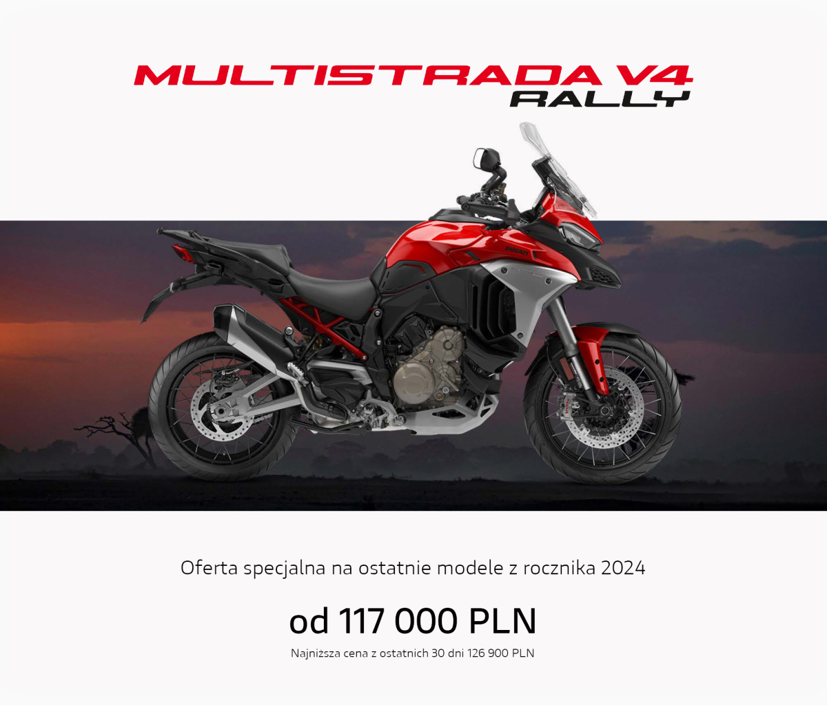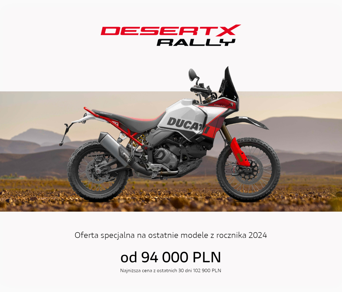 Informujemy, że podane ceny mają wyłącznie charakter informacyjny, a dystrybutor zastrzega prawo do ich zmiany. Liczba egzemplarzy objętych specjalnymi cenami jest ograniczona, a ofertę można otrzymać we wszystkich stacjach dealerskich Ducati w Polsce. Oferta obowiązuje do wyczerpania zapasów i nie łączy się z pozostałymi akcjami promocyjnymi.