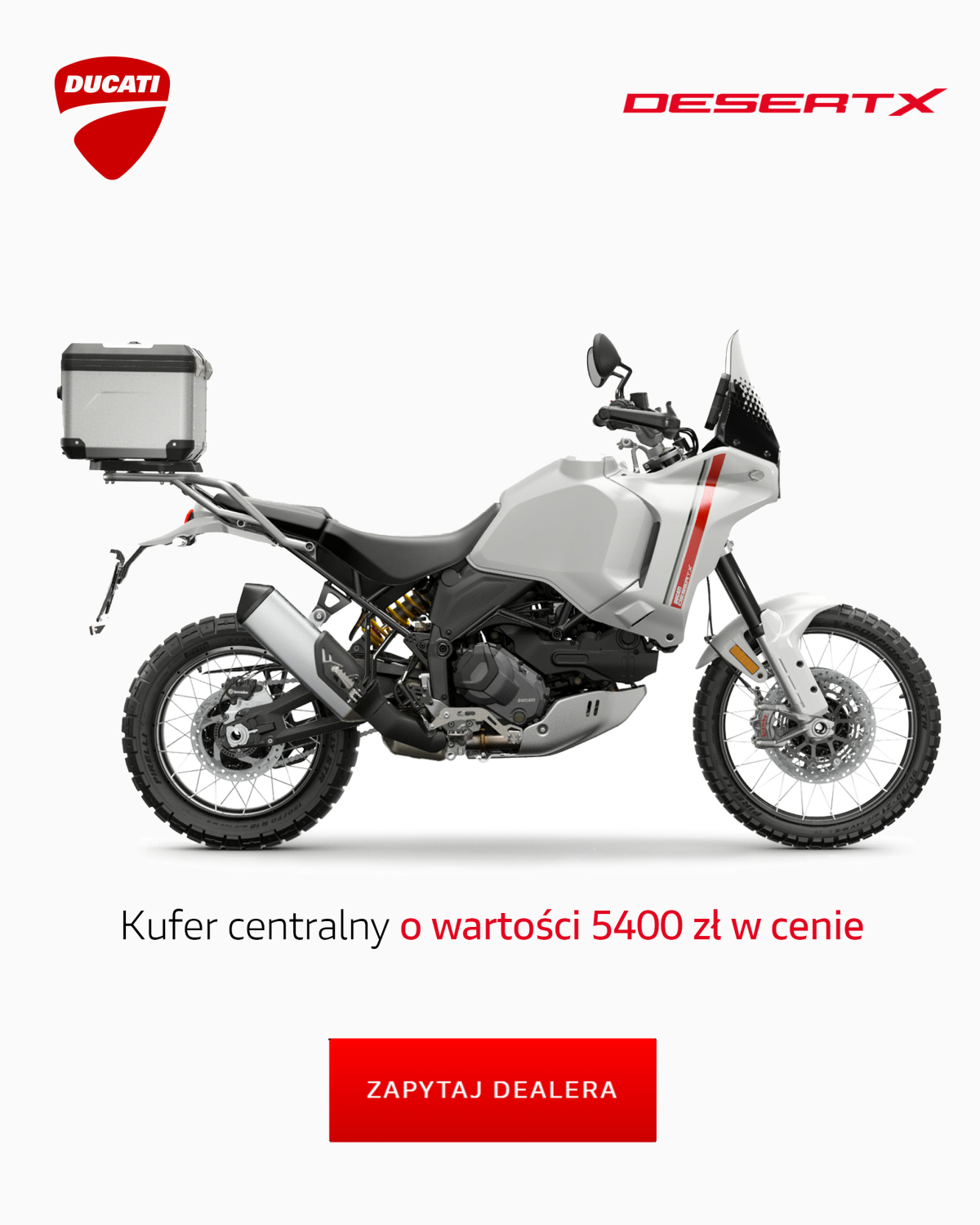 Do końca września bieżącego roku skorzystaj z oferty specjalnej na modele DesertX i DesertX Rally. Do każdego zakupionego nowego motocykla dodajemy aluminiowy kufer centralny wraz ze stelażem montażowym w cenie – bez żadnych dodatkowych kosztów!