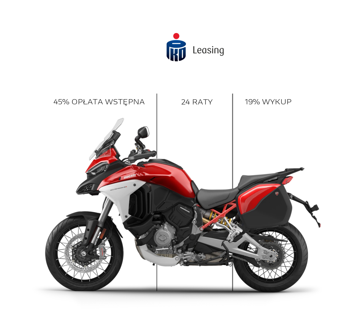 Promocja trwa od 26 kwietnia 2024 roku i obejmuje wszystkie umowy leasingowe zawarte do dnia 31 maja 2024 roku. Oferta dotyczy wyłącznie nowych motocykli Ducati Multistrada V4 S, Multistrada V4 Rally i Multistrada V4 Pikes Peak, które standardowo objęte są 4-letnią gwarancją fabryczną bez limitu kilometrów. Niniejsza informacja nie stanowi oferty w rozumieniu art. 66 i następnych kodeksu cywilnego. Zawarcie umowy leasingu uzależnione jest od akceptacji transakcji przez PKO Leasing S.A.