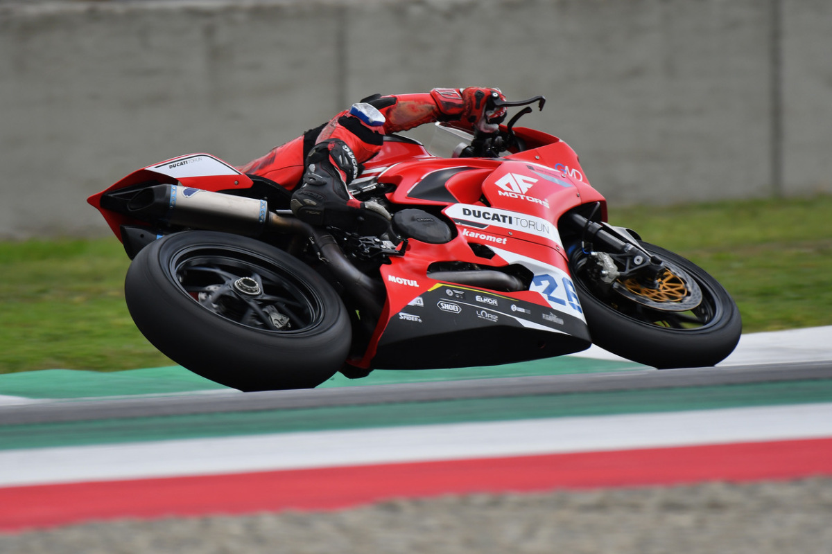 Obydwaj zawodnicy zespołu AF Racing Ducati Toruń zaliczyli bardzo udany start, szybko przebijając się do przodu. Po pierwszym okrążeniu Daniel Blin przesunął się na jedenastą, zaś Mateusz Hulewicz - na czternastą pozycję. Po kilku okrążeniach tor zaczął przesychać. Przy pogodowej ruletce jaką zaserwowało zawodnikom Mugello, wybór opon okazał się mieć decydujące znaczenie. Połowa stawki w klasie Supersport NG stanęła do rywalizacji na deszczowym ogumieniu, cała reszta na slickach. W przypadku Mateusza zespół postawił na opony przejściowe, Danielowi założono deszczowe. Ten wybór okazał się niezwykle trafny. Swoje zrobili też zawodnicy, którzy mimo zmieniającej się przyczepności, doskonale radzili sobie aż do końca tego wyścigu. Mateusz Hulewicz zakończył go na wyśmienitej dziewiątej pozycji, zaś Daniel Blin na dziesiątej, będąc przy tym pierwszym zawodnikiem, który dojechał do mety na oponach deszczowych.