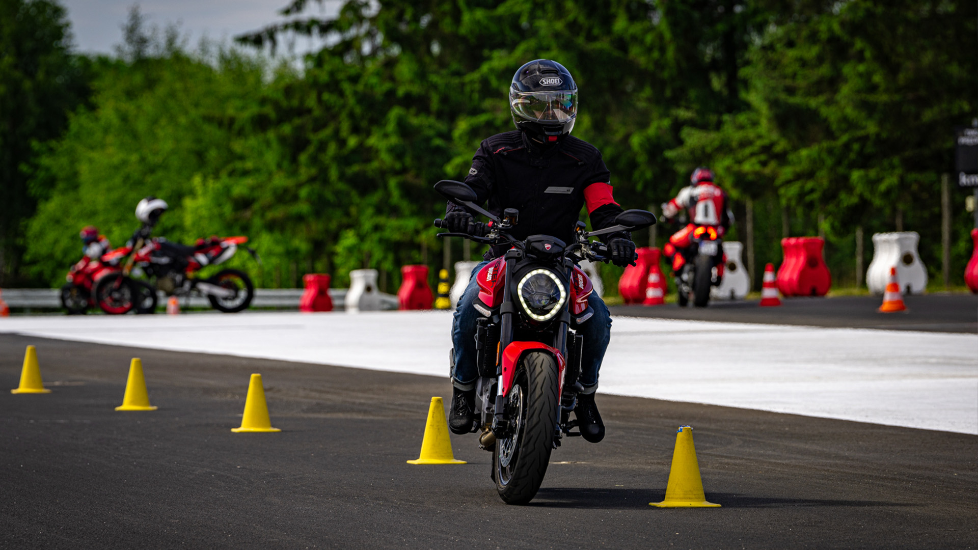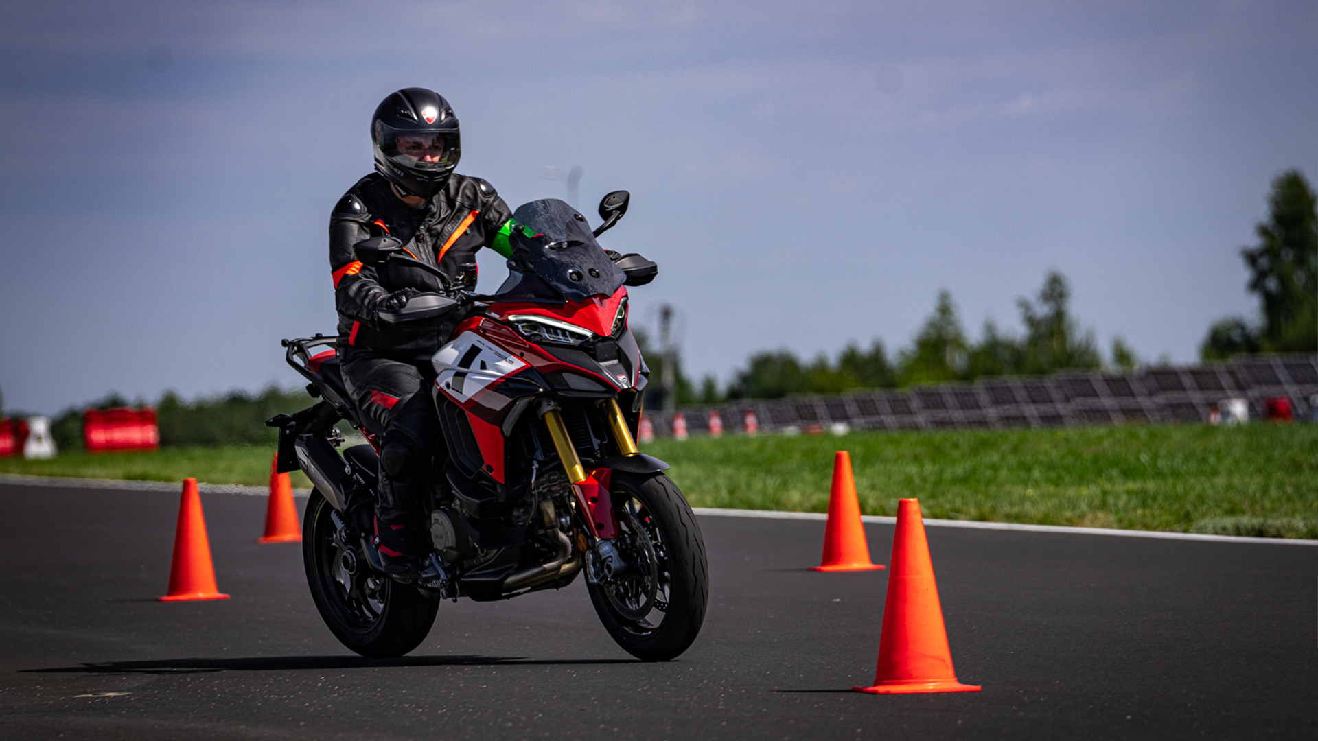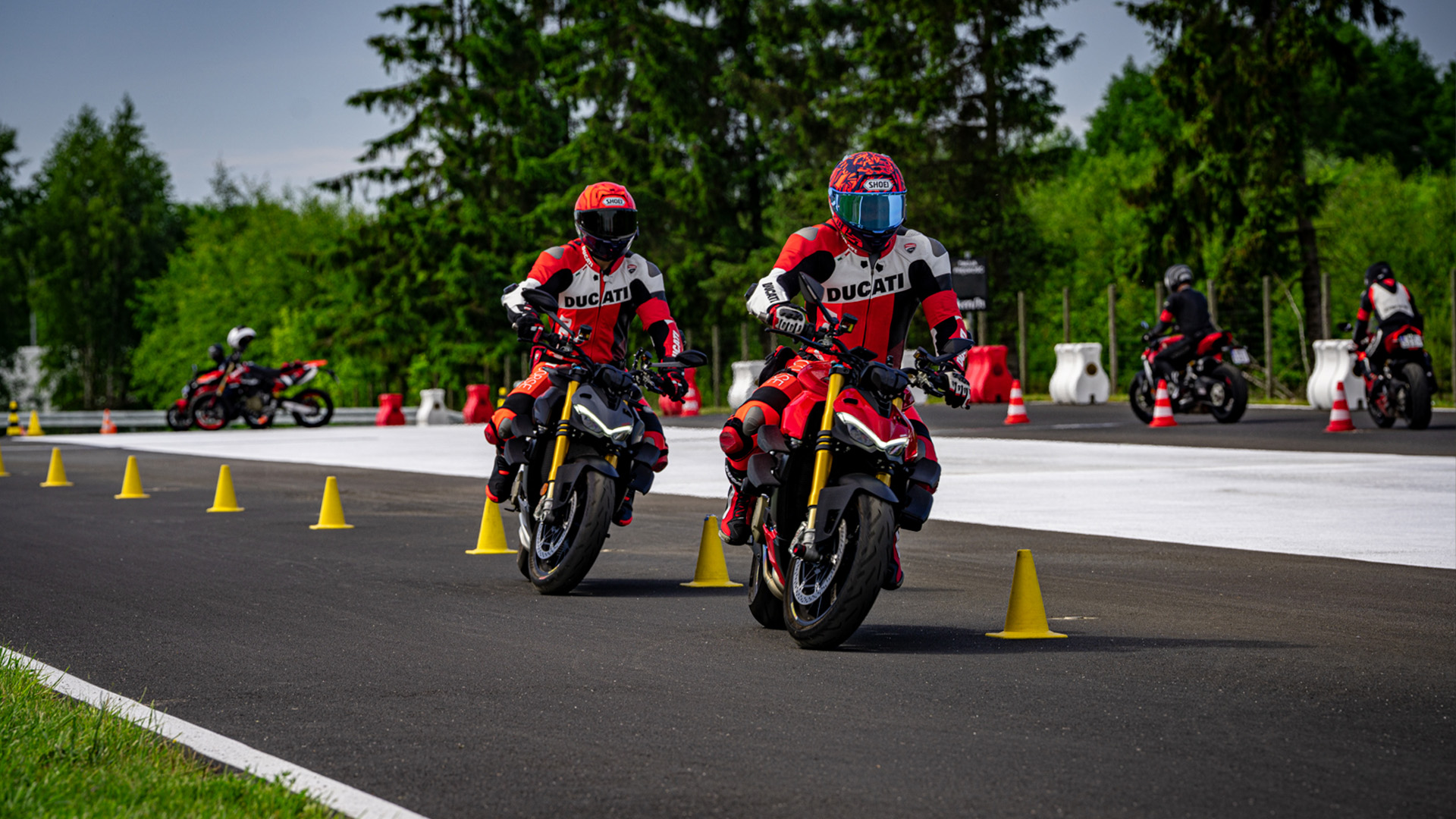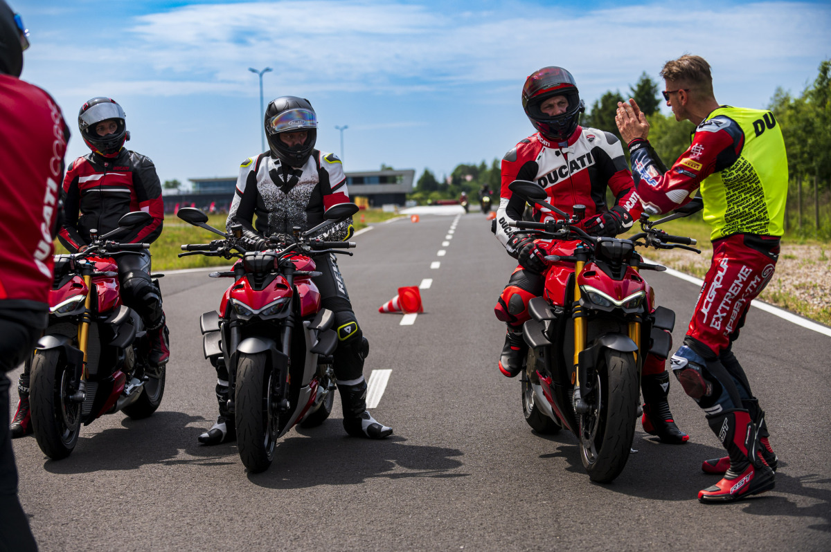 W bezpiecznych warunkach, na doskonałym i przyczepnym asfalcie oraz pod czujnym okiem profesjonalnej kadry szkoleniowej uczestnicy ćwiczyli między innymi przyjmowanie właściwej pozycji na motocyklu, a także odpowiedniego kierunku patrzenia w zakręt. Była to też doskonała okazja, aby móc poćwiczyć operowanie sprzęgłem i tylnym hamulcem podczas zawracania przy niskiej prędkości oraz na wolnym slalomie. Osoby szkolące się mogły również zaznajomić się z działaniem systemów elektronicznych podczas awaryjnego hamowania na prostej, w zakręcie, a także z ominięciem przeszkody. Uzasadniony niepokój budziła początkowo próba hamowania na asfalcie pokrytym piachem. Po kilku wykonanych seriach, stosując się do uwag instruktorów, piaskowa przeszkoda przestawała jednak przerażać uczestników. Niewielu motocyklistów zdecydowałoby się na wykonanie gwałtownego hamowania na zapiaszczonym odcinku drogi, dlatego było to niezwykle cenne doświadczenie. Odpowiednią pozycję na motocyklu Ducatisti – i nie tylko, trenowali również podczas szybkiego slalomu, a na sekcji kilku zakrętów uczyli się dobierać optymalną linię przejazdu po torze.