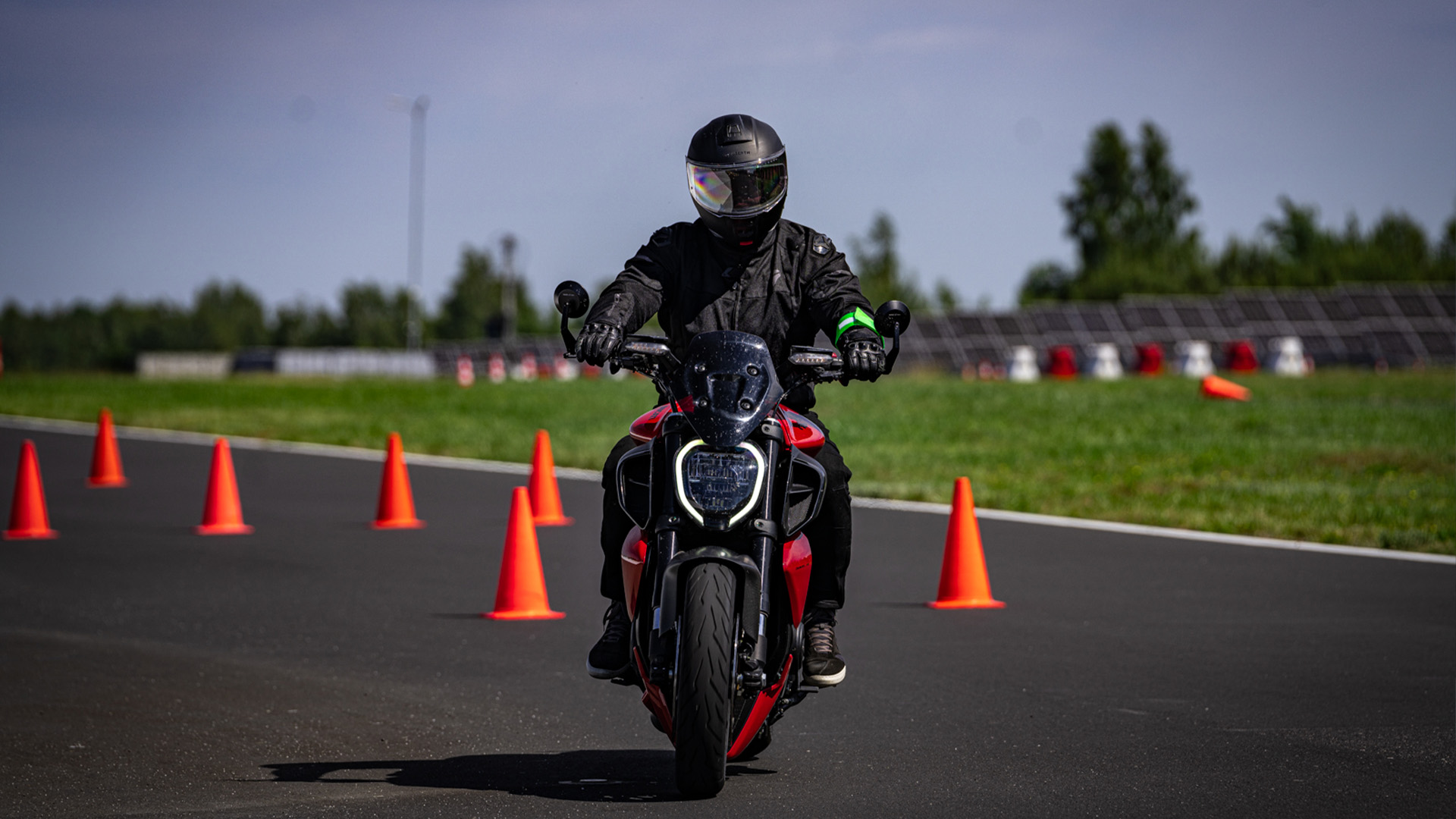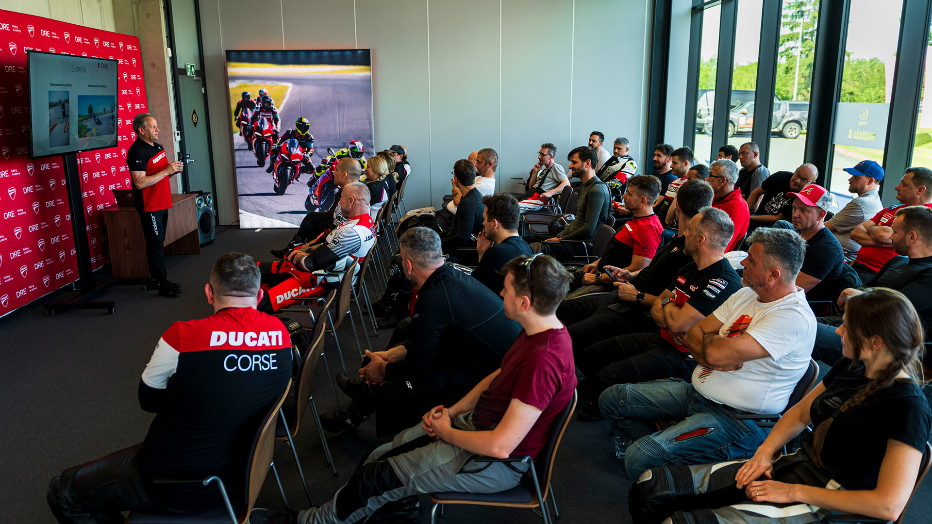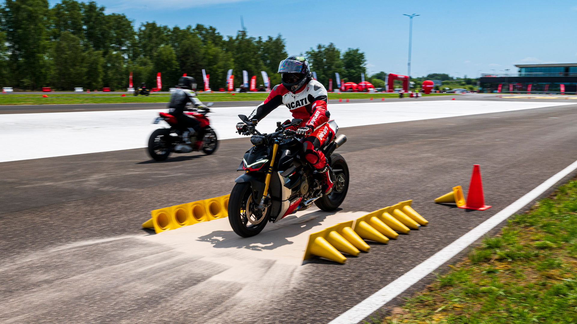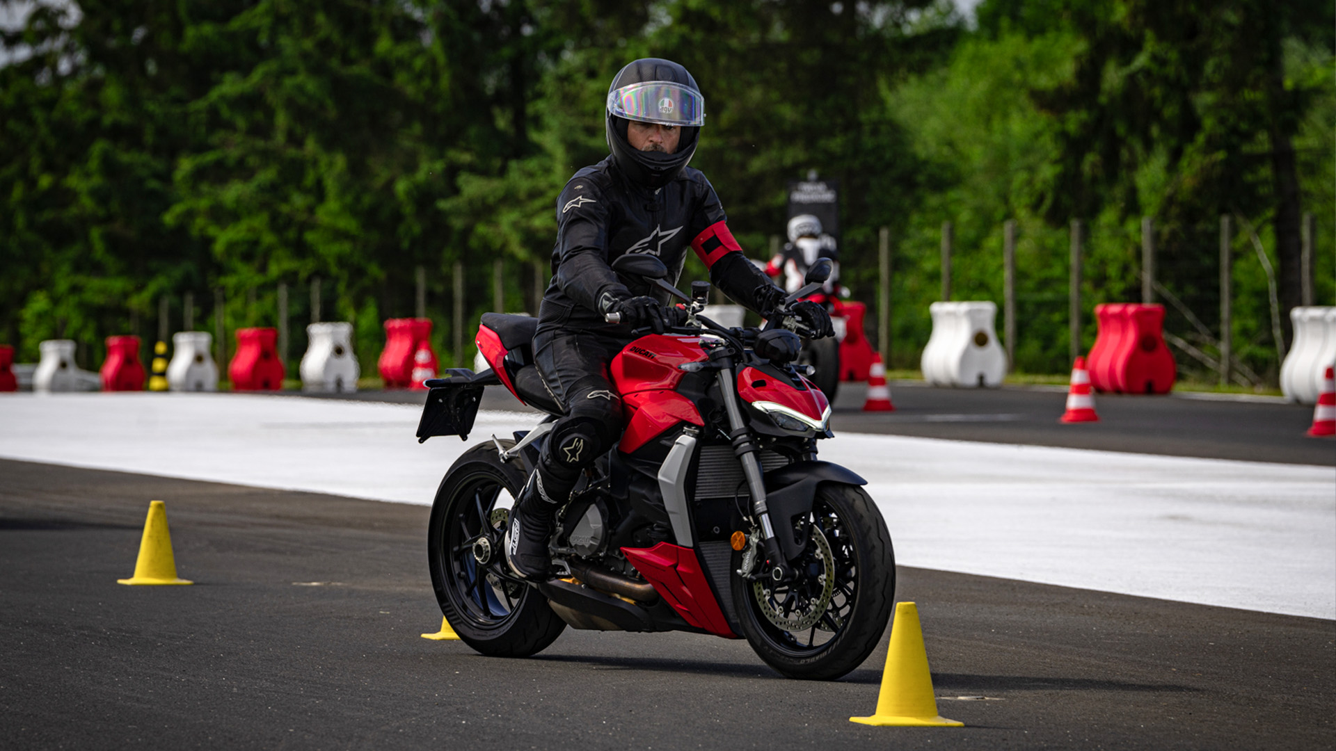 W bezpiecznych warunkach, na doskonałym i przyczepnym asfalcie oraz pod czujnym okiem profesjonalnej kadry szkoleniowej uczestnicy ćwiczyli między innymi przyjmowanie właściwej pozycji na motocyklu, a także odpowiedniego kierunku patrzenia w zakręt. Była to też doskonała okazja, aby móc poćwiczyć operowanie sprzęgłem i tylnym hamulcem podczas zawracania przy niskiej prędkości oraz na wolnym slalomie. Osoby szkolące się mogły również zaznajomić się z działaniem systemów elektronicznych podczas awaryjnego hamowania na prostej, w zakręcie, a także z ominięciem przeszkody. Uzasadniony niepokój budziła początkowo próba hamowania na asfalcie pokrytym piachem. Po kilku wykonanych seriach, stosując się do uwag instruktorów, piaskowa przeszkoda przestawała jednak przerażać uczestników. Niewielu motocyklistów zdecydowałoby się na wykonanie gwałtownego hamowania na zapiaszczonym odcinku drogi, dlatego było to niezwykle cenne doświadczenie. Odpowiednią pozycję na motocyklu Ducatisti – i nie tylko, trenowali również podczas szybkiego slalomu, a na sekcji kilku zakrętów uczyli się dobierać optymalną linię przejazdu po torze.