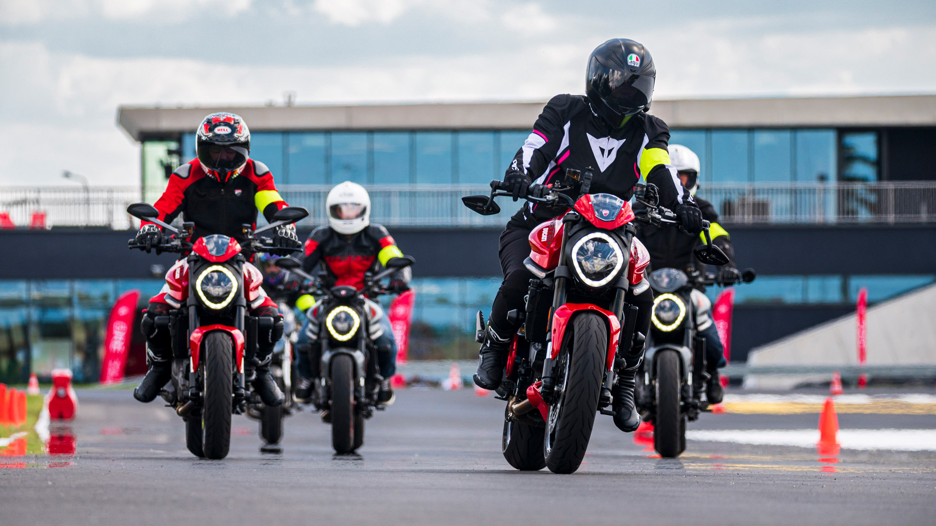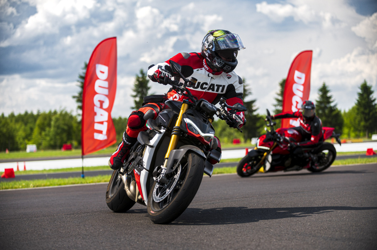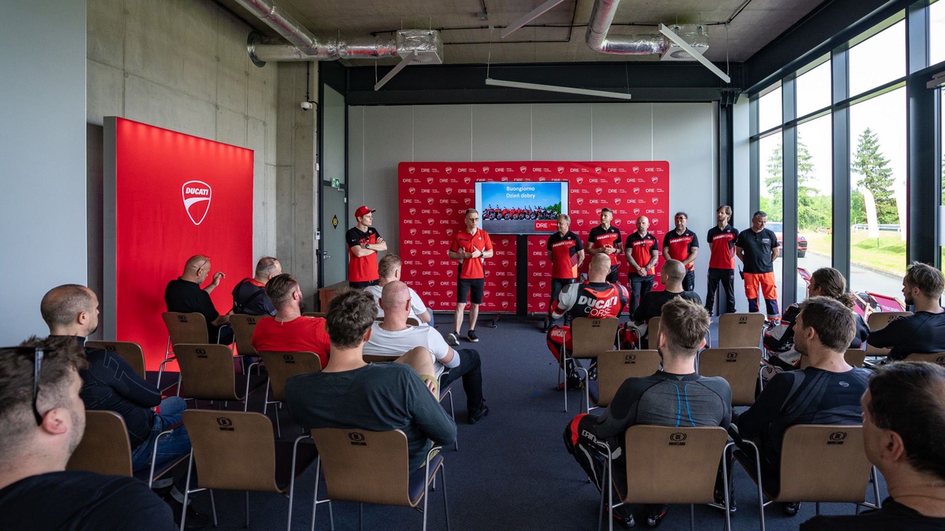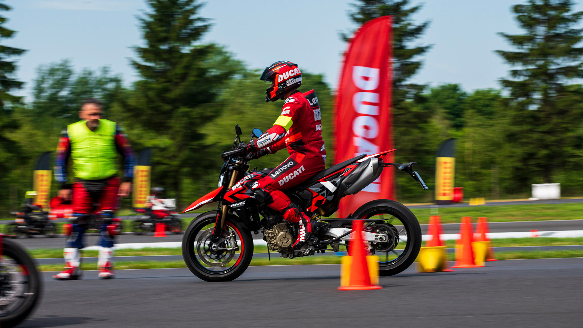 W bezpiecznych warunkach, na doskonałym i przyczepnym asfalcie oraz pod czujnym okiem profesjonalnej kadry szkoleniowej uczestnicy ćwiczyli między innymi przyjmowanie właściwej pozycji na motocyklu, a także odpowiedniego kierunku patrzenia w zakręt. Była to też doskonała okazja, aby móc poćwiczyć operowanie sprzęgłem i tylnym hamulcem podczas zawracania przy niskiej prędkości oraz na wolnym slalomie. Osoby szkolące się mogły również zaznajomić się z działaniem systemów elektronicznych podczas awaryjnego hamowania na prostej, w zakręcie, a także z ominięciem przeszkody. Uzasadniony niepokój budziła początkowo próba hamowania na asfalcie pokrytym piachem. Po kilku wykonanych seriach, stosując się do uwag instruktorów, piaskowa przeszkoda przestawała jednak przerażać uczestników. Niewielu motocyklistów zdecydowałoby się na wykonanie gwałtownego hamowania na zapiaszczonym odcinku drogi, dlatego było to niezwykle cenne doświadczenie. Odpowiednią pozycję na motocyklu Ducatisti – i nie tylko, trenowali również podczas szybkiego slalomu, a na sekcji kilku zakrętów uczyli się dobierać optymalną linię przejazdu po torze.