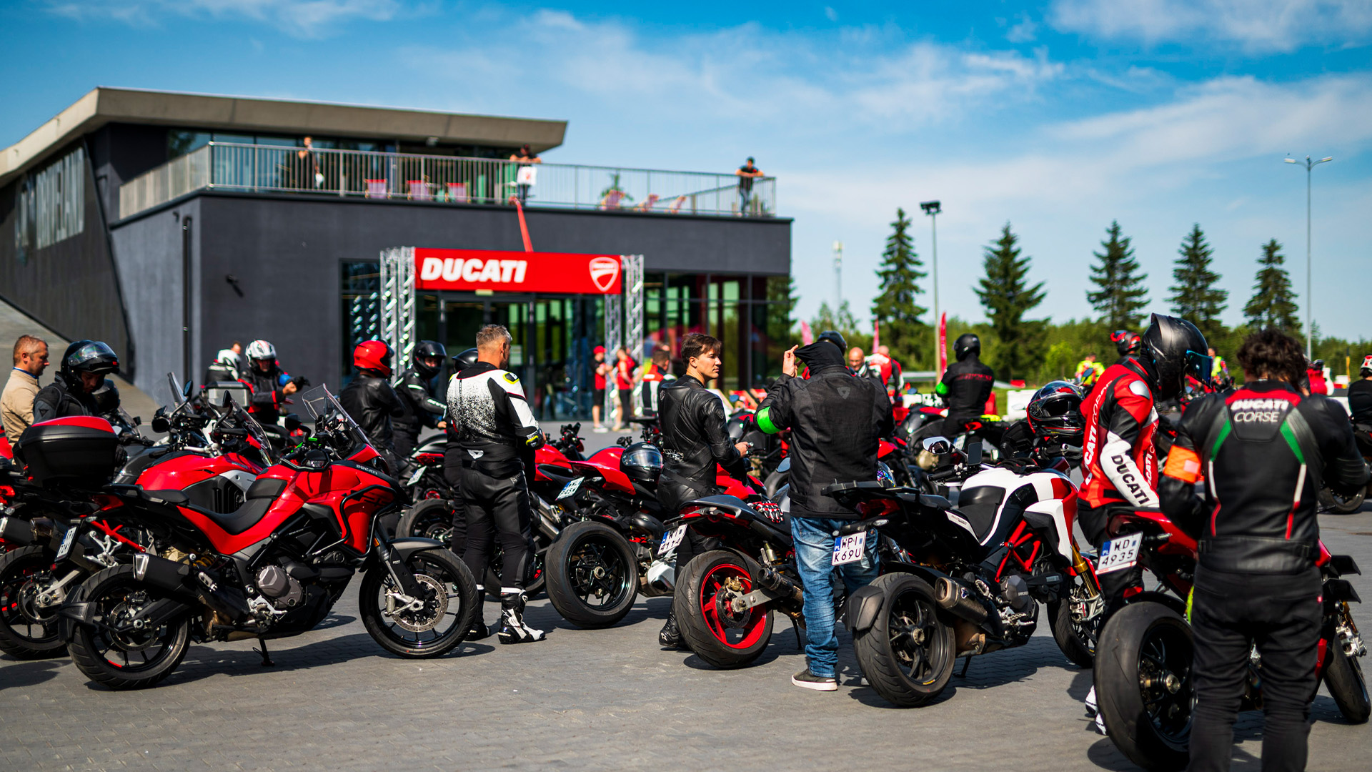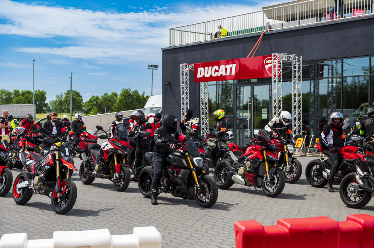 Niedzielne szkolenie Ducati Riding Experience Road Academy po raz pierwszy w Polsce odbyło się w formule dnia otwartego. Do jednej z grup szkoleniowych zaprosiliśmy też motocyklistów posiadających motocykle innych marek niż Ducati. Wszyscy uczestnicy mieli możliwość testowania szerokiej gamy modelowej, w tym tegorocznych nowości, jak Hypermotard 698 Mono i DesertX Rally. W niedzielę rano można było zobaczyć na torze wyjątkowe zestawienie limitowanego Ducati Diavel for Bentley oraz Bentleya Continental GT Speed Edition 12, a także limitowanego Ducati Diavel 1260 Lamborghini oraz Lamborghini Huracán STO, który jest jedynym takim egzemplarzem na świecie. Został skonfigurowany w programie Ad Personam i otrzymał między innymi lakier Verde Gea jak w limitowanym Lamborghini Sián FKP37 i Ducati Diavel 1260 Lamborghini. Ten niecodzienny widok czterech przepięknych maszyn pobudzał bardziej niż kawa!