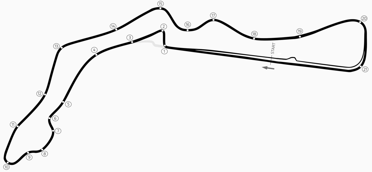21 zakrętów (9 lewych i 12 prawych)