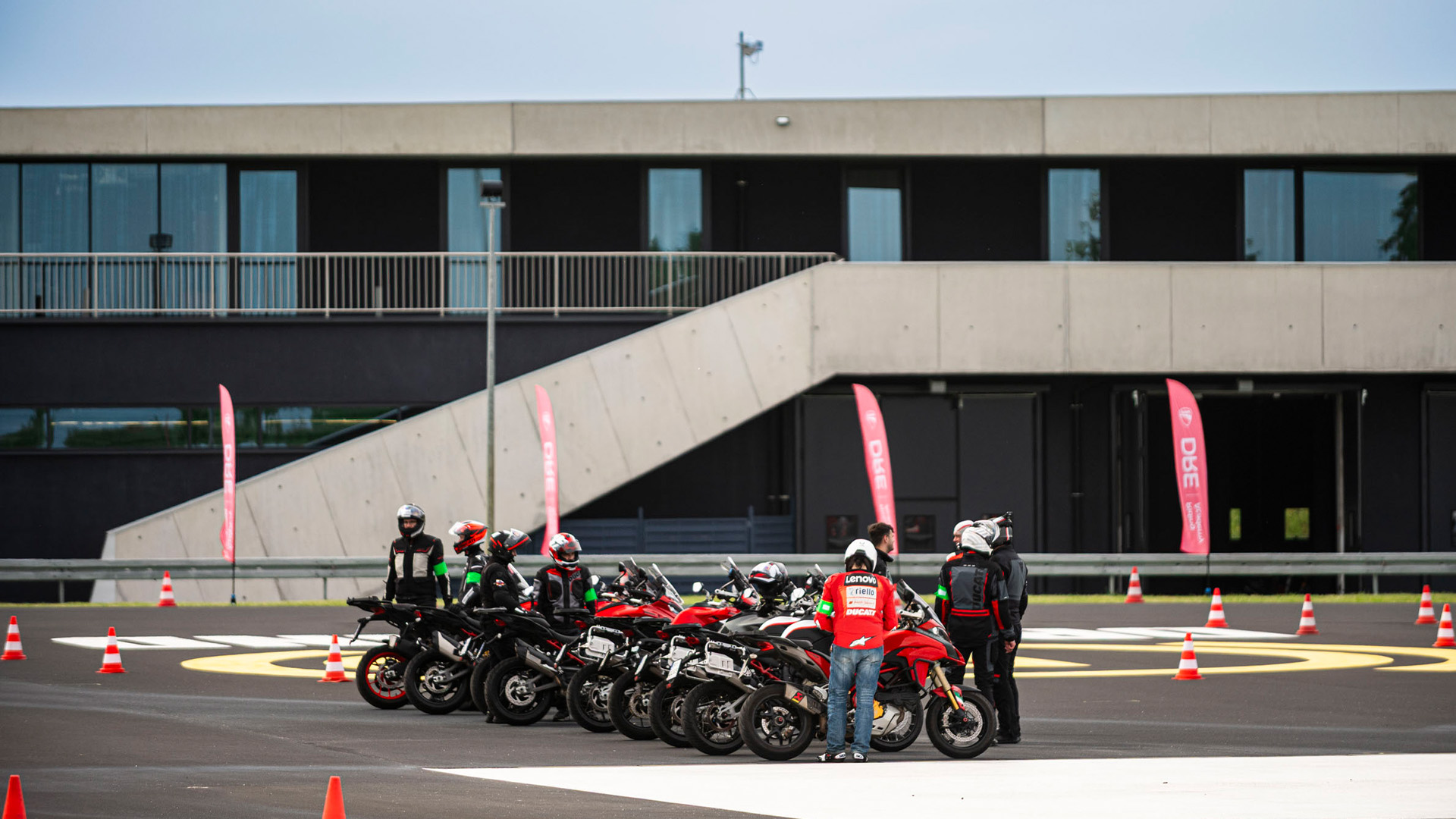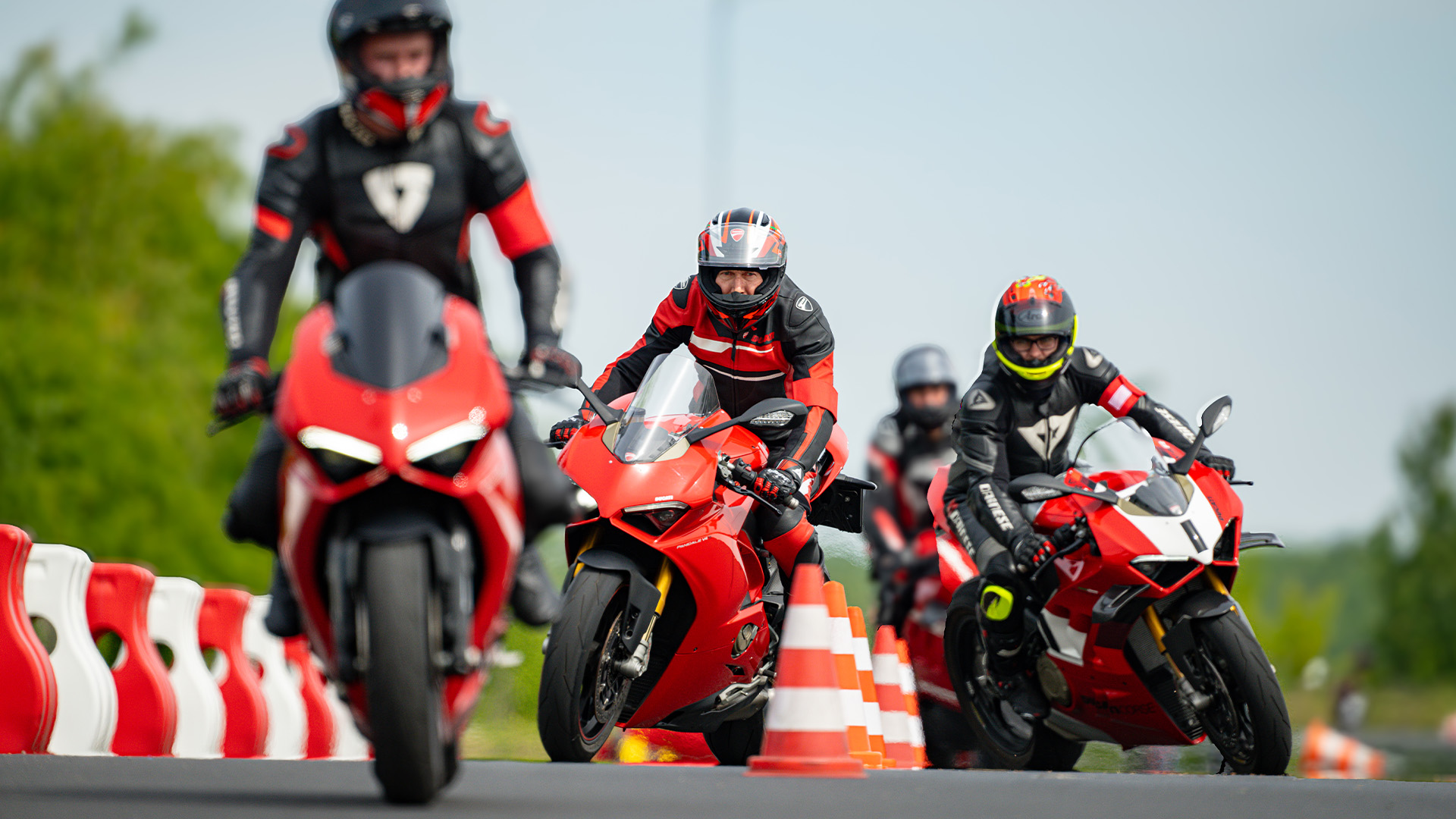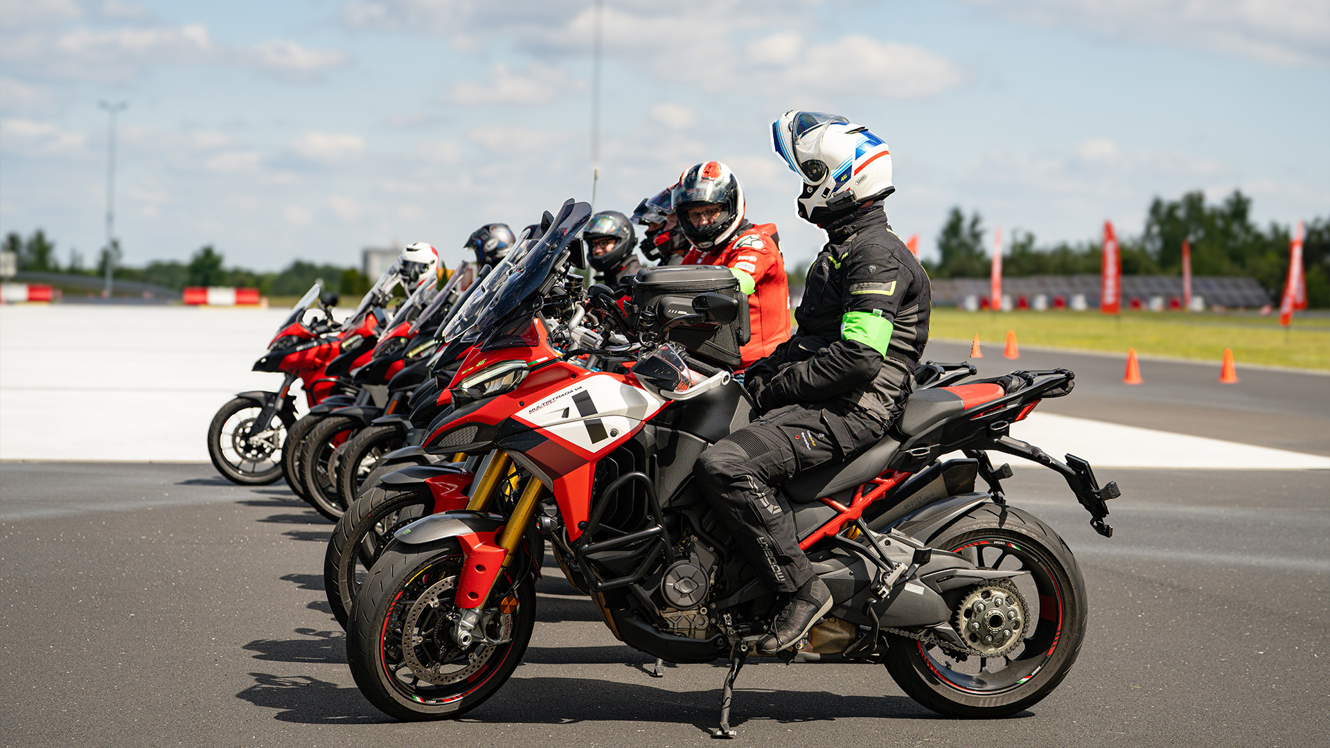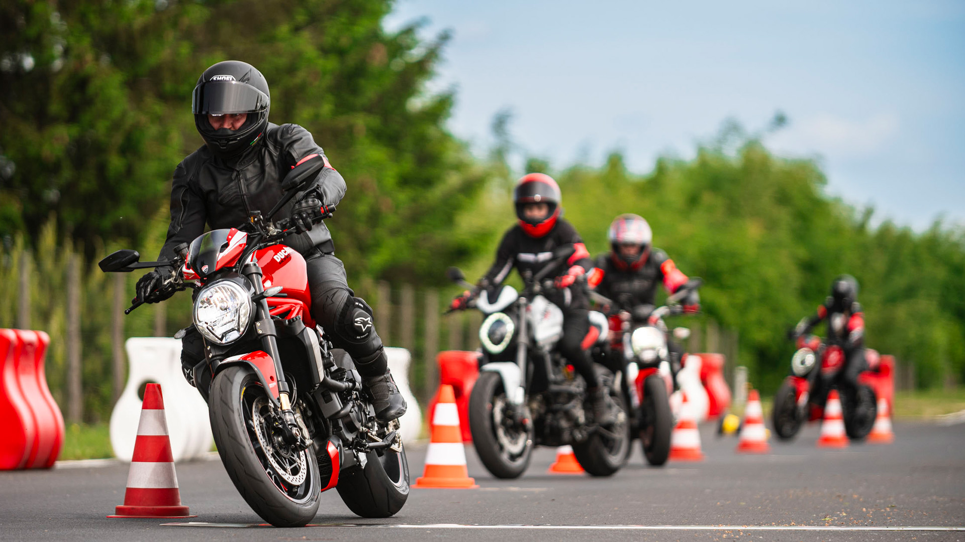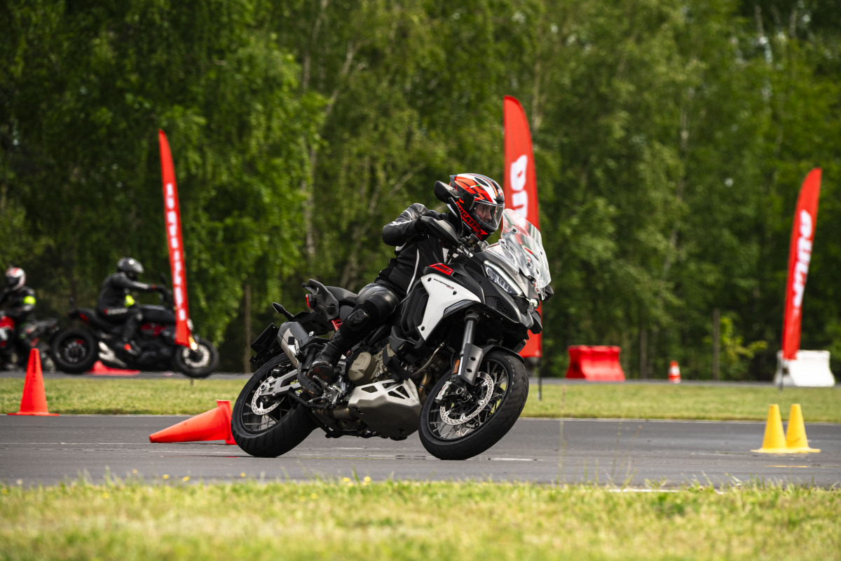 W bezpiecznych warunkach, na doskonałym i przyczepnym asfalcie oraz pod czujnym okiem profesjonalnej kadry szkoleniowej uczestnicy ćwiczyli między innymi przyjmowanie właściwej pozycji na motocyklu, a także odpowiedniego kierunku patrzenia w zakręt. Była to też doskonała okazja, aby móc poćwiczyć operowanie sprzęgłem i tylnym hamulcem podczas zawracania przy niskiej prędkości oraz na wolnym slalomie. Osoby szkolące się mogły również zaznajomić się z działaniem systemów elektronicznych podczas awaryjnego hamowania na prostej, w zakręcie, a także z ominięciem przeszkody. Uzasadniony niepokój budziła początkowo próba hamowania na asfalcie pokrytym piachem. Po kilku wykonanych seriach, stosując się do uwag instruktorów, piaskowa przeszkoda przestawała jednak przerażać uczestników. Niewielu motocyklistów zdecydowałoby się na wykonanie gwałtownego hamowania na zapiaszczonym odcinku drogi, dlatego było to niezwykle cenne doświadczenie. Odpowiednią pozycję na motocyklu Ducatisti – i nie tylko, trenowali również podczas szybkiego slalomu, a na sekcji kilku zakrętów uczyli się dobierać optymalną linię przejazdu po torze.