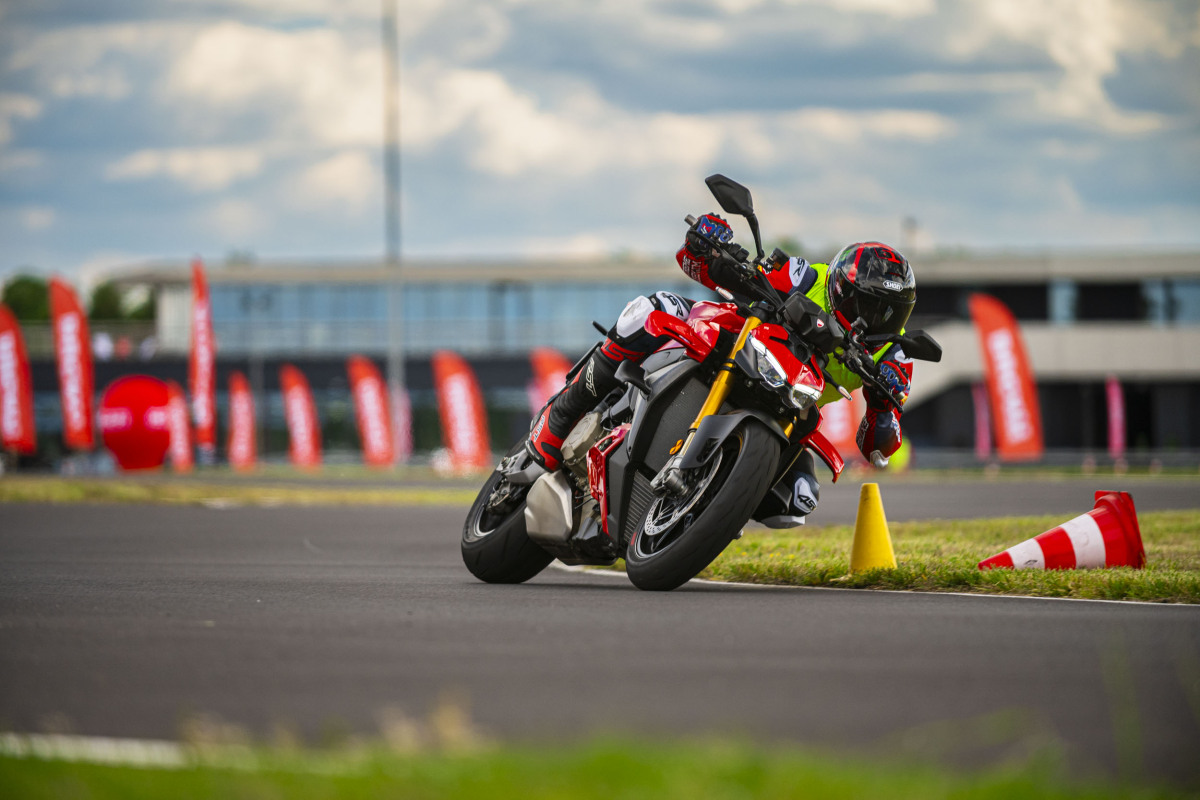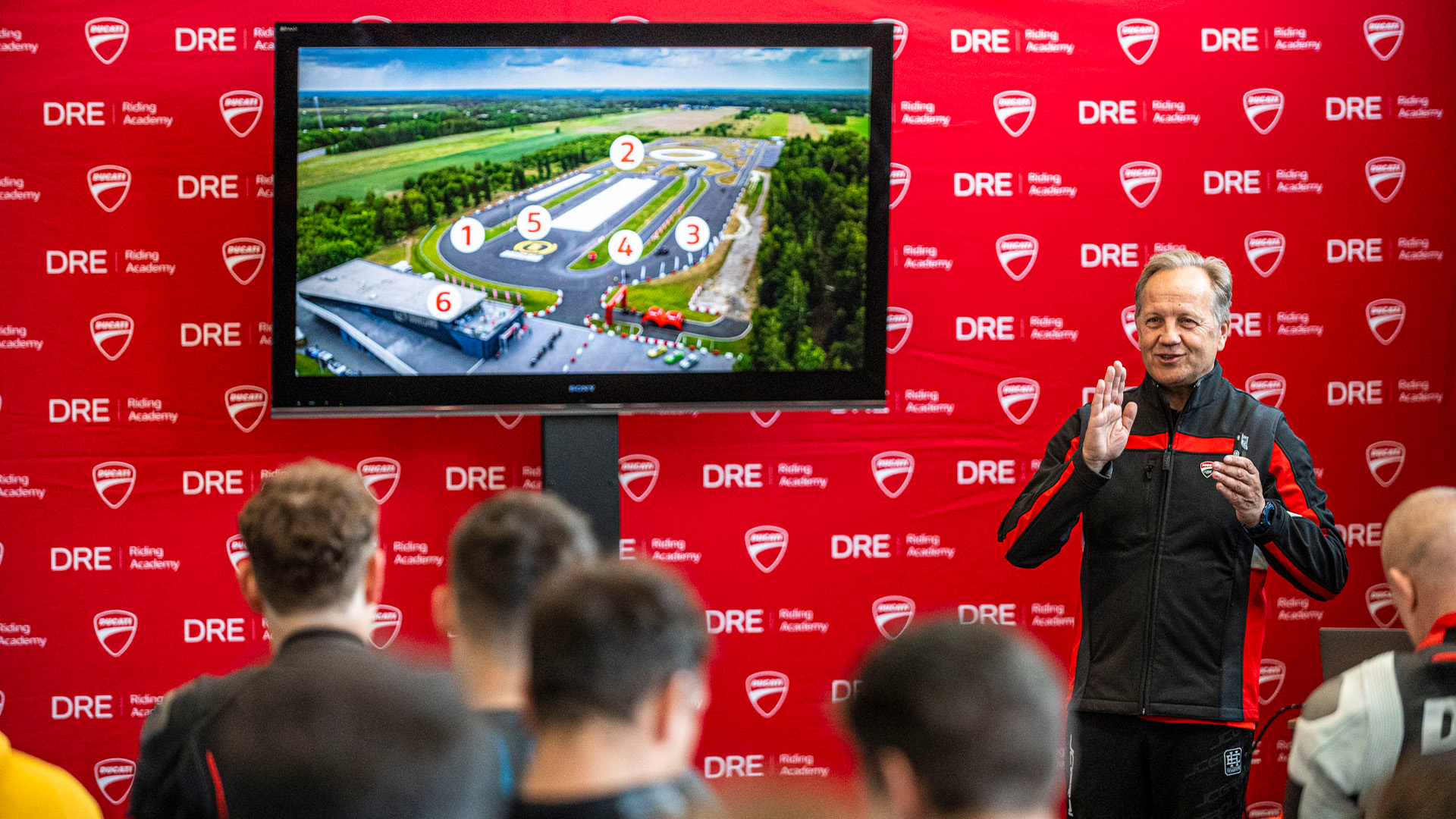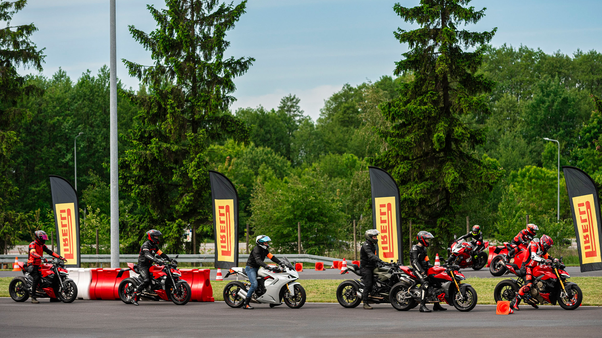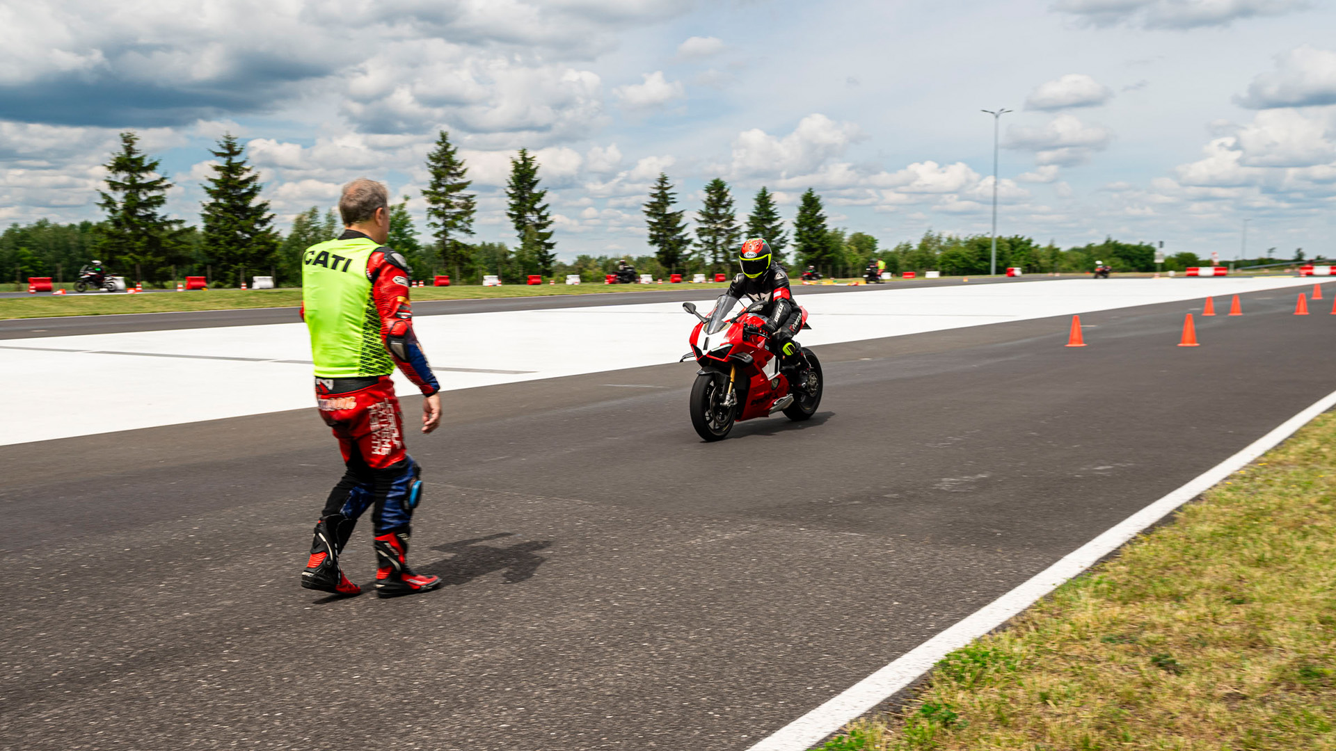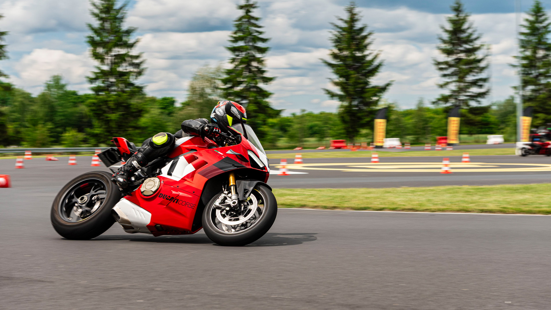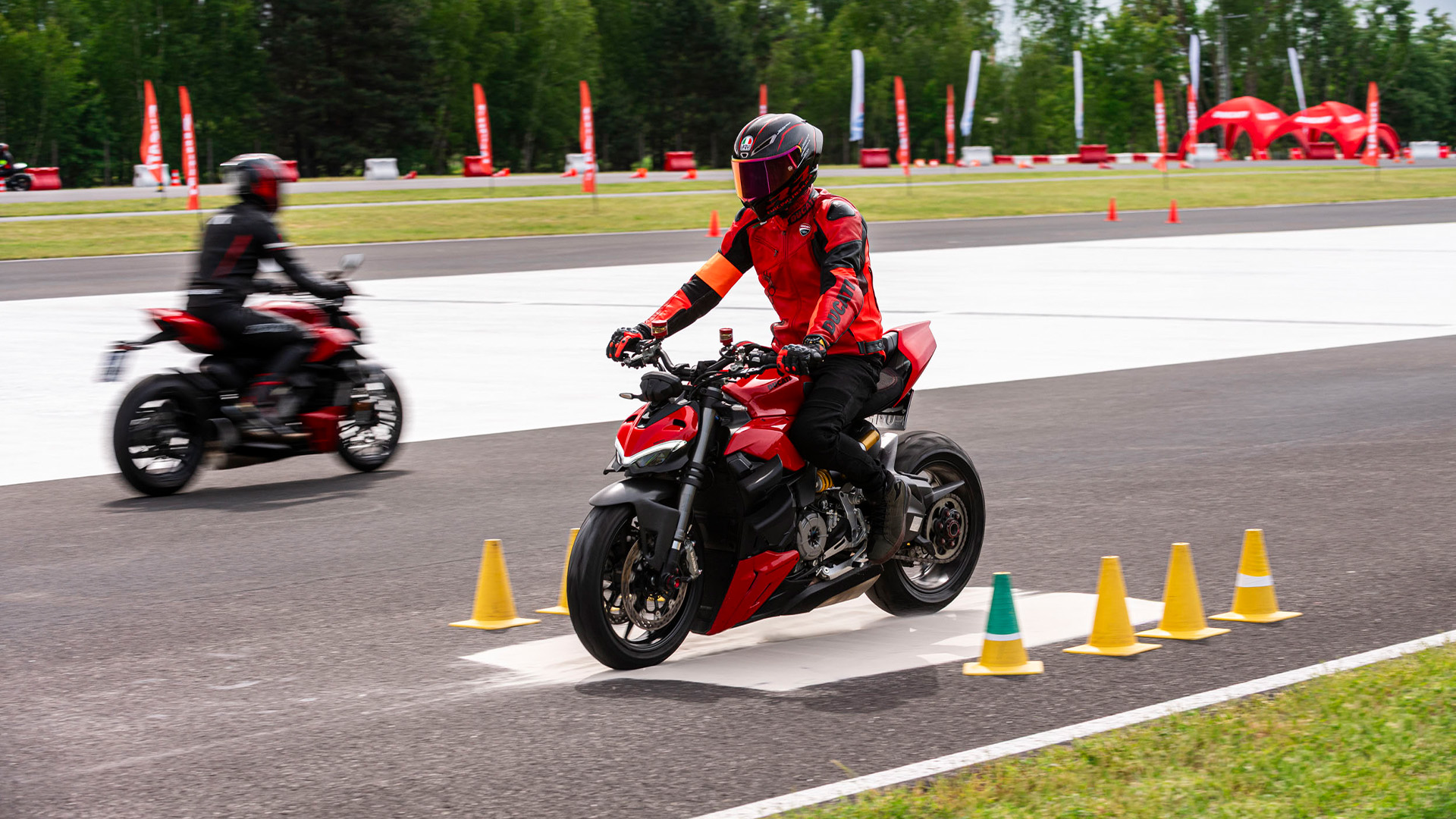 W bezpiecznych warunkach, na doskonałym i przyczepnym asfalcie oraz pod czujnym okiem profesjonalnej kadry szkoleniowej uczestnicy ćwiczyli między innymi przyjmowanie właściwej pozycji na motocyklu, a także odpowiedniego kierunku patrzenia w zakręt. Była to też doskonała okazja, aby móc poćwiczyć operowanie sprzęgłem i tylnym hamulcem podczas zawracania przy niskiej prędkości oraz na wolnym slalomie. Osoby szkolące się mogły również zaznajomić się z działaniem systemów elektronicznych podczas awaryjnego hamowania na prostej, w zakręcie, a także z ominięciem przeszkody. Uzasadniony niepokój budziła początkowo próba hamowania na asfalcie pokrytym piachem. Po kilku wykonanych seriach, stosując się do uwag instruktorów, piaskowa przeszkoda przestawała jednak przerażać uczestników. Niewielu motocyklistów zdecydowałoby się na wykonanie gwałtownego hamowania na zapiaszczonym odcinku drogi, dlatego było to niezwykle cenne doświadczenie. Odpowiednią pozycję na motocyklu Ducatisti – i nie tylko, trenowali również podczas szybkiego slalomu, a na sekcji kilku zakrętów uczyli się dobierać optymalną linię przejazdu po torze.