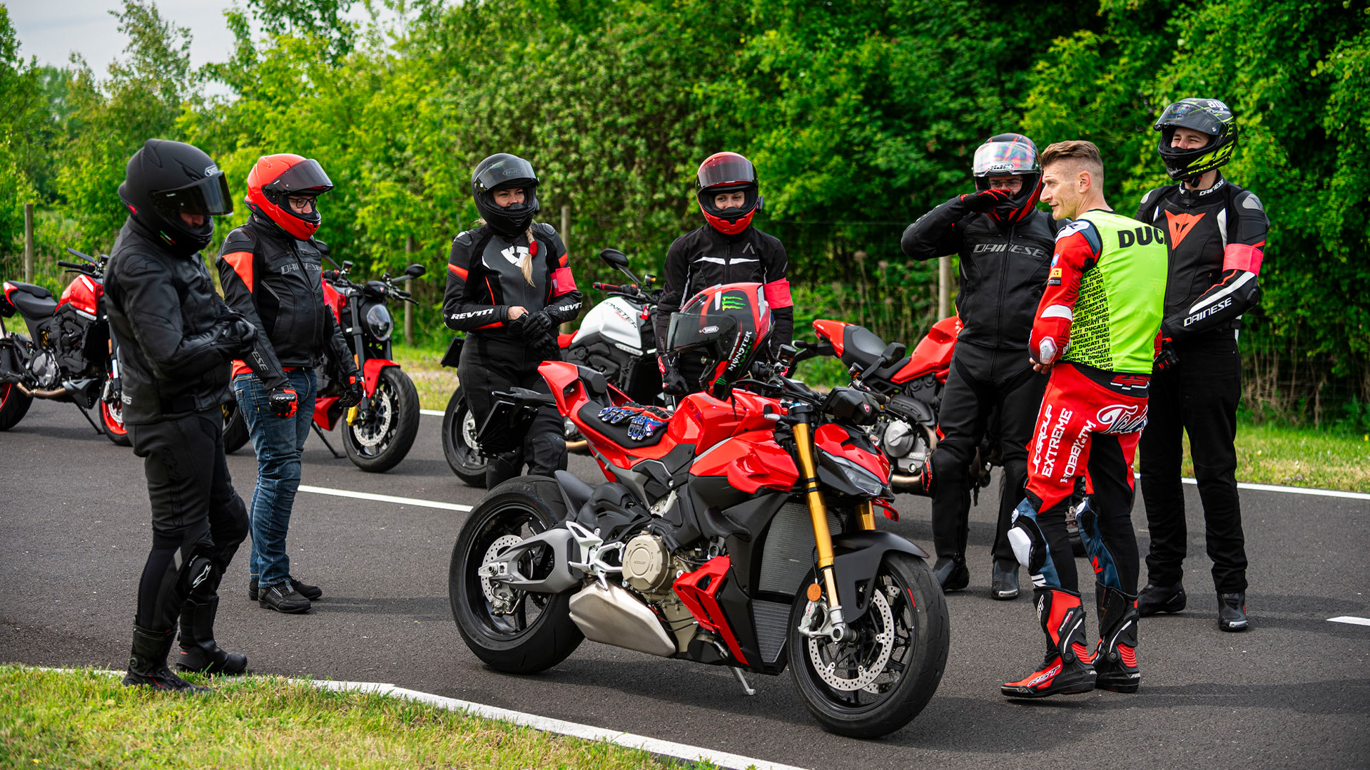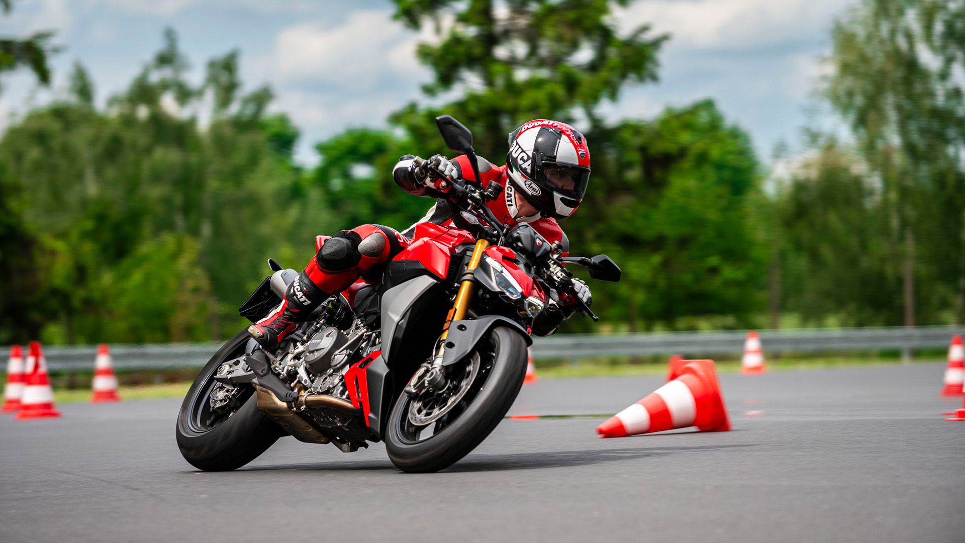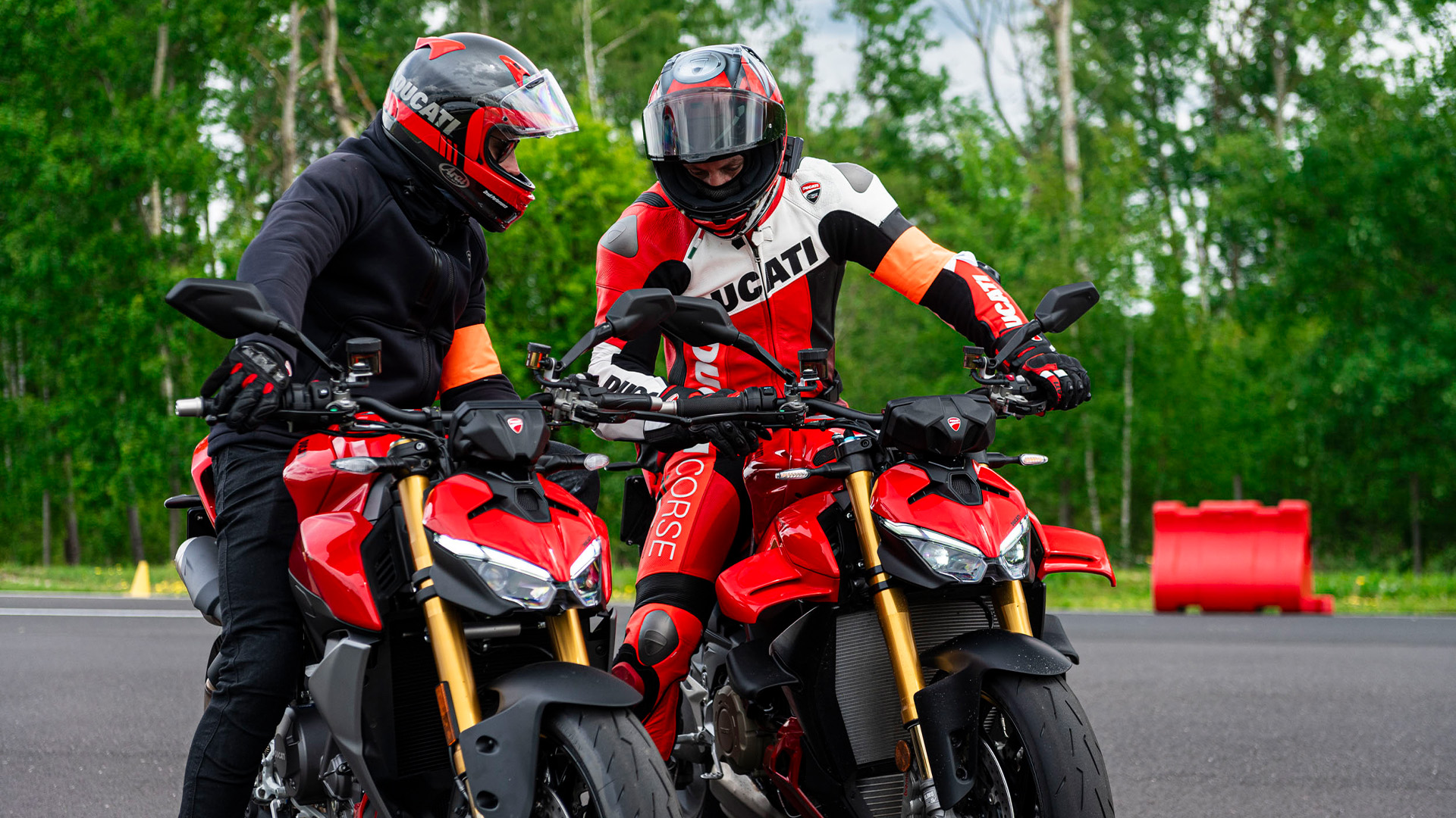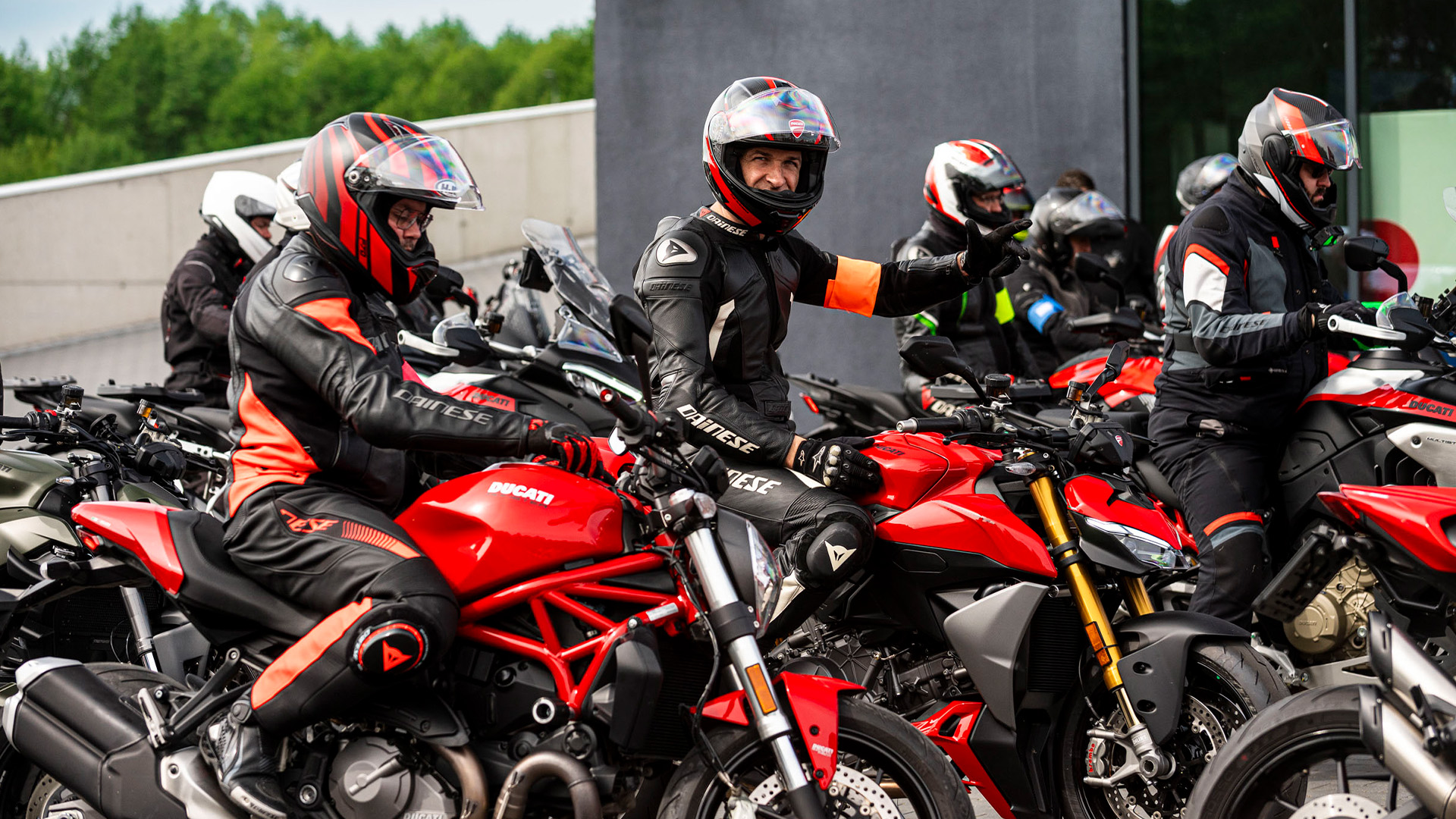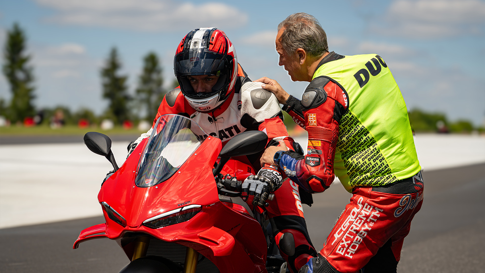 W bezpiecznych warunkach, na doskonałym i przyczepnym asfalcie oraz pod czujnym okiem profesjonalnej kadry szkoleniowej uczestnicy ćwiczyli między innymi przyjmowanie właściwej pozycji na motocyklu, a także odpowiedniego kierunku patrzenia w zakręt. Była to też doskonała okazja, aby móc poćwiczyć operowanie sprzęgłem i tylnym hamulcem podczas zawracania przy niskiej prędkości oraz na wolnym slalomie. Osoby szkolące się mogły również zaznajomić się z działaniem systemów elektronicznych podczas awaryjnego hamowania na prostej, w zakręcie, a także z ominięciem przeszkody. Uzasadniony niepokój budziła początkowo próba hamowania na asfalcie pokrytym piachem. Po kilku wykonanych seriach, stosując się do uwag instruktorów, piaskowa przeszkoda przestawała jednak przerażać uczestników. Niewielu motocyklistów zdecydowałoby się na wykonanie gwałtownego hamowania na zapiaszczonym odcinku drogi, dlatego było to niezwykle cenne doświadczenie. Odpowiednią pozycję na motocyklu Ducatisti – i nie tylko, trenowali również podczas szybkiego slalomu, a na sekcji kilku zakrętów uczyli się dobierać optymalną linię przejazdu po torze.