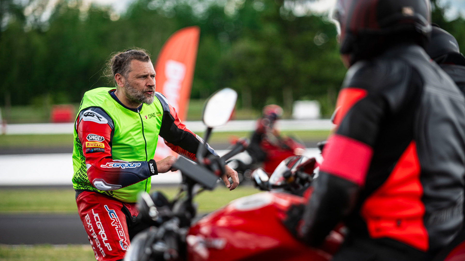 Weekend szkoleniowy w motoryzacyjnym centrum eventowo-szkoleniowym Driveland w sobotę i niedzielę rozpoczął się od odprawy, którą poprowadzili Tomasz Masłowski, Dyrektor Generalny Ducati Polska, a także Krystian Kaleta, PR i marketing Manager Ducati Polska. Oficjalnie powitali wszystkich uczestników, a także podziękowali stałym Partnerom cyklu DRE, czyli PKO Leasing oraz Pirelli Polska. Następnie Janusz Czaja, szef ekipy instruktorów JC Group, przypomniał o ważnych aspektach jazdy na motocyklu, a także pokrótce opowiedział o zadaniach, które zostały przygotowane na nadchodzące godziny. Uczestnicy podzielni na sześć grup w zależności od segmentu posiadanego motocykla, według szczegółowo zaplanowanego harmonogramu doskonalili technikę jazdy w poszczególnych sekcjach toru symulujących warunki drogowe, a także szkolili się z pierwszej pomocy dla motocyklistów.