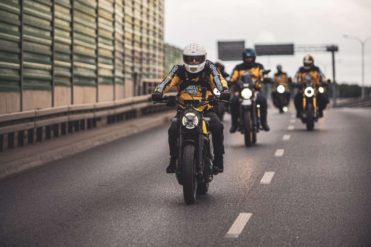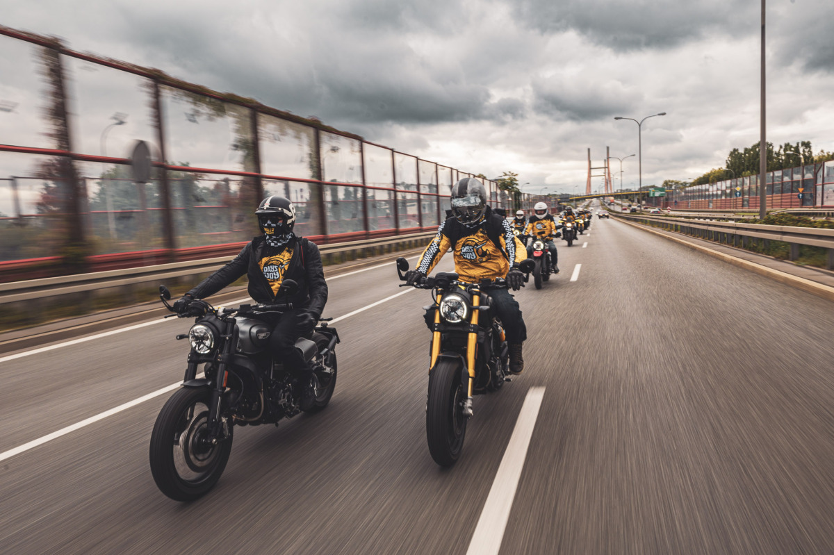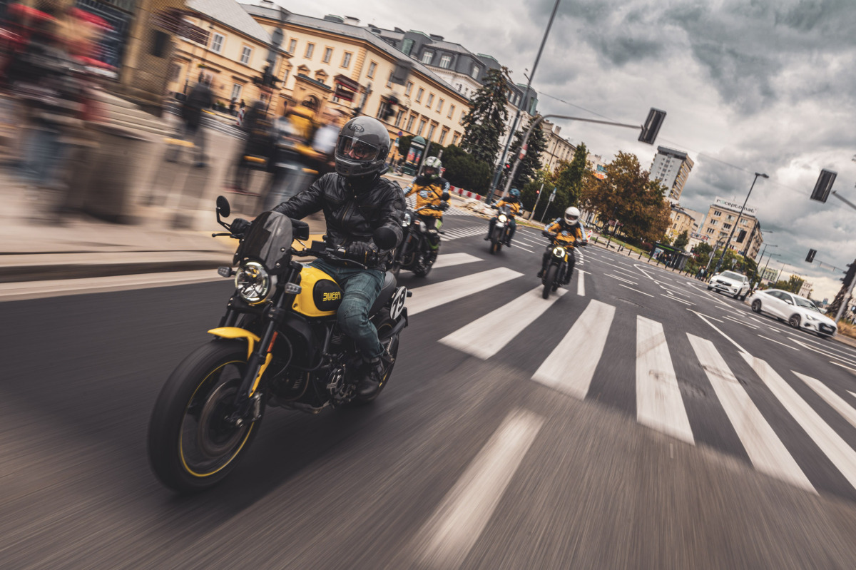 W sobotni poranek 17 września 2022 roku, w salonie Ducati Liberty Motors w Piasecznie zebrała się zgrana ekipa, która uczestniczyła w zeszłorocznym wydarzeniu Scrambler Yellow Day, a także nowi właściciele Scramblerów Ducati. Parking wypełniał się motocyklami, a my poznawaliśmy się pijąc kawę. Każdy z uczestników otrzymał koszulkę, której wzór zaprojektowany został specjalnie na to wydarzenie. Widniejący na plecach numer 62 jest oczywistym nawiązaniem do roku 1962, czyli najważniejszej daty w historii Scramblera. W spójnych strojach udało się nam utworzyć żółtą kolumnę, która zachwycała podczas przejazdu przez Warszawę. Parada była naszym sposobem na uczczenie sześćdziesięciolecia Scramblera.