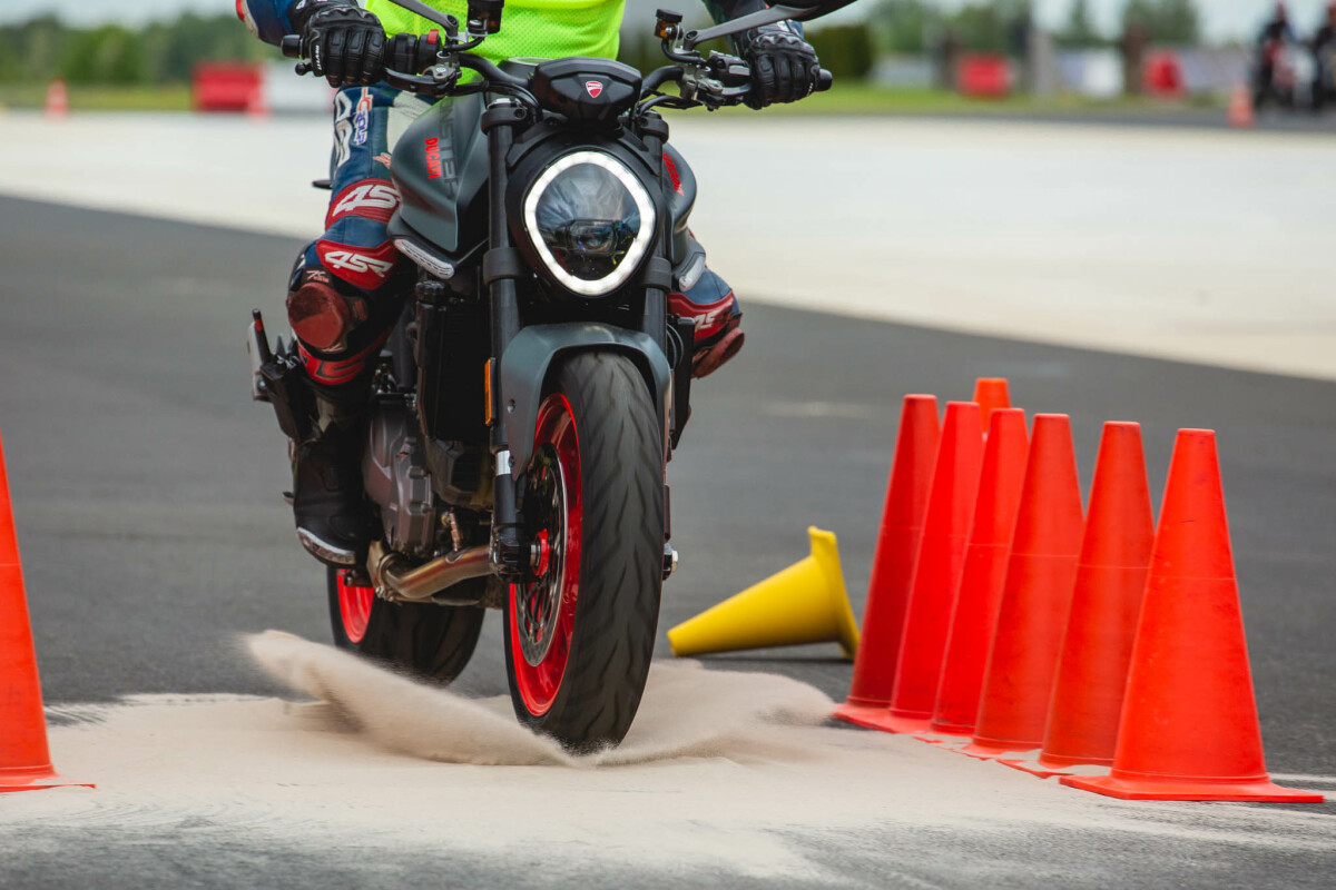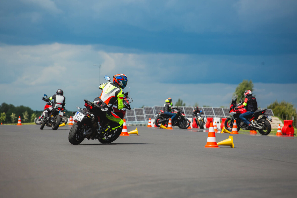 W bezpiecznych warunkach, na doskonałym i przyczepnym asfalcie oraz pod czujnym okiem profesjonalnej kadry szkoleniowej ćwiczyliśmy między innymi właściwą pozycję na motocyklu, a także odpowiedni kierunek patrzenia w zakręt. Początkowo trudności sprawiało zawracanie przy małej prędkości, czy wolny slalom, w którym trzeba było właściwie operować sprzęgłem i tylnym hamulcem, ale z każdą kolejną próbą nabieraliśmy coraz większej pewności. Zaznajamialiśmy się również z działaniem systemów elektronicznych podczas awaryjnego hamowania na prostej, w zakręcie, a także z ominięciem przeszkody. Duży niepokój budziła początkowo próba hamowania na asfalcie pokrytym piachem. Po kilku wykonanych seriach, stosując się do uwag instruktorów, przekonaliśmy się, że piaskowa przeszkoda nie jest tak przerażająca, jak wydawało się nam na początku. Niewielu motocyklistów zdecydowałoby się na wykonanie gwałtownego hamowania na zapiaszczonym odcinku drogi, dlatego było to niezwykle cenne doświadczenie. Odpowiednią pozycję na motocyklu trenowaliśmy też również podczas szybkiego slalomu, a na sekcji kilku zakrętów uczyliśmy się dobierania optymalnej linii przejazdu po torze.