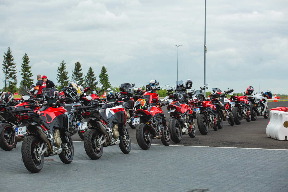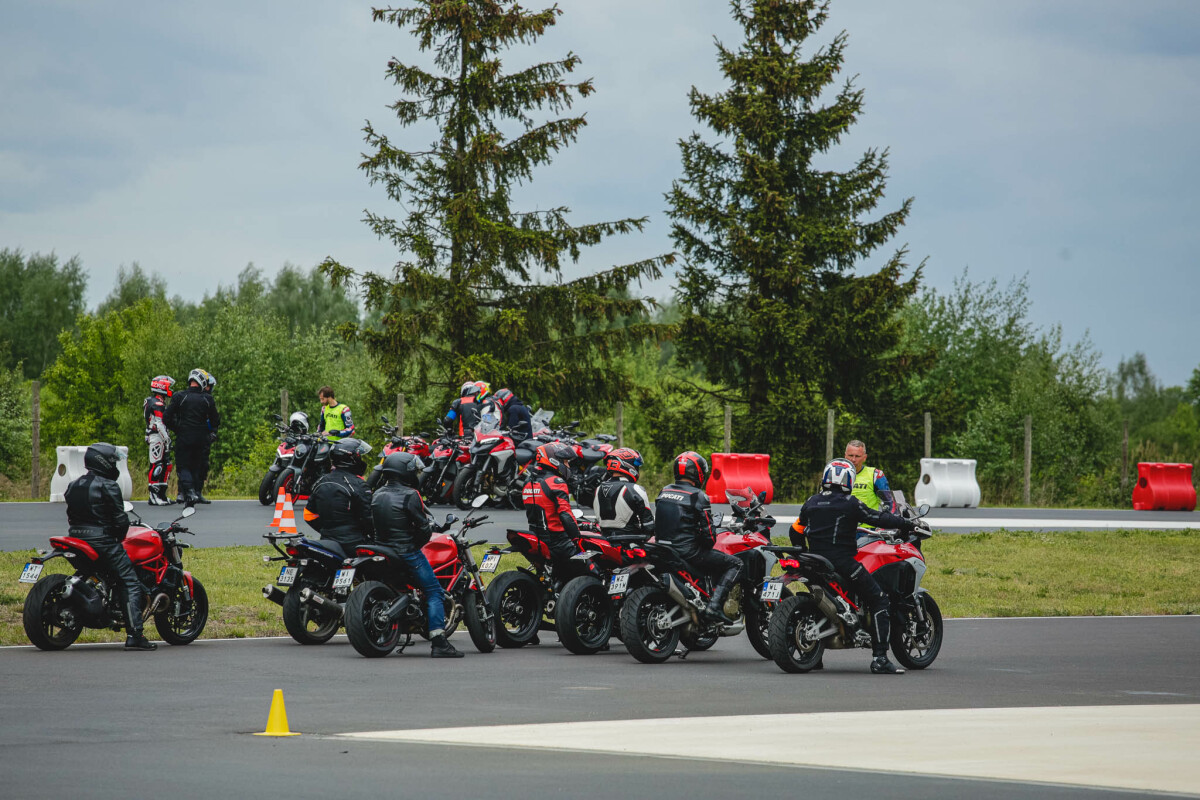 Sobotni i niedzielny poranek rozpoczęliśmy od odprawy, którą poprowadził Janusz Czaja. W części teoretycznej przypomniał o ważnych aspektach jazdy na motocyklu, a także pokrótce opowiedział o zadaniach, które zostały przygotowane na nadchodzące godziny. Następnie uczestnicy podzielni na pięć grup wsiedli na swoje Ducati i za instruktorami udali się w poszczególne sekcje toru, aby doskonalić technikę jazdy.