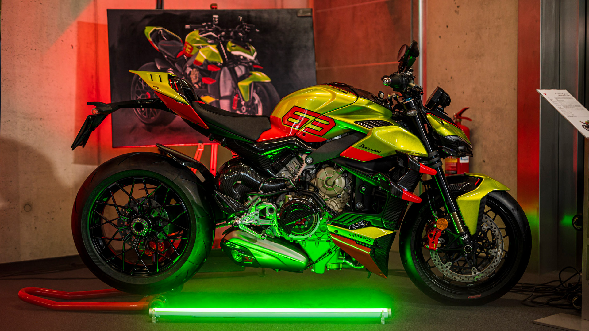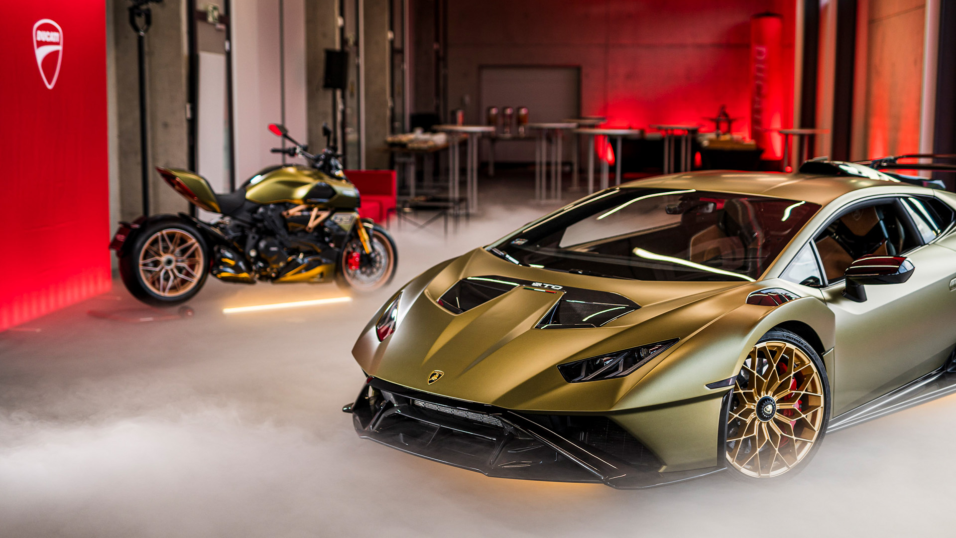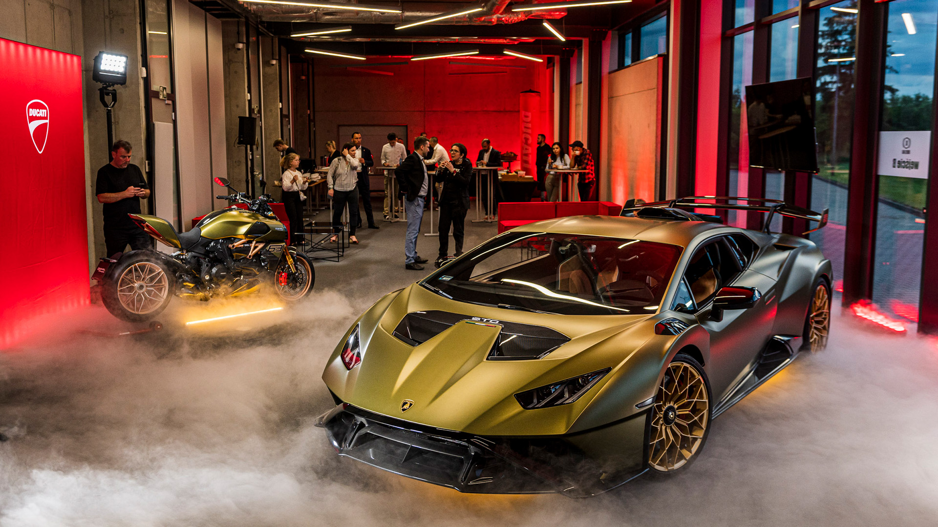 Jeden z zaledwie 630 egzemplarzy motocykla Ducati Diavel 1260 Lamborghini, efekt współpracy dwóch włoskich firm z Motor Valley, prezentowany był obok jedynego takiego na świecie Lamborghini Huracán STO, który skonfigurowany został w programie Ad Personam, pozwalającym na niemal nieograniczoną personalizację. Otrzymał między innymi przepiękny lakier Verde Gea i felgi jak w limitowanym Lamborghini Sián FKP37. Oprócz tego niesamowitego duetu Goście eventu mogli podziwiać też limitowanego do 630 sztuk Streetfightera V4 Lamborghini, a także jedną z 500 sztuk XDiavela Nera. Na tarasie budynku wyeksponowany został z kolei Bentley Continental GT Speed Edition 12, czyli limitowana do 120 egzemplarzy seria, którą Bentley uczcił zakończenie produkcji samochodów z silnikiem W12. Wyjątkowy Continental otrzymał lakier Scarab Green, który jest identyczny jak w motocyklu Ducati Diavel for Bentley, który jako gwiazda wieczoru czekał pod płachtą na odsłonięcie w kulminacyjnym momencie wieczoru.