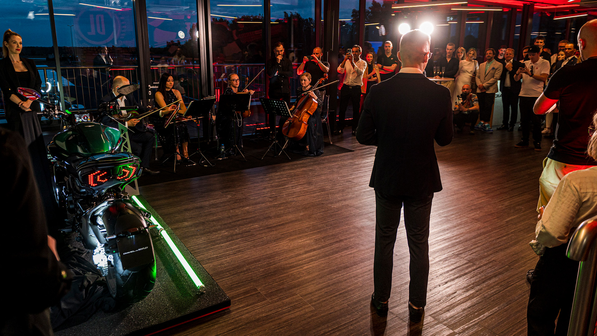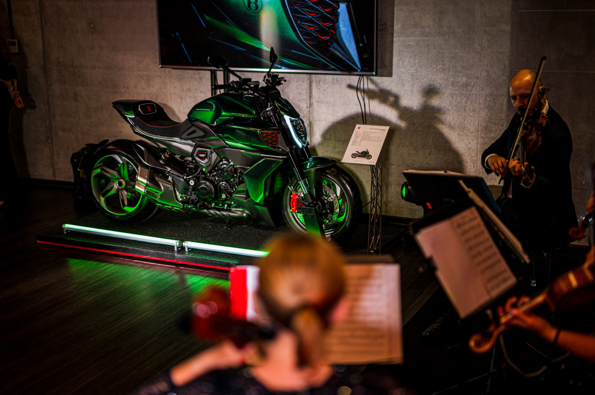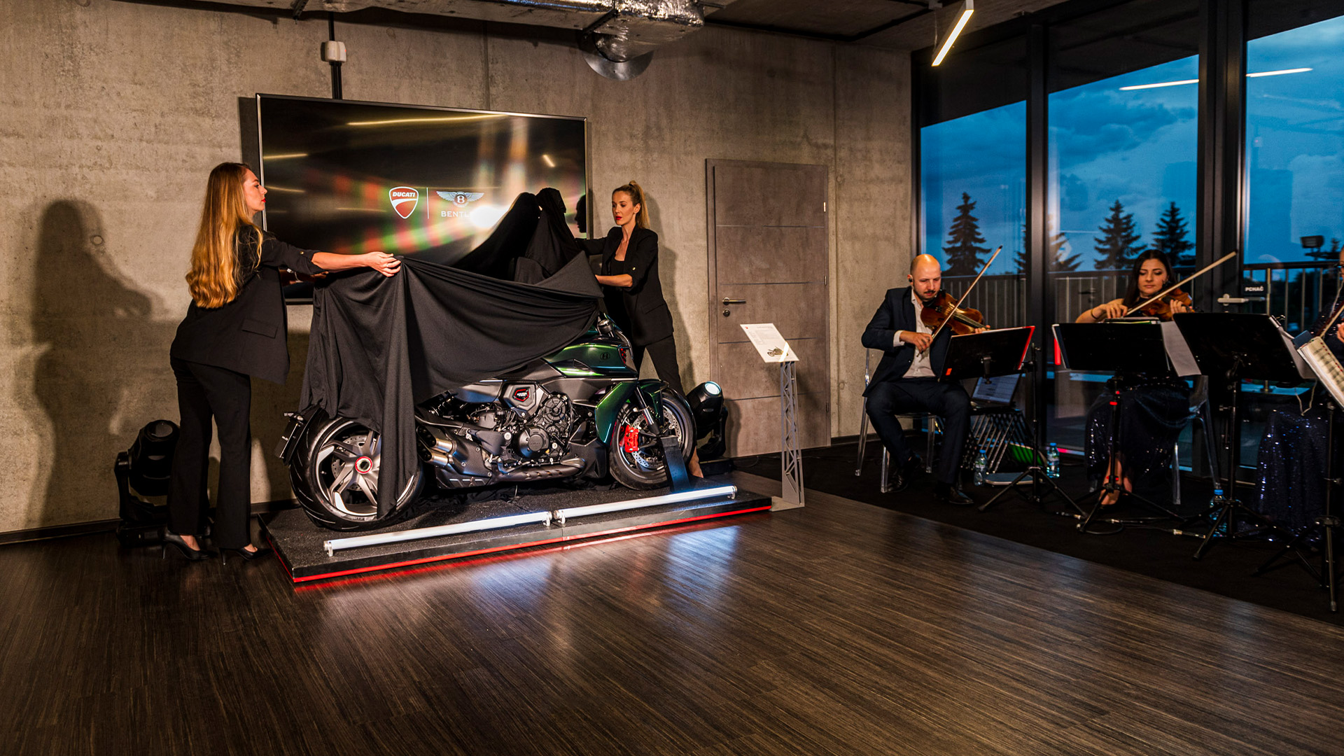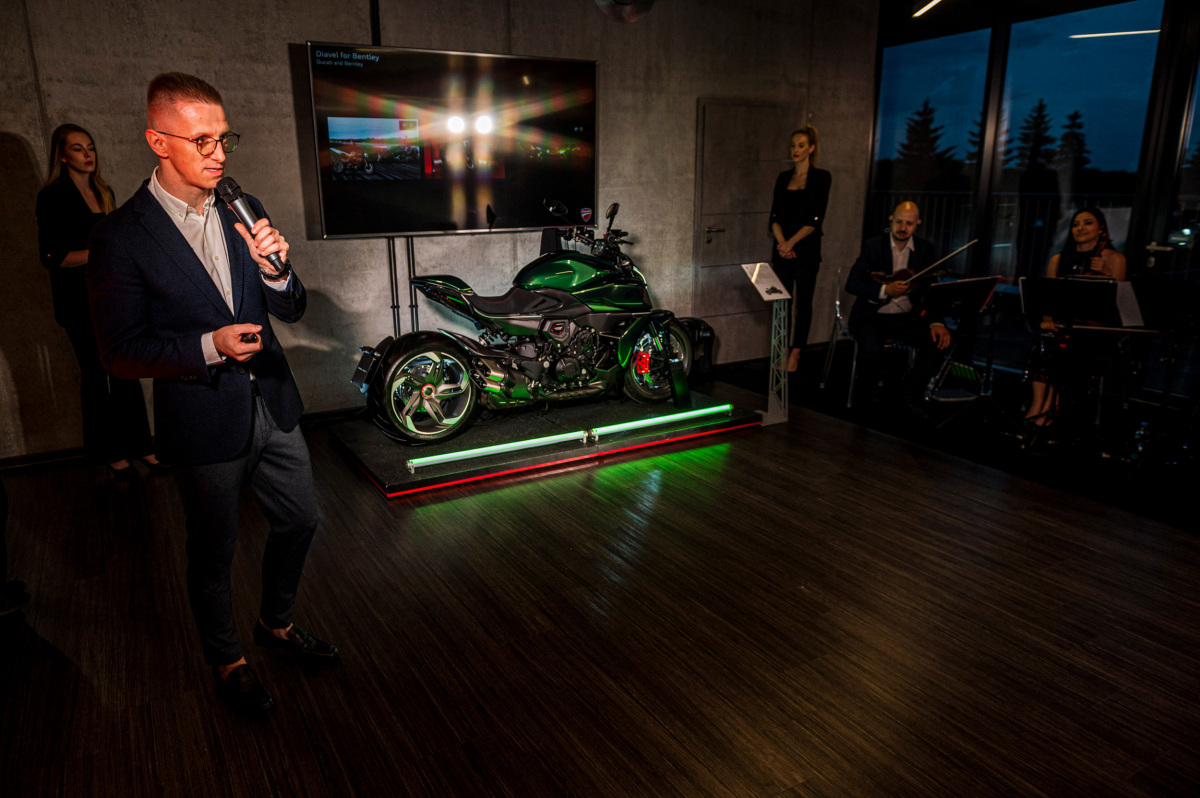 Damian Owczarek, Dyrektor Generalny Ducati Polska, rozpoczął uroczystą premierę od powitania wszystkich Gości, a także opowiedział o motocyklu Diavel for Bentley, który jest efektem pierwszej współpracy marek Ducati i Bentley. Numerowana i limitowana edycja 500 egzemplarzy Ducati Diavel V4 inspirowana jest samochodem Bentley Batur. Projekt łączy niesamowite doświadczenie Ducati w motocyklowym świecie z wyjątkową wizją ekskluzywności, kunsztu i designu w stylu Bentleya. Następnie w blasku świateł i w akompaniamencie "Czterech pór roku – Lato cz. III Presto” Antonio Vivaldiego nastąpiło odsłonięcie motocykla, na które czekali wszyscy zgromadzeni.