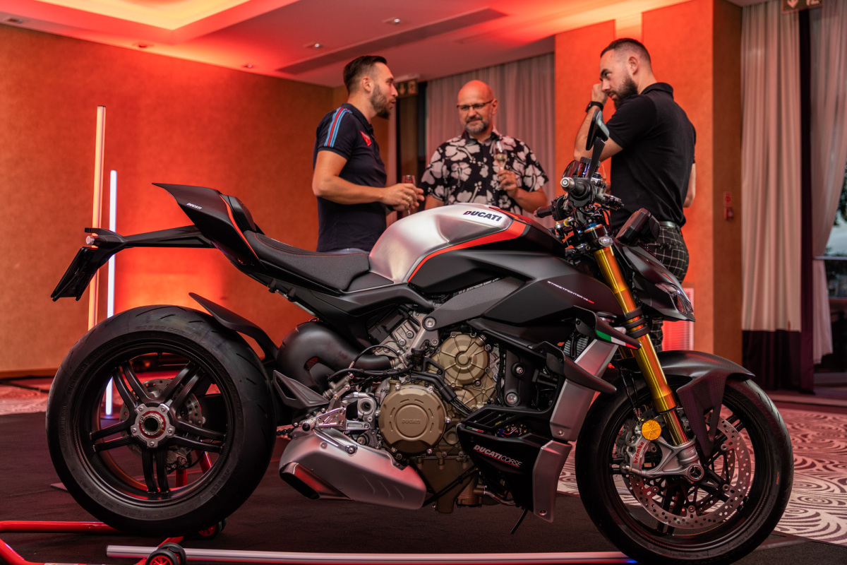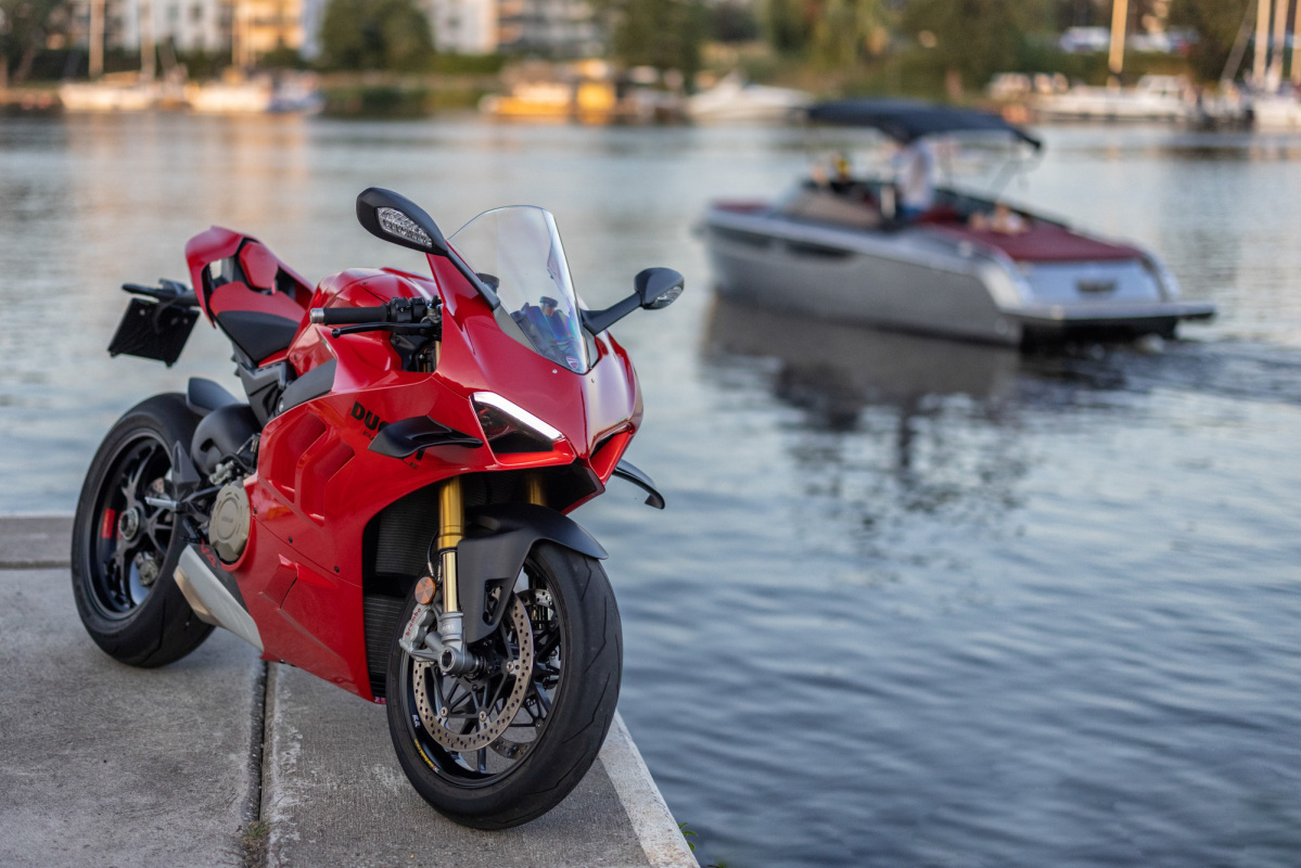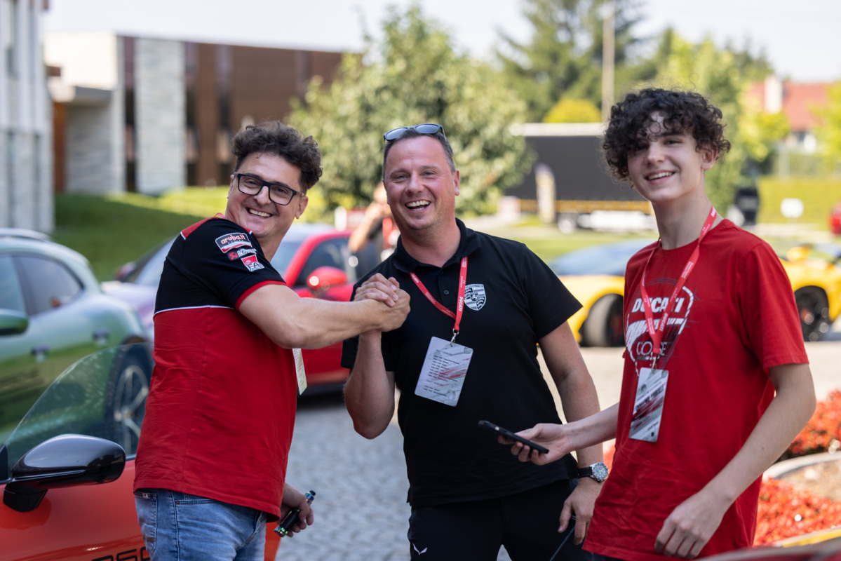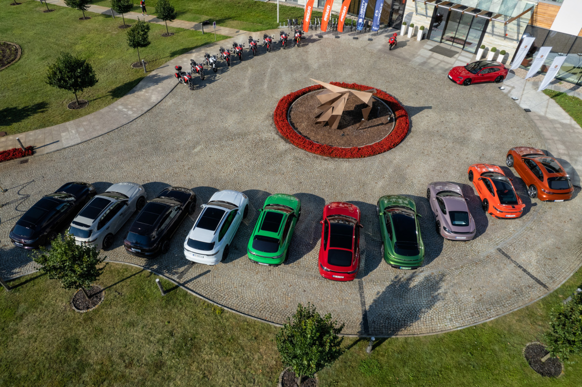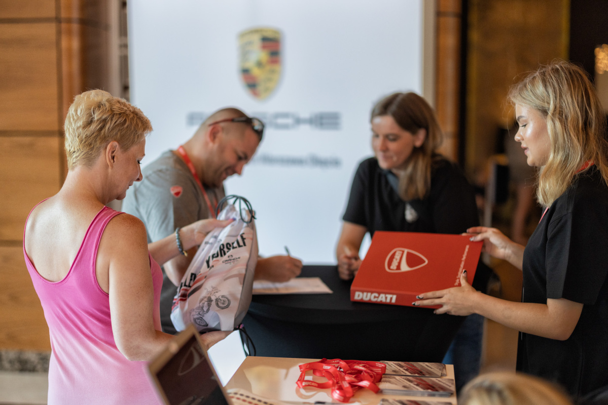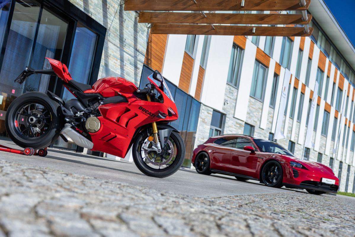 Przybywających o poranku gości wydarzenia Challenge Yourself witał widok przyspieszający bicie serca. Przed wejściem do hotelu czekały dwa rzędy lśniących maszyn, gotowych by eksplorować okoliczne trasy. Z jednej strony stanęło osiem egzemplarzy modelu Multistrada V4 S, Multistrada V4 Pikes Peak, a także Panigale V4 S. Z drugiej natomiast Porsche 718 Cayman GTS 4.0, 911 Carrera S, Panamera GTS i Panamera 4 E-Hybrid Sport Turismo, Macan i Macan S, Cayenne S i Turbo oraz dwa Taycany w wersjach GTS Sport Turismo i Turbo S Cross Turismo. Łącznie ponad 6500 koni mechanicznych! To jednak nie wszystko, bowiem do zestawienia należałoby dodać kolejnych 350 koni generowanych przez silnik V8 łodzi Cranchi, która czekała zacumowana przy pomoście z drugiej strony hotelu.
