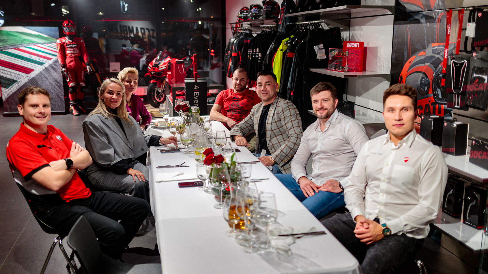 Po wydaniu czterech motocykli, dwóch Panigale V4 Bagnaia 2022 World Champion Replica i dwóch Panigale V4 Bautista 2022 World Champion Replica, szczęśliwi właściciele wraz z załogą łódzkiego salonu i przedstawicielami Ducati Polska usiedli do wspólnego stołu, aby uczcić ten wyjątkowy moment uroczystą kolacją. Cieszymy się, że tak unikalne pojazdy zasilą prywatne kolekcje pasjonatów z Polski. Serdecznie gratulujemy!