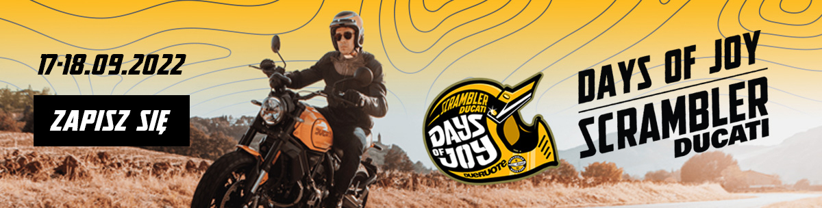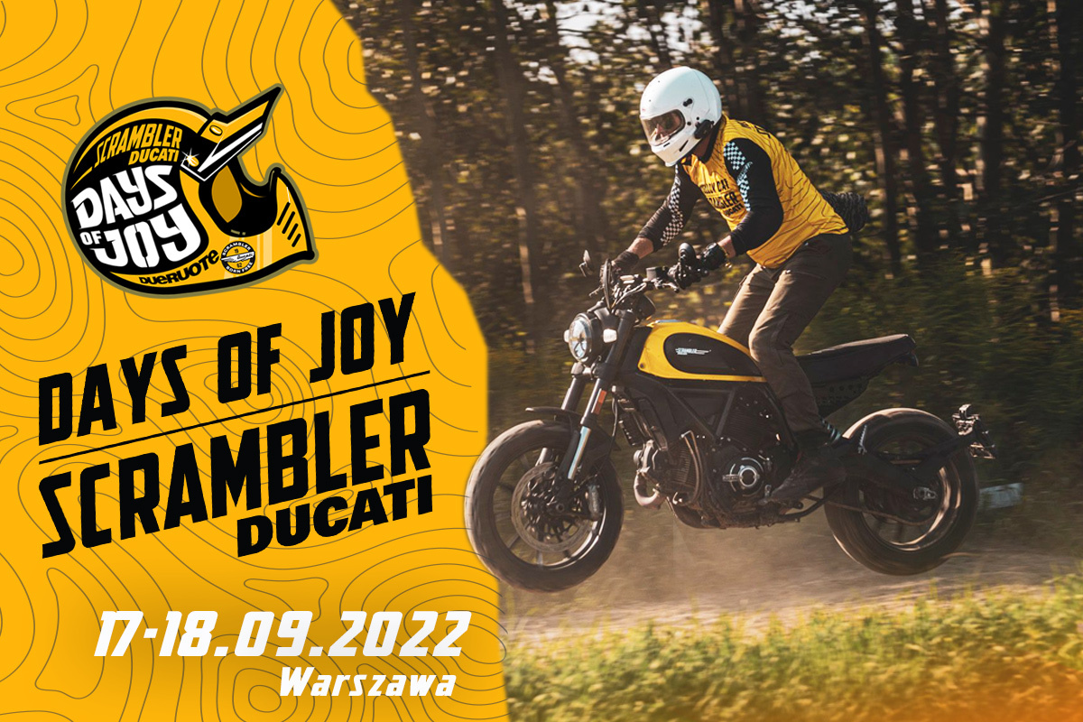 Ducati Scrambler Days of Joy to kolejna edycja imprezy dla właścicieli motocykli Scrambler, Café Racer, Street Tracker, Brat Style i wszystkich ciekawych customów. W tym roku powielamy sprawdzoną formułę zeszłorocznego Ducati Scrambler Yellow Day, zmieniając nieco atrakcje i umożliwiając uczestnikom nocowanie w namiotach na terenie obiektu, który będzie docelową bazą wydarzenia.